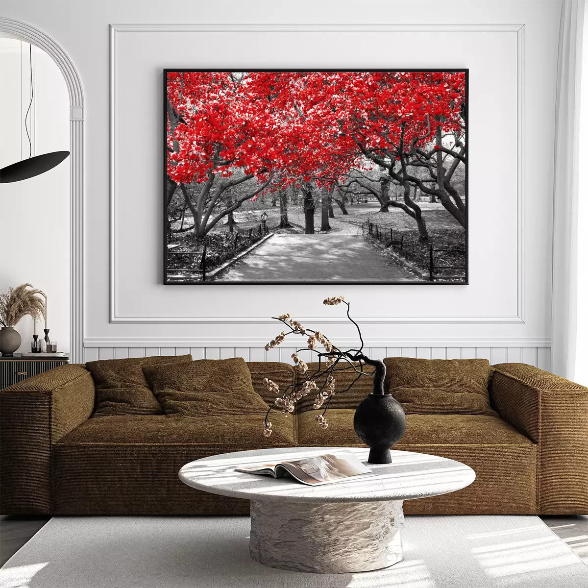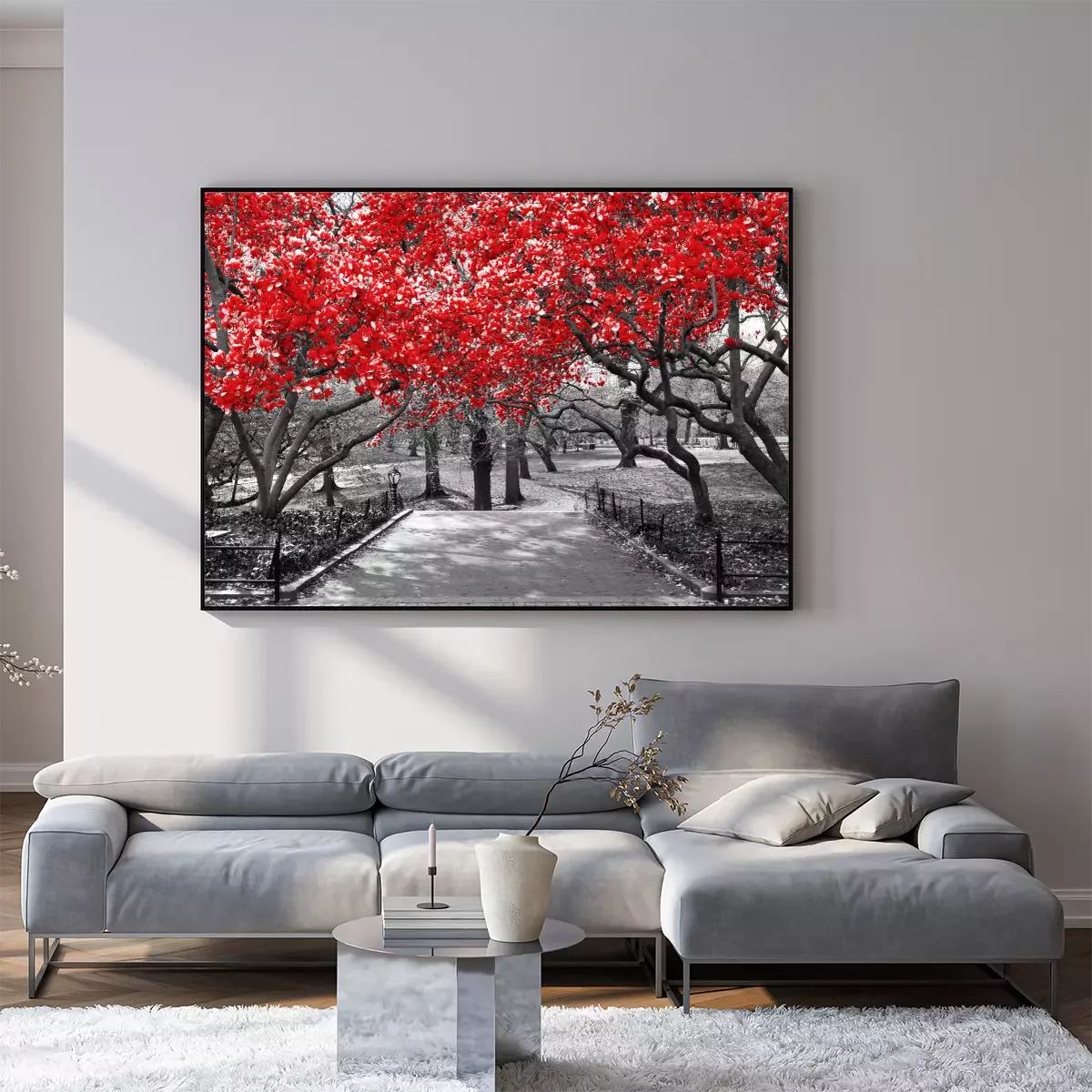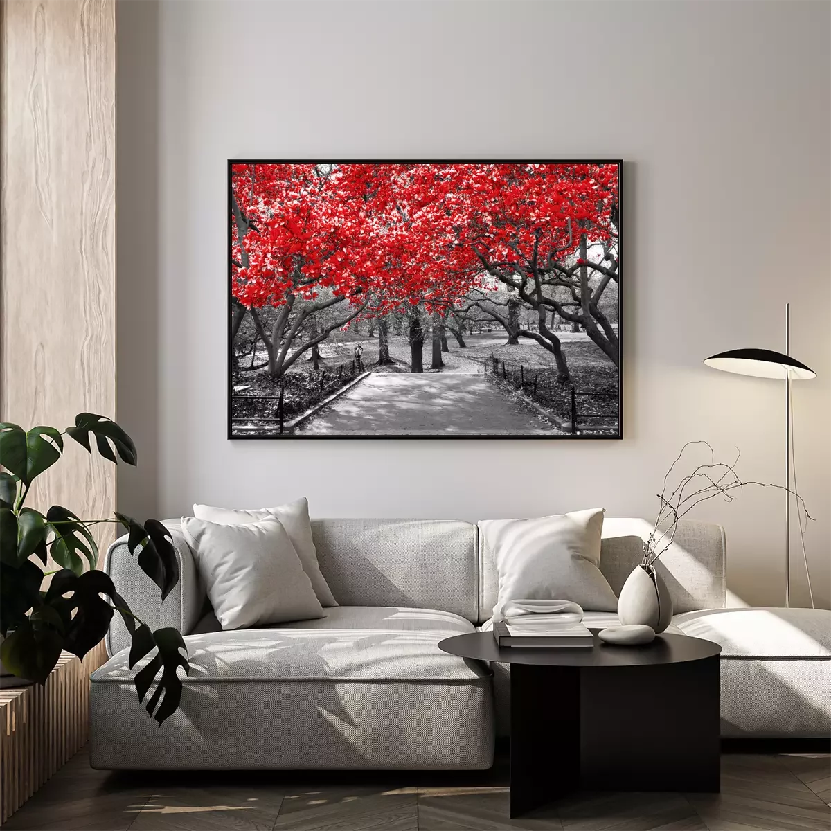 Poster : Couronnes d'arbres rouges sur fond noir et blanc