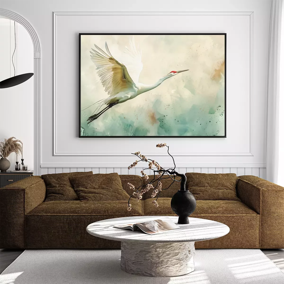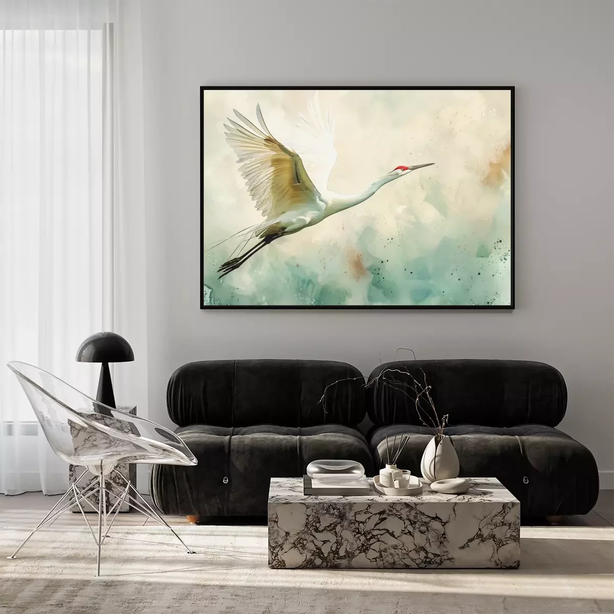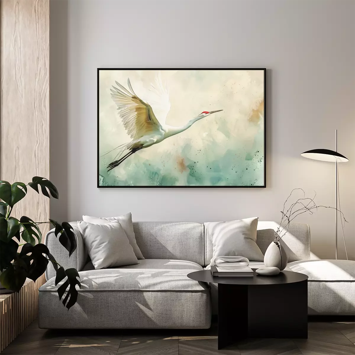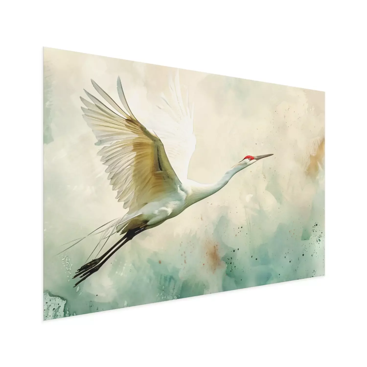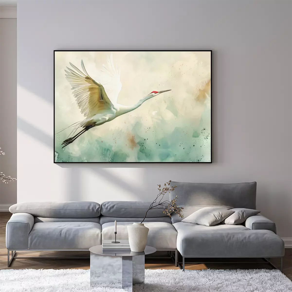 Crane in flight - bird painted in watercolor on a greenish textured background