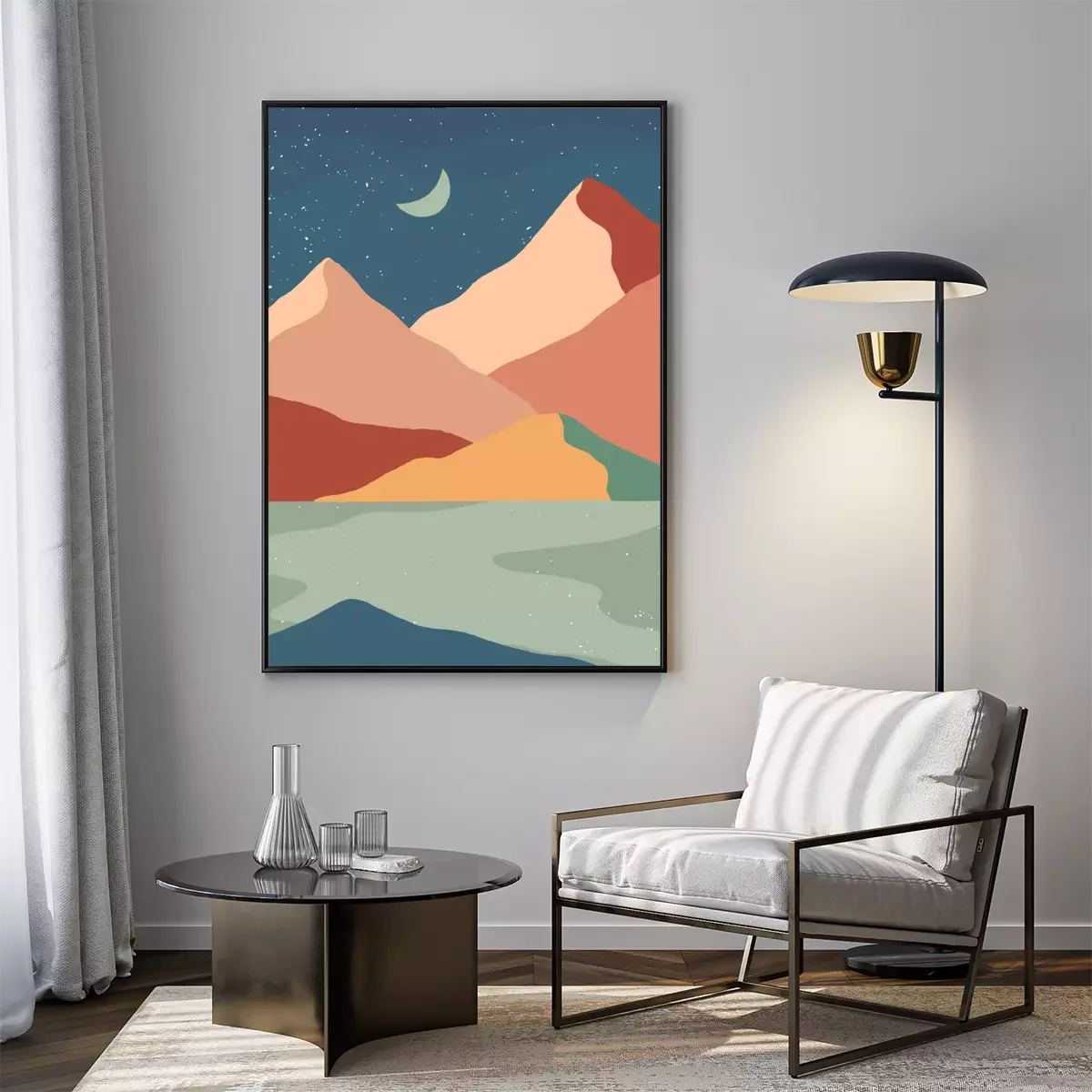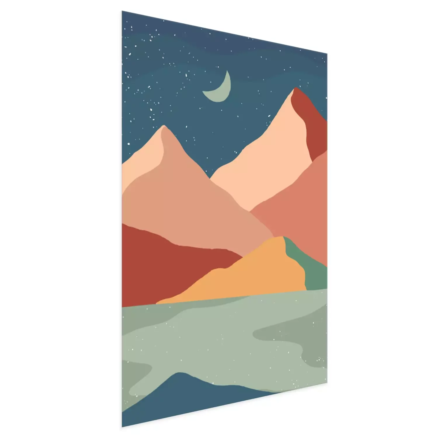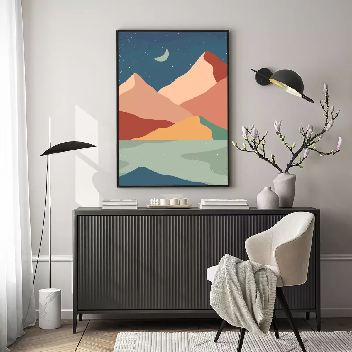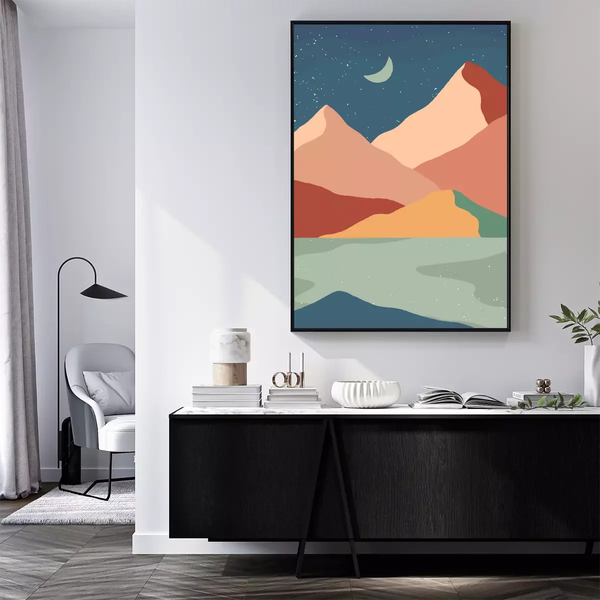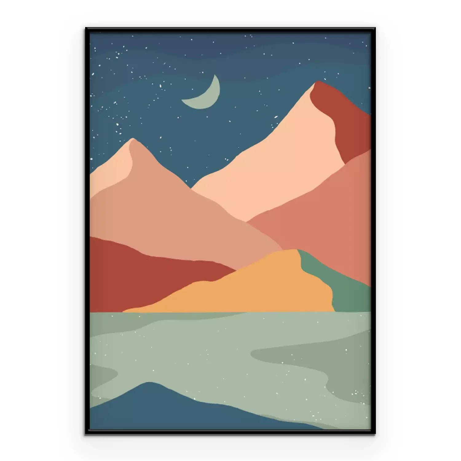 Poster : Creative abstract mountain landscape background.Mid century modern vector illustration with hand drawn mountains; sea or river; sky and moon.Trendy contemporary design.Futuristic wall art decor.