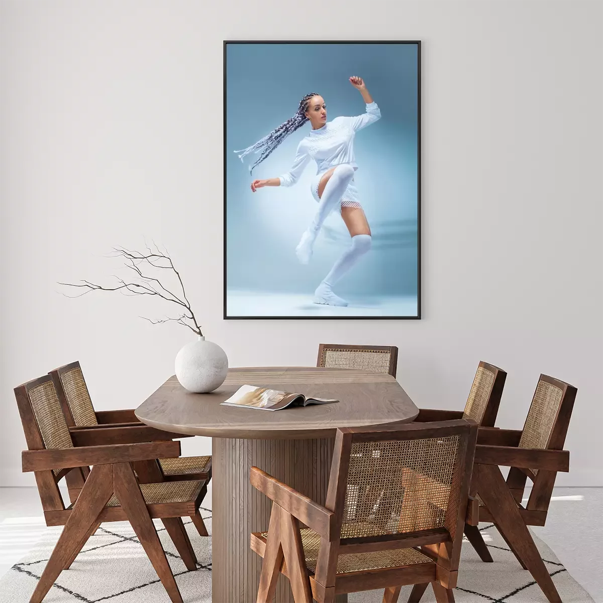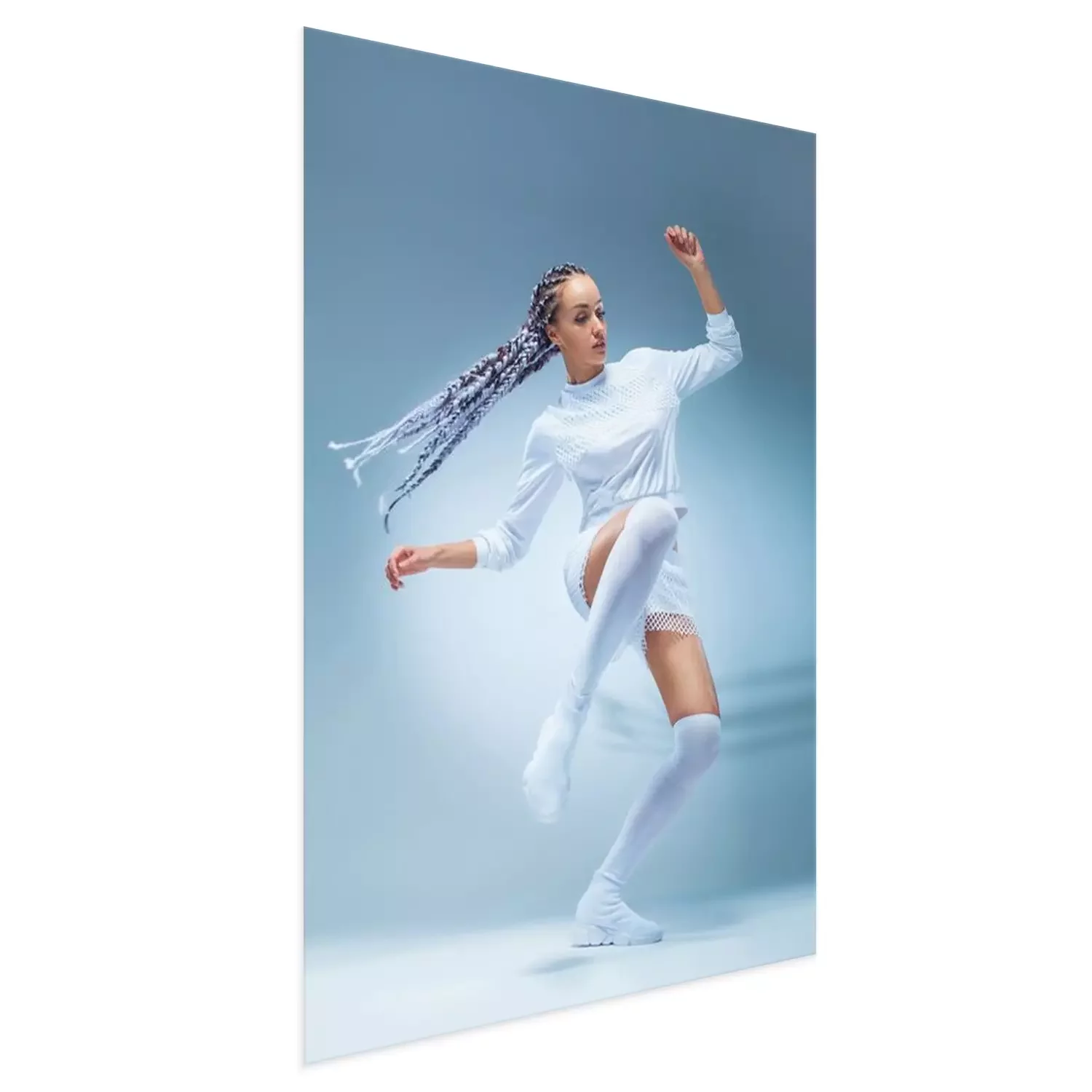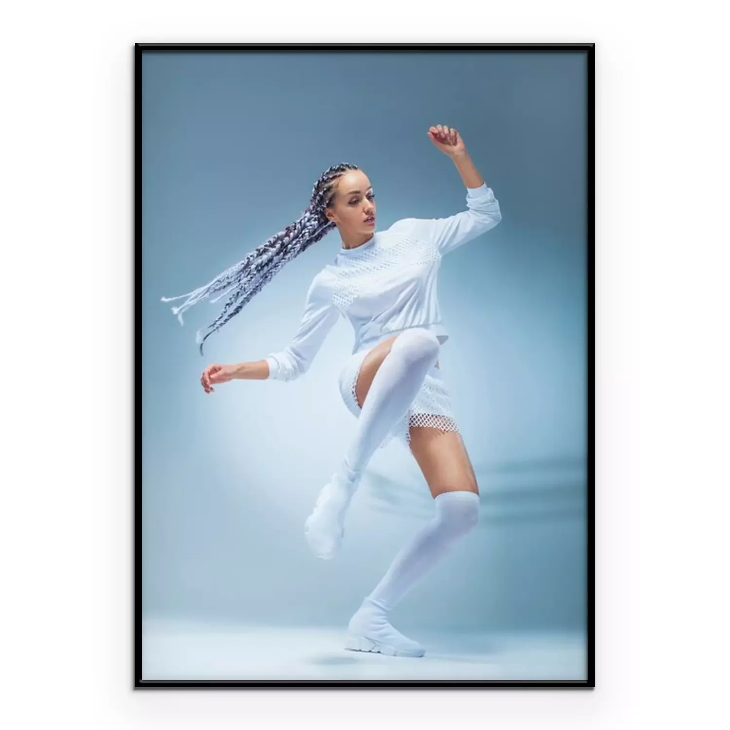 Poster  Danseuse de fille fitness excité attrayant en danse de sportwear isolé sur fond bleu. Concept de mode et de style de vie.