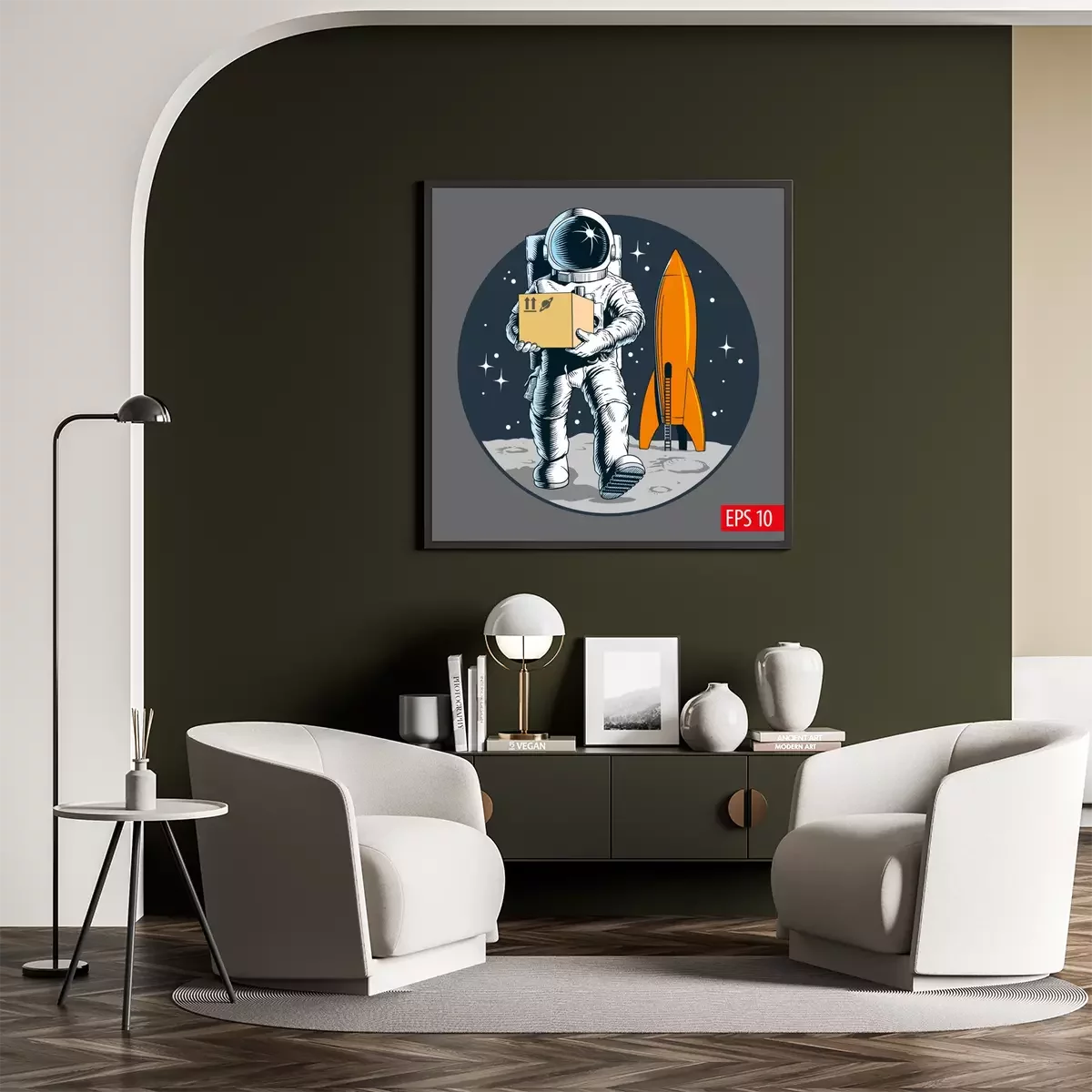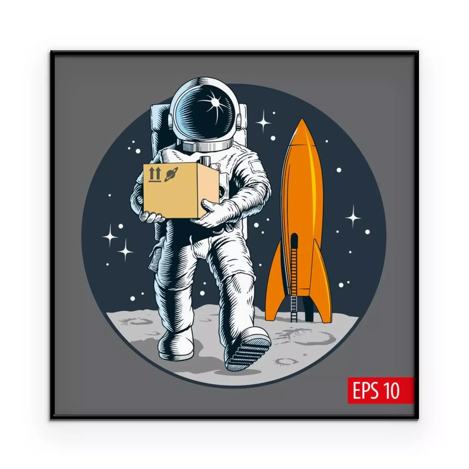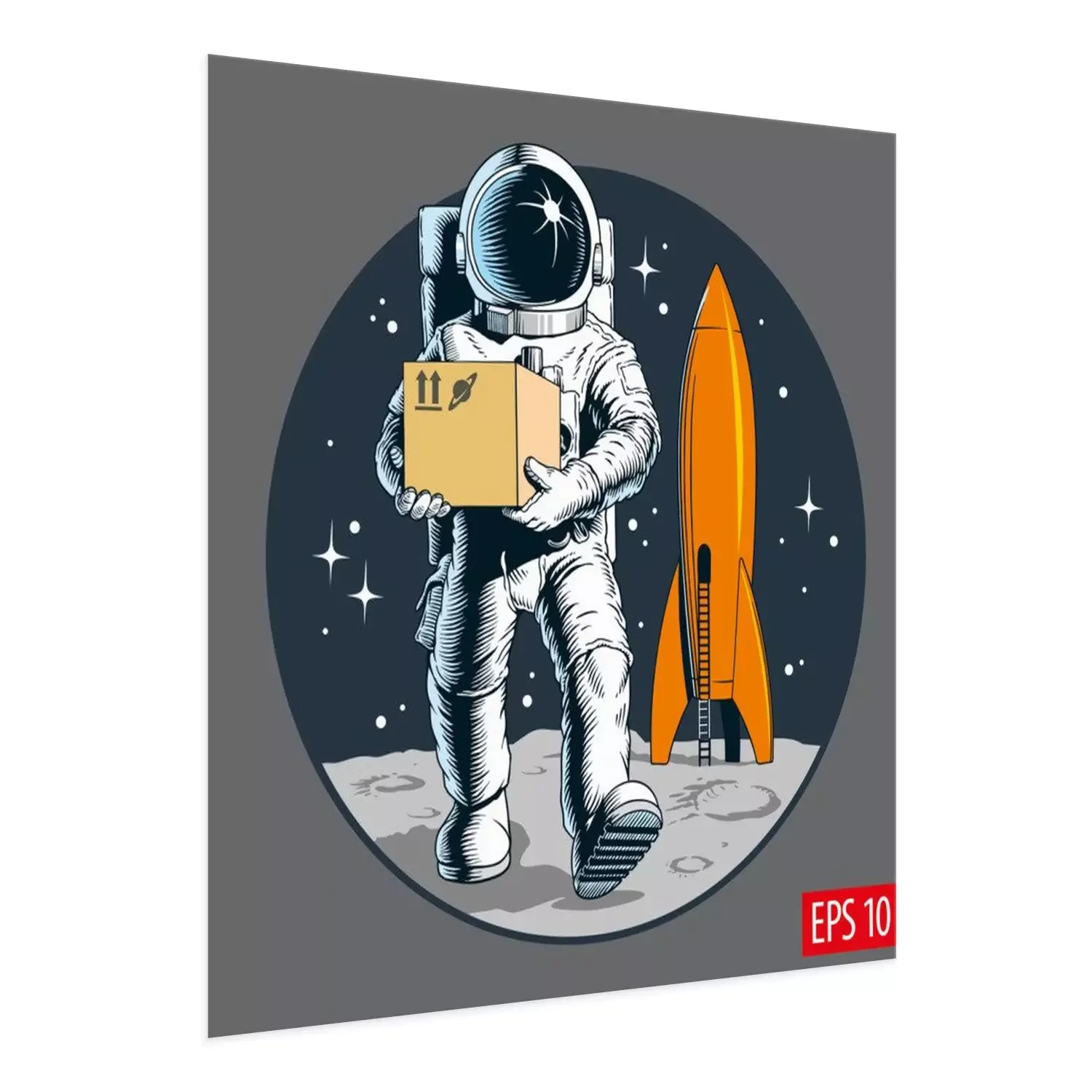 Poster  Delivery service, astronaut holding package or cardboard box. Space colonization. Shipping cargo to space. Vector illustration.