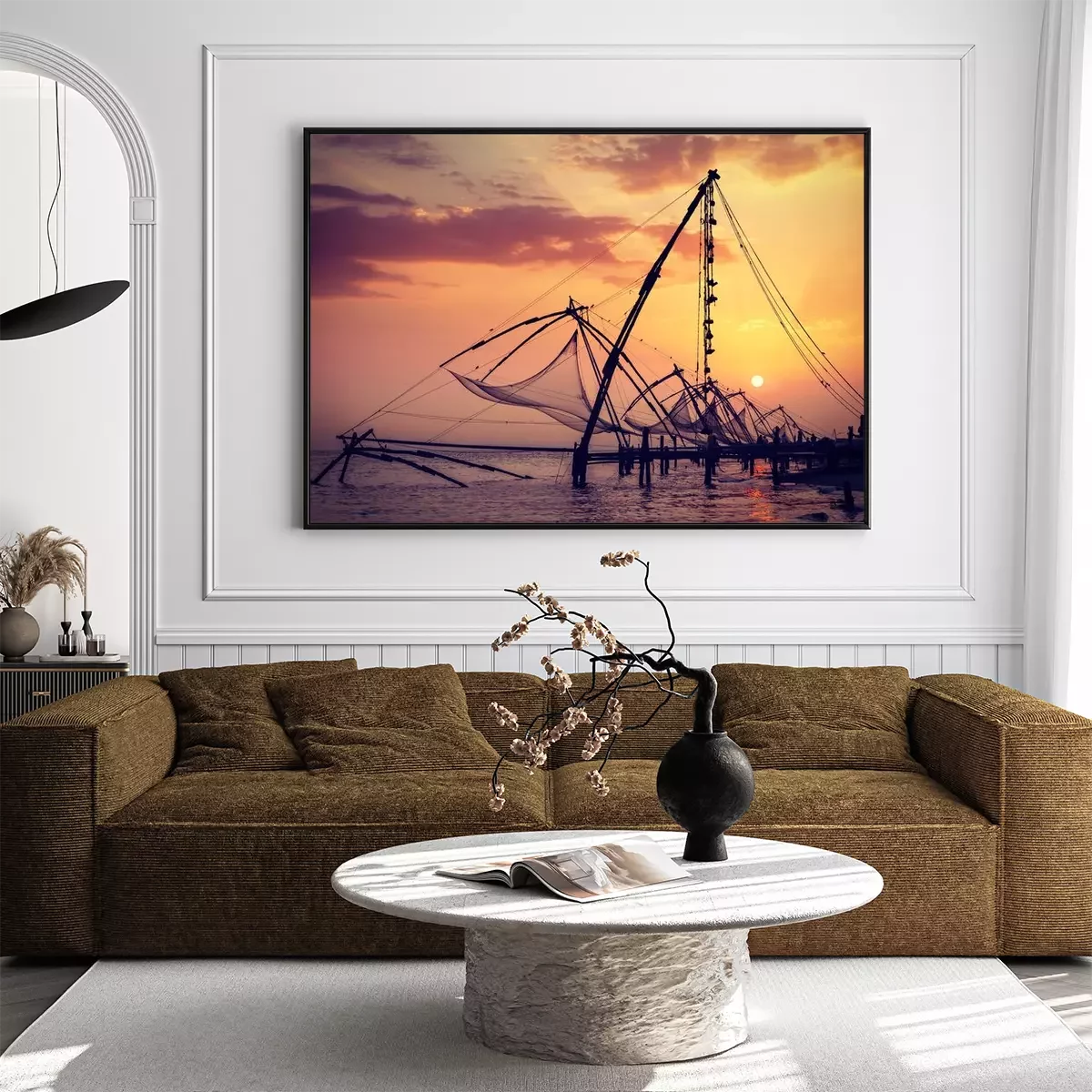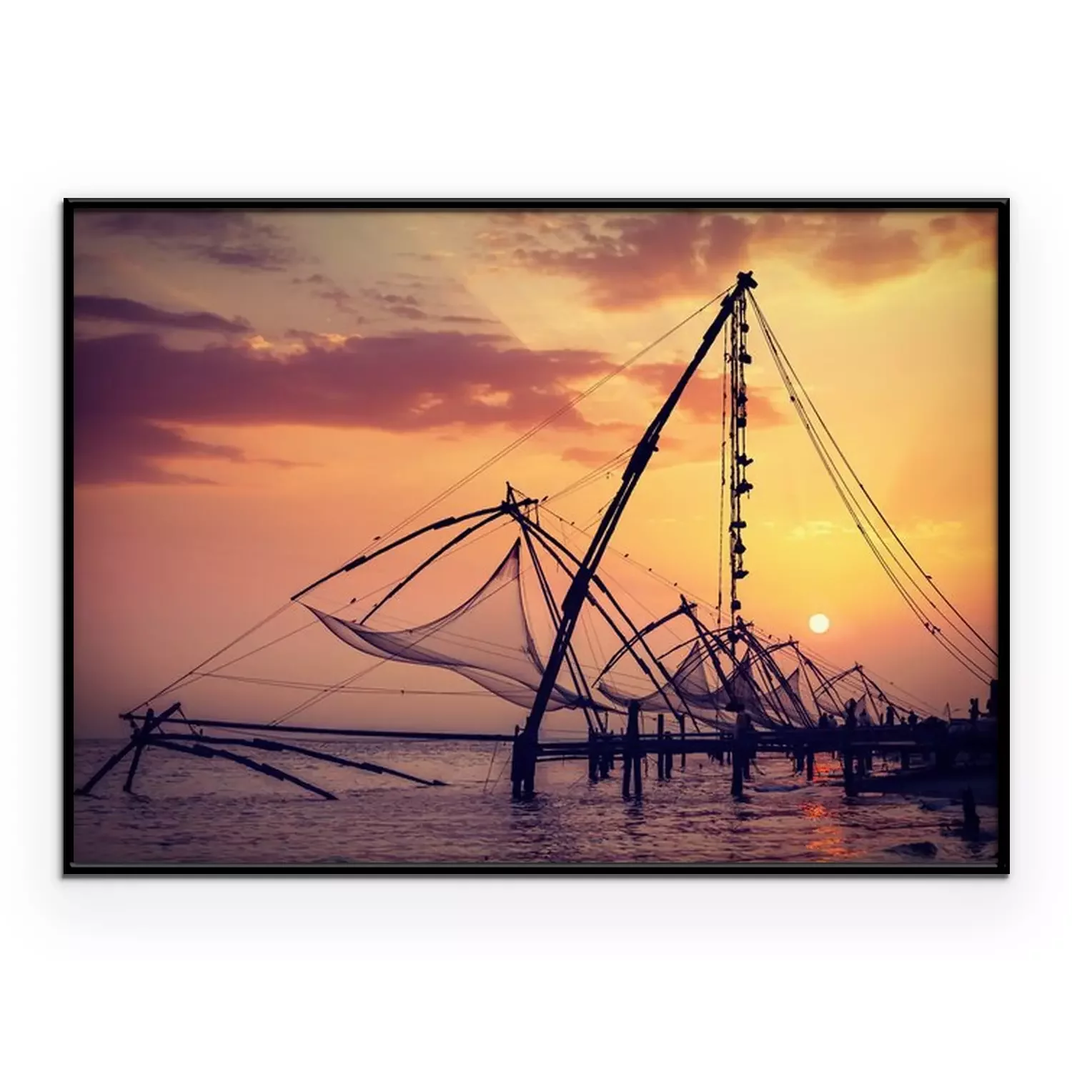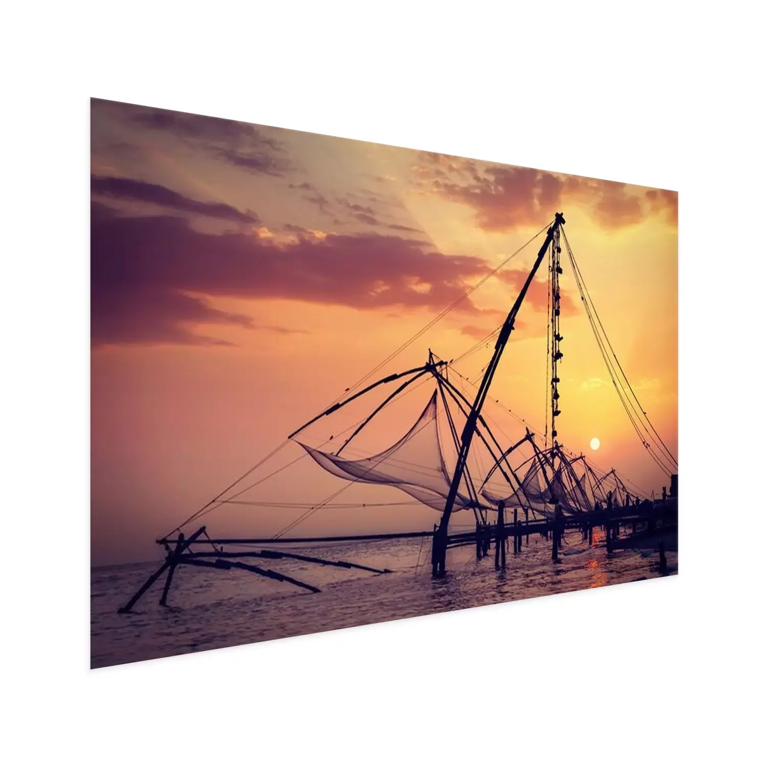 Poster  Des filets de pêche chinois sur le coucher du soleil. Kochi, Kerala, Inde