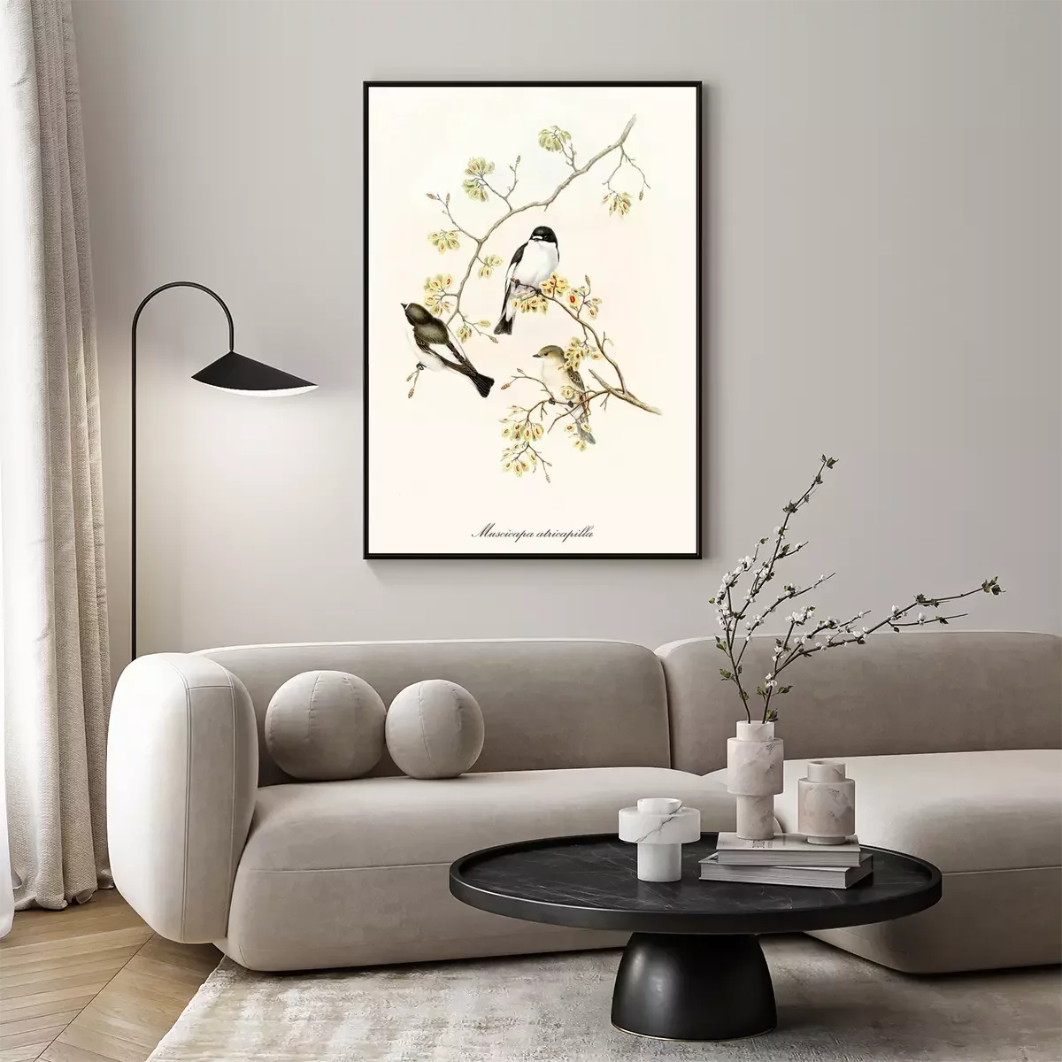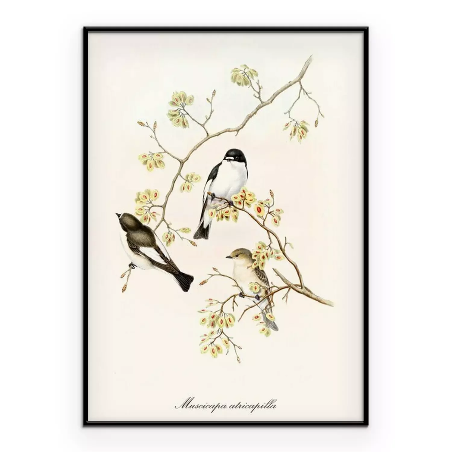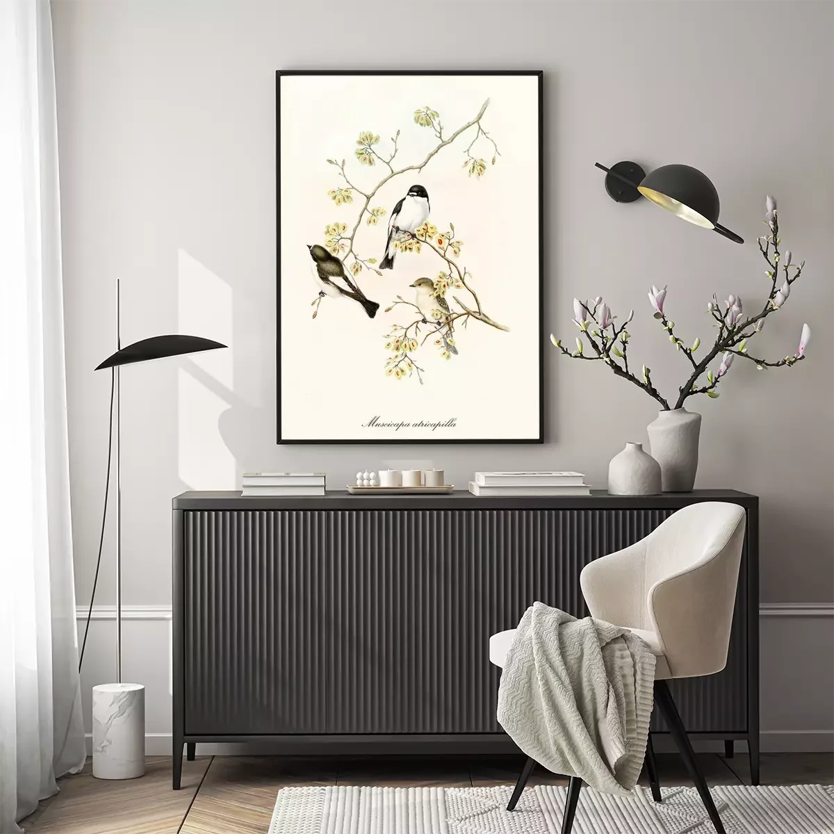 Poster : Dessin avec des oiseaux posés sur des branches couvertes de fleurs