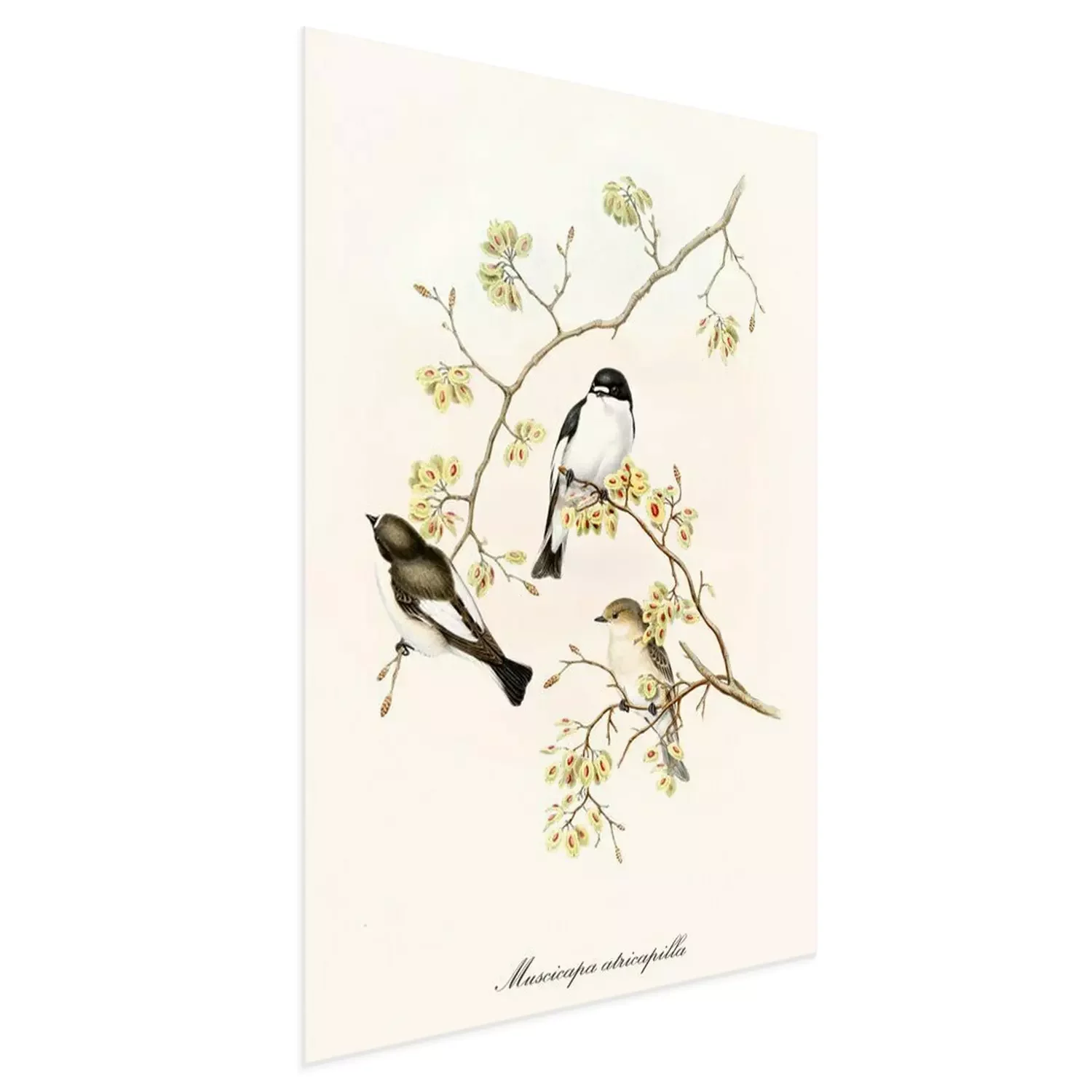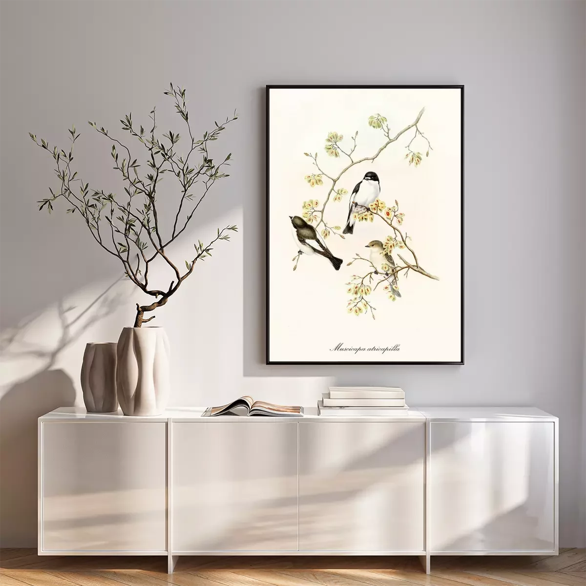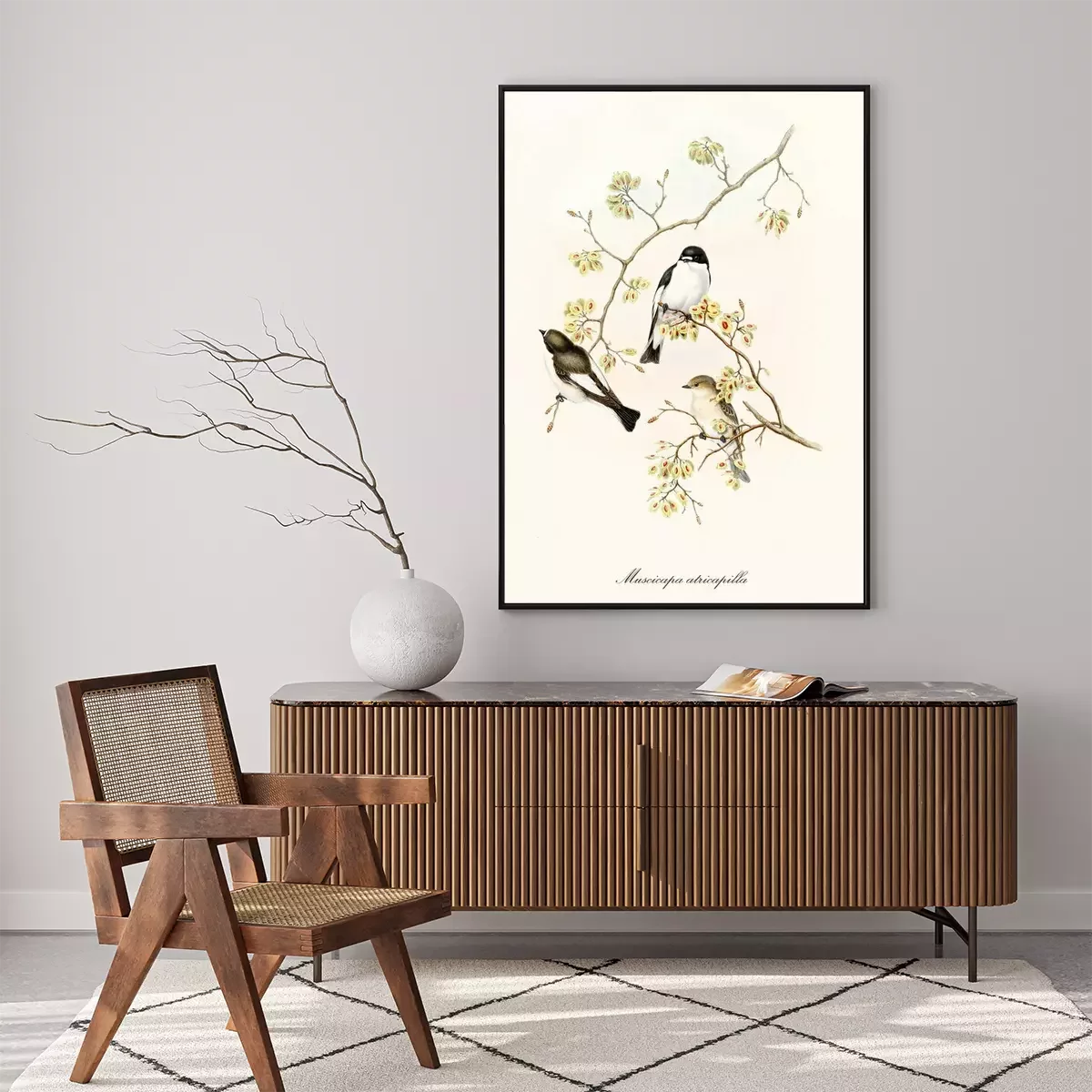Poster : Dessin avec des oiseaux posés sur des branches couvertes de fleurs