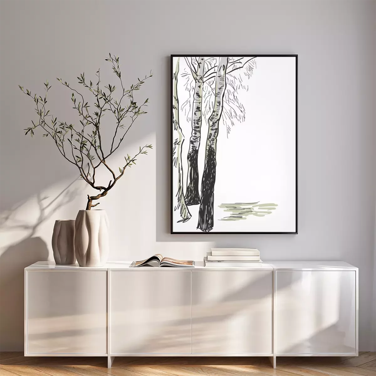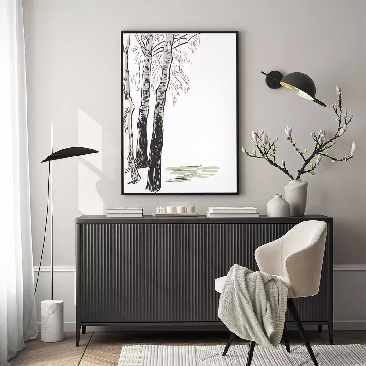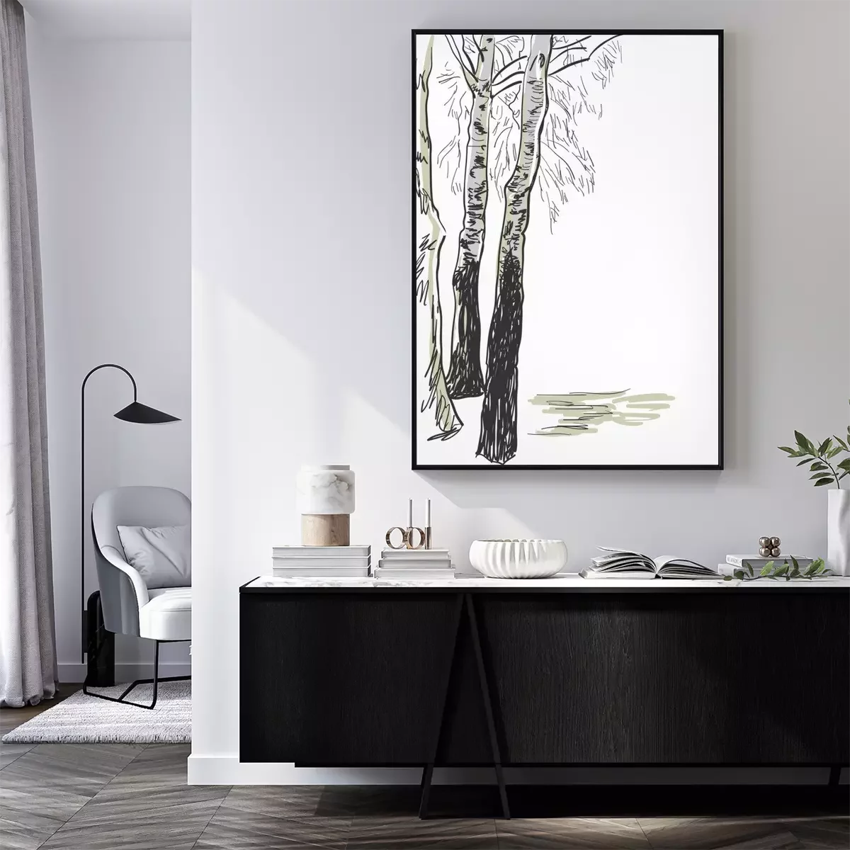 Poster : Dessin en noir et blanc de bouleaux