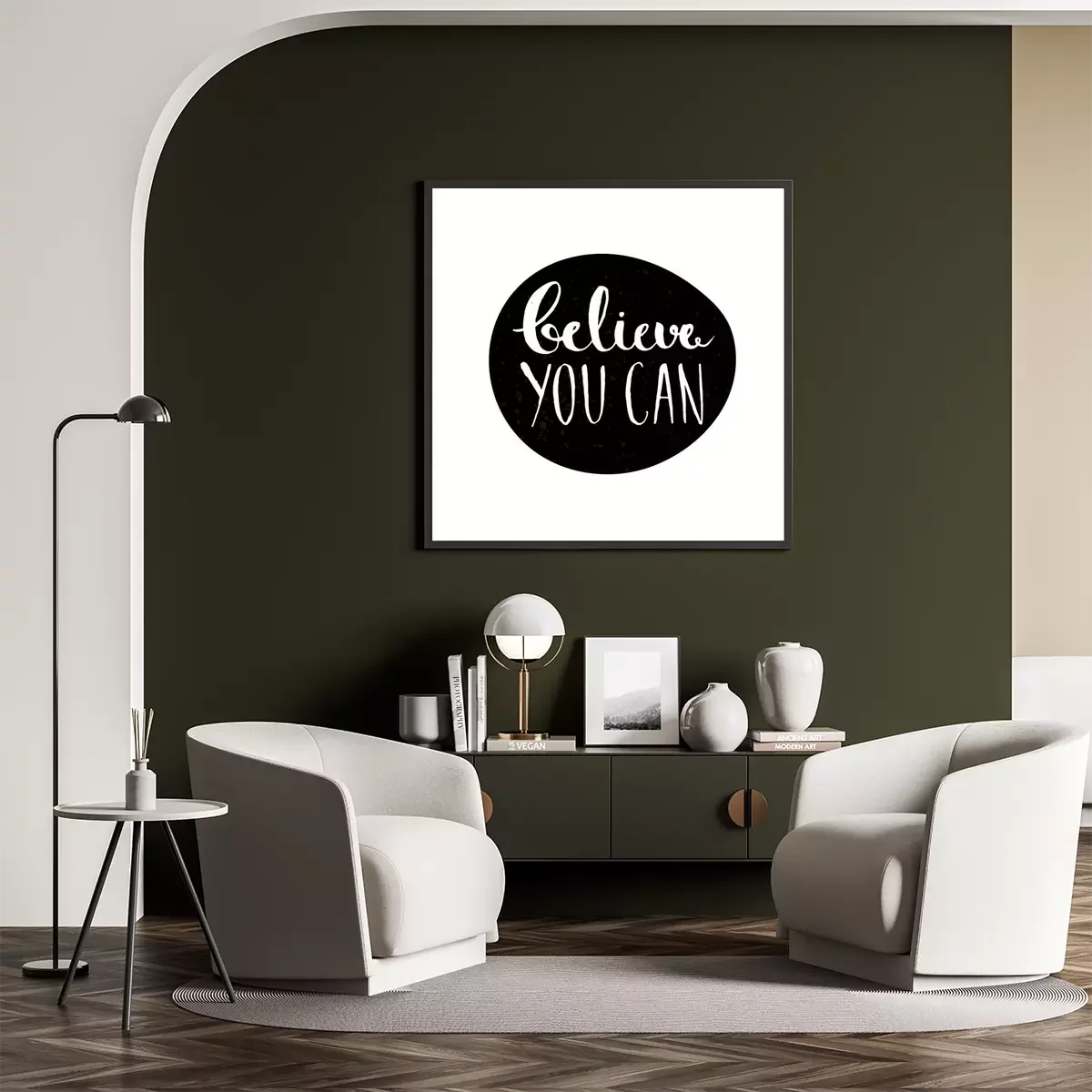 Un slogan simple sur fond artistique