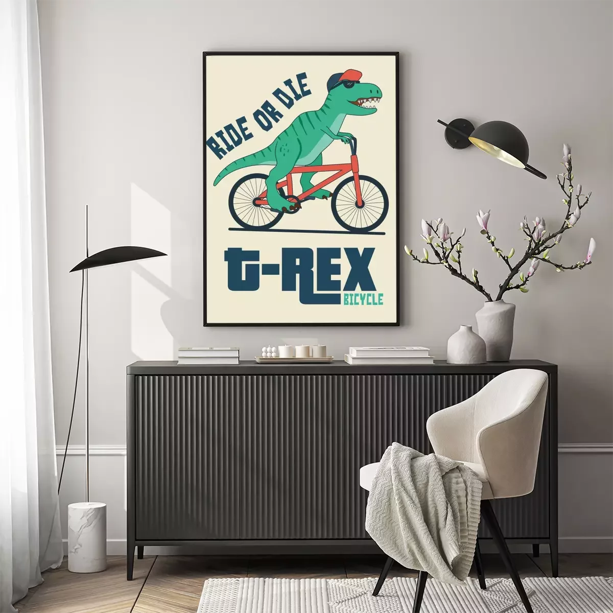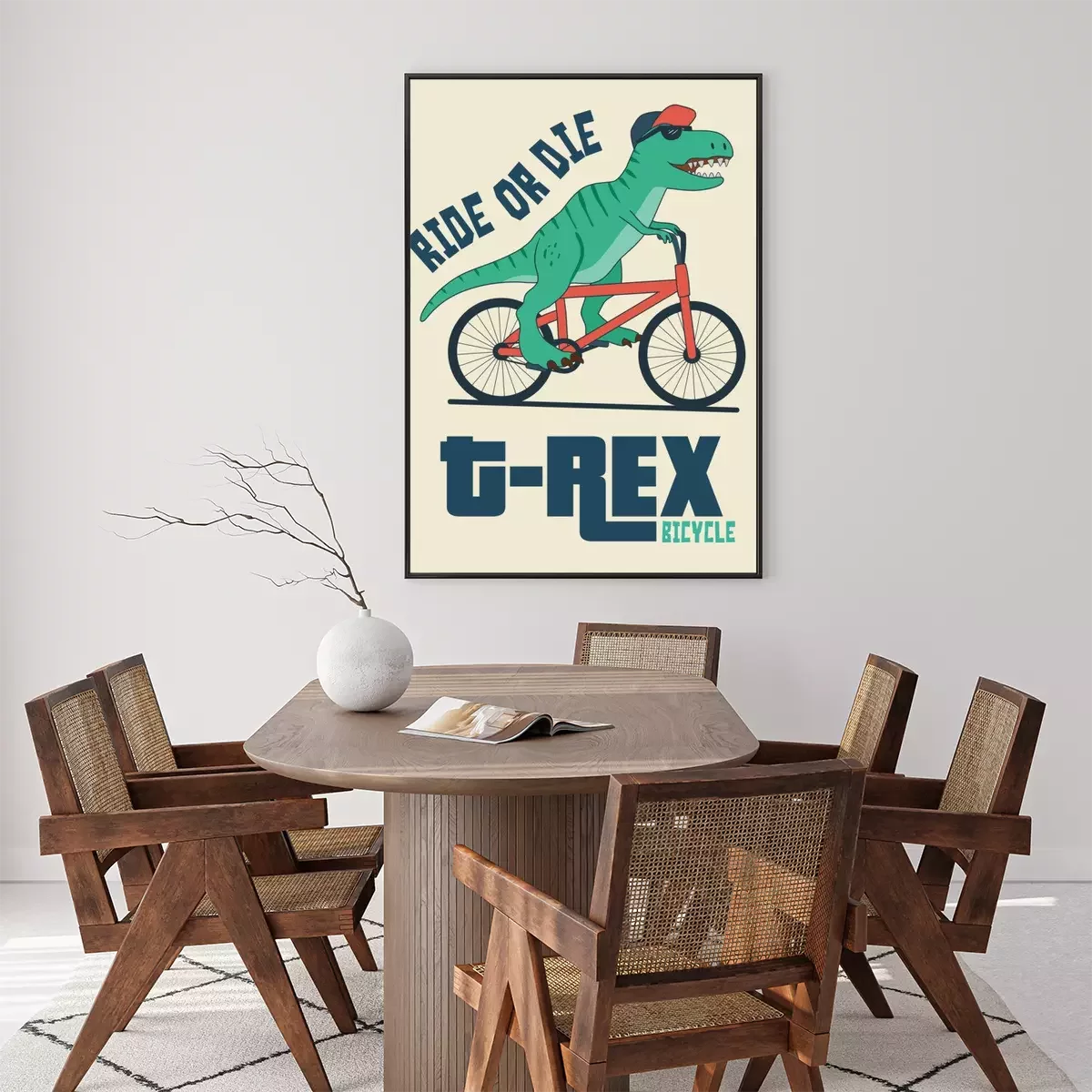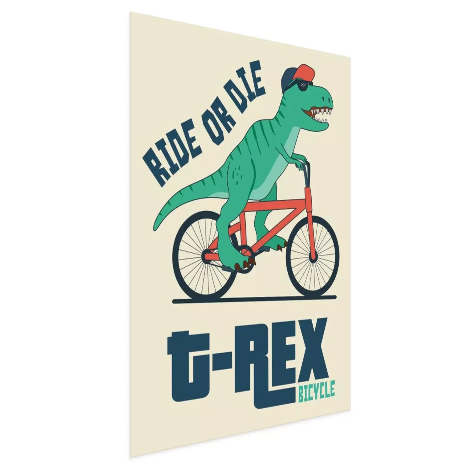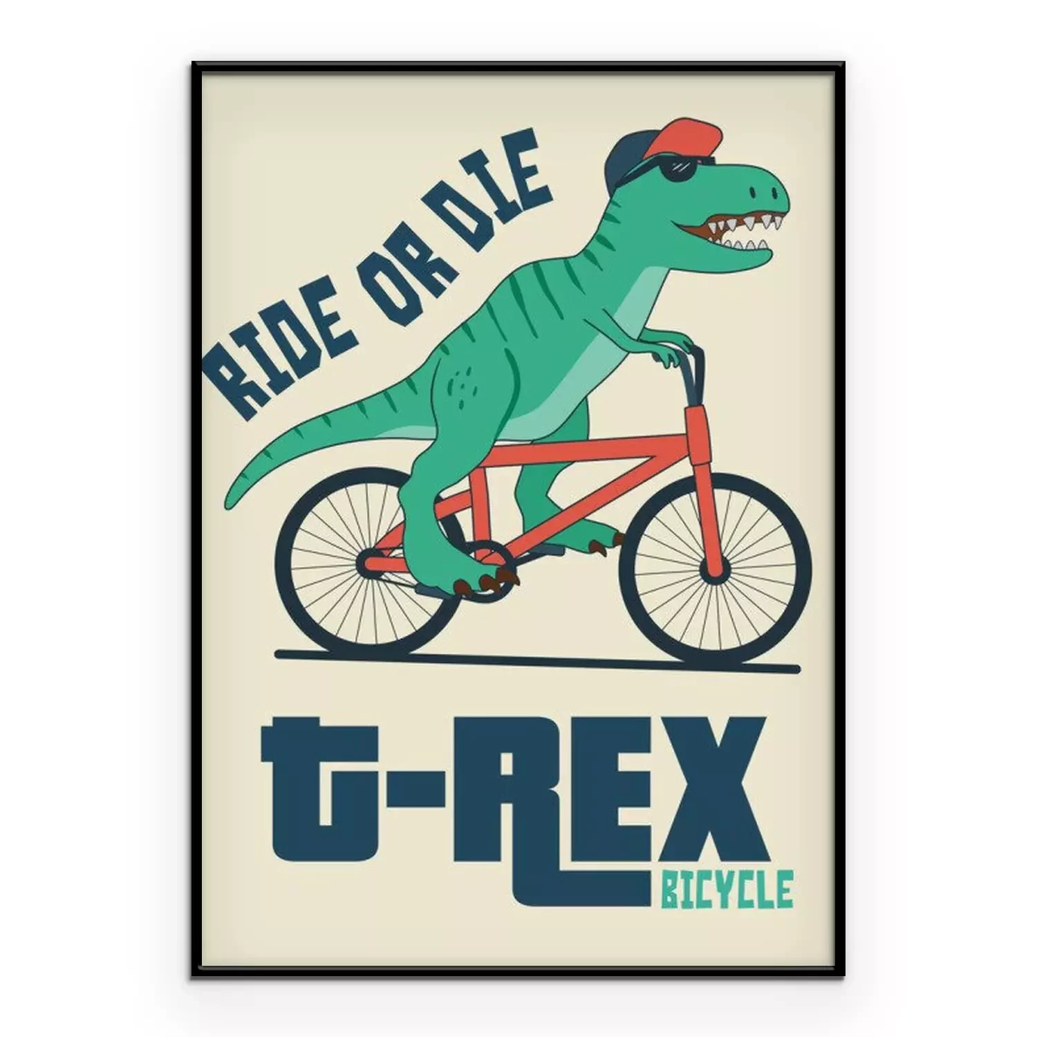 Poster  Dinosaure à lunettes noires sur un vélo rouge