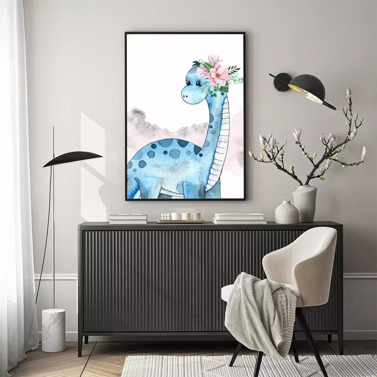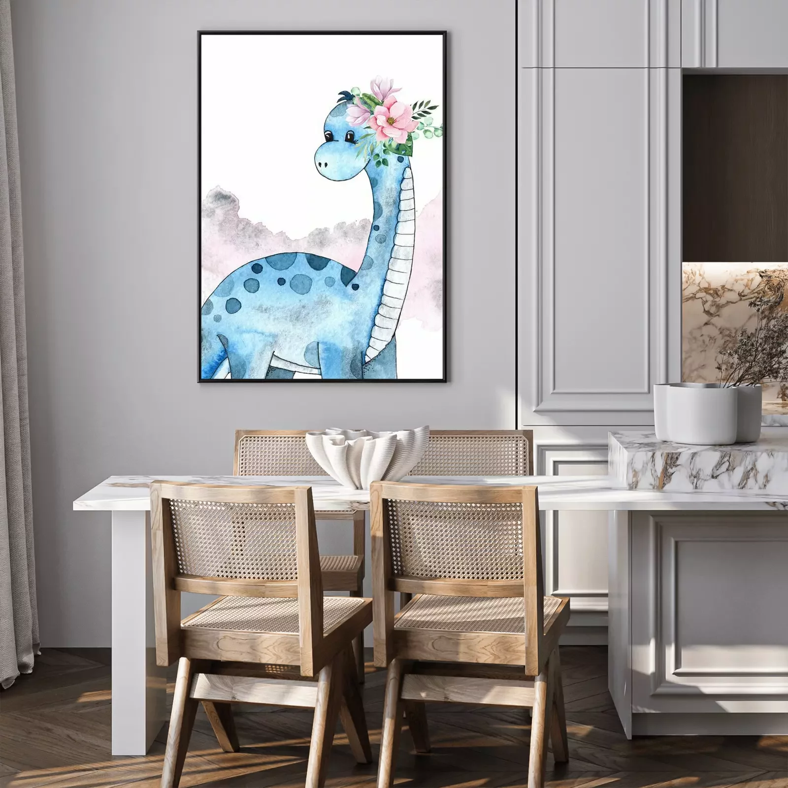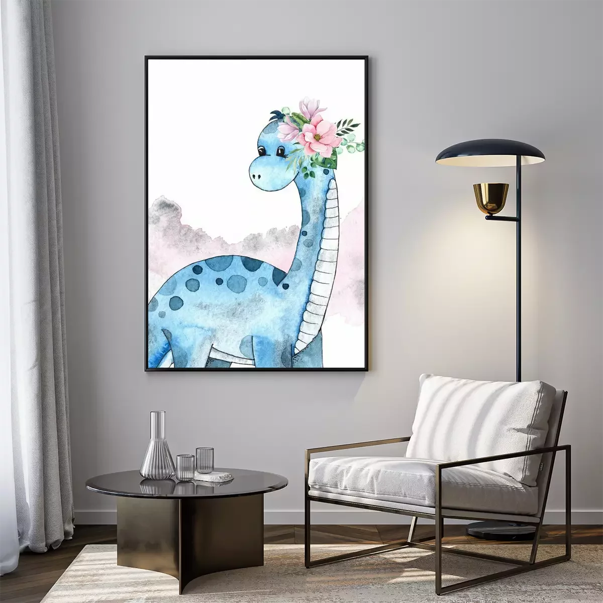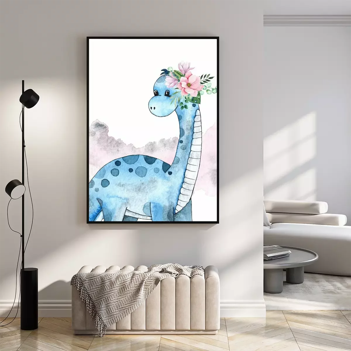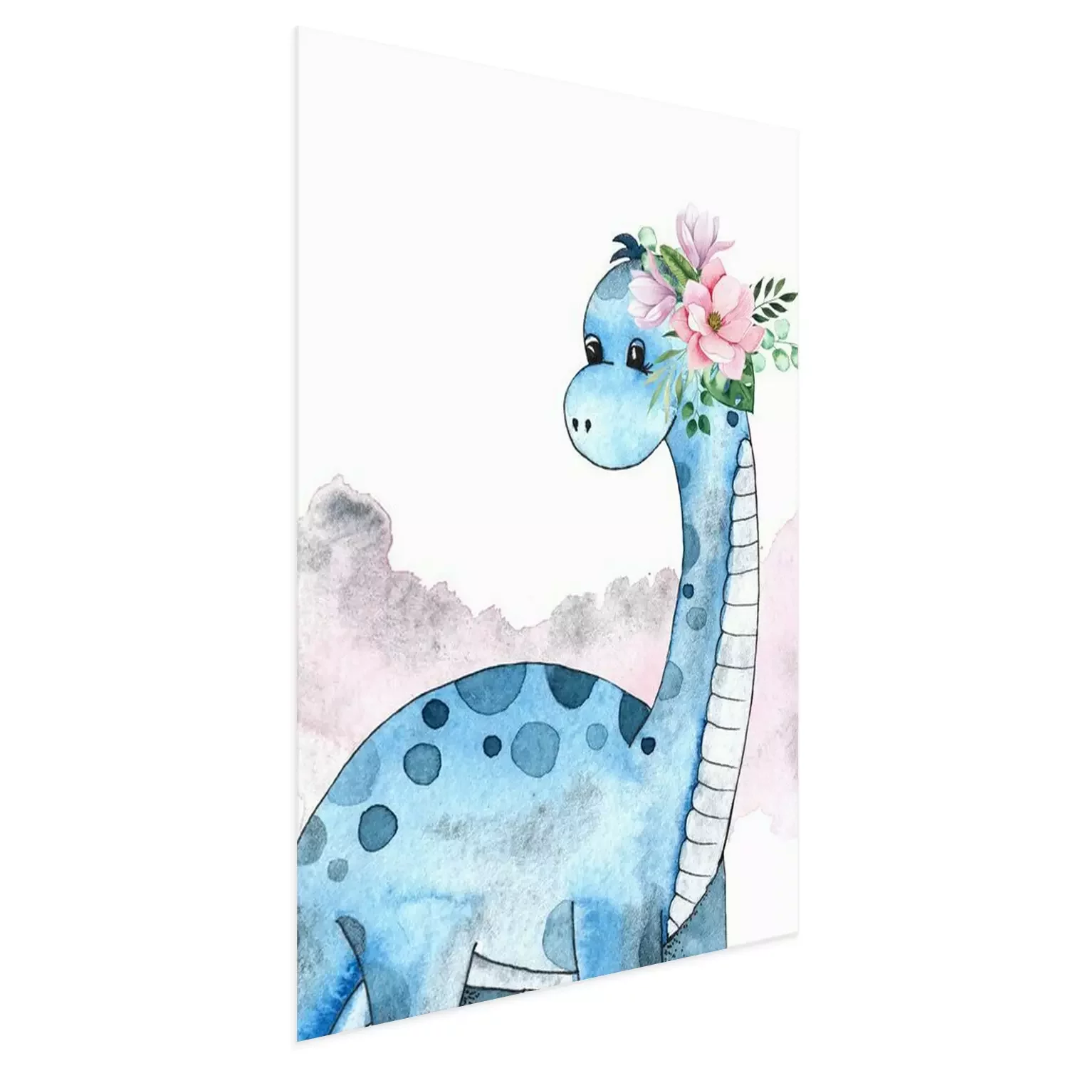 Poster  Dinosaure bleu avec une couronne de fleurs