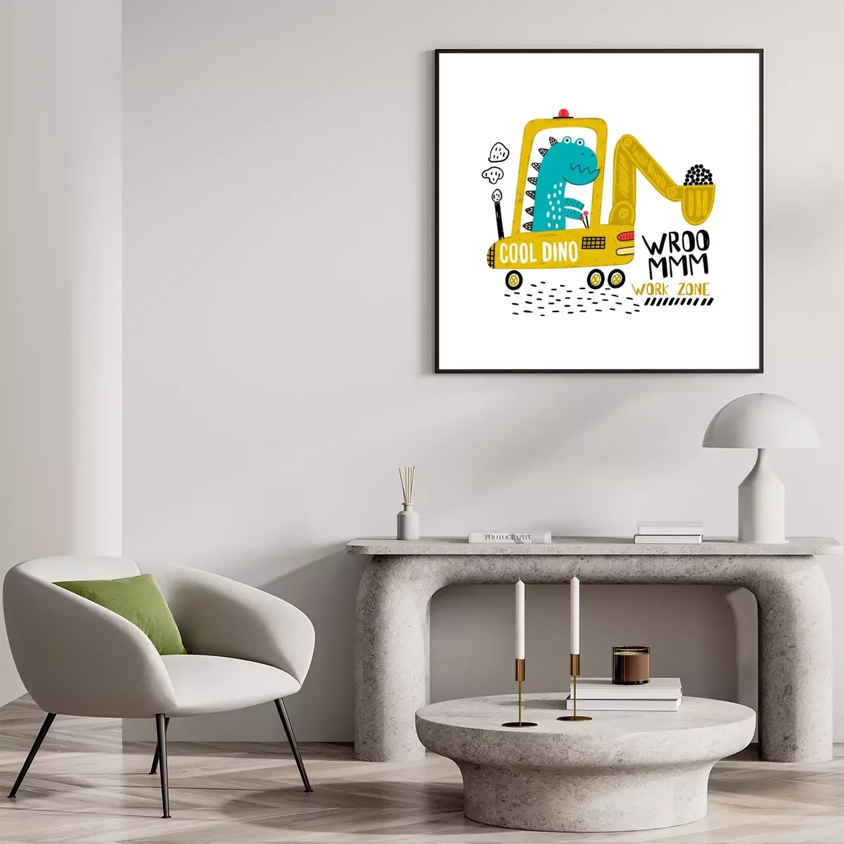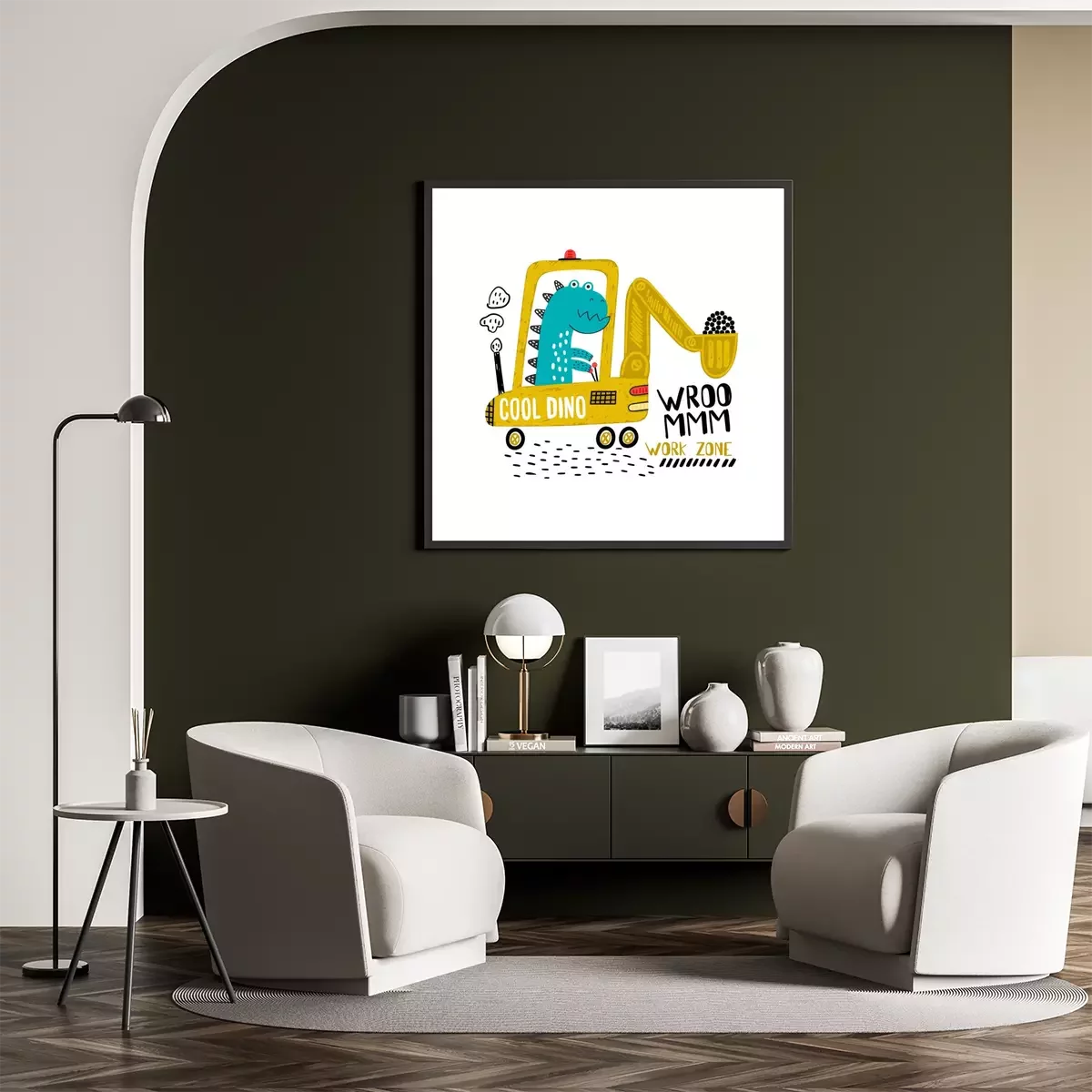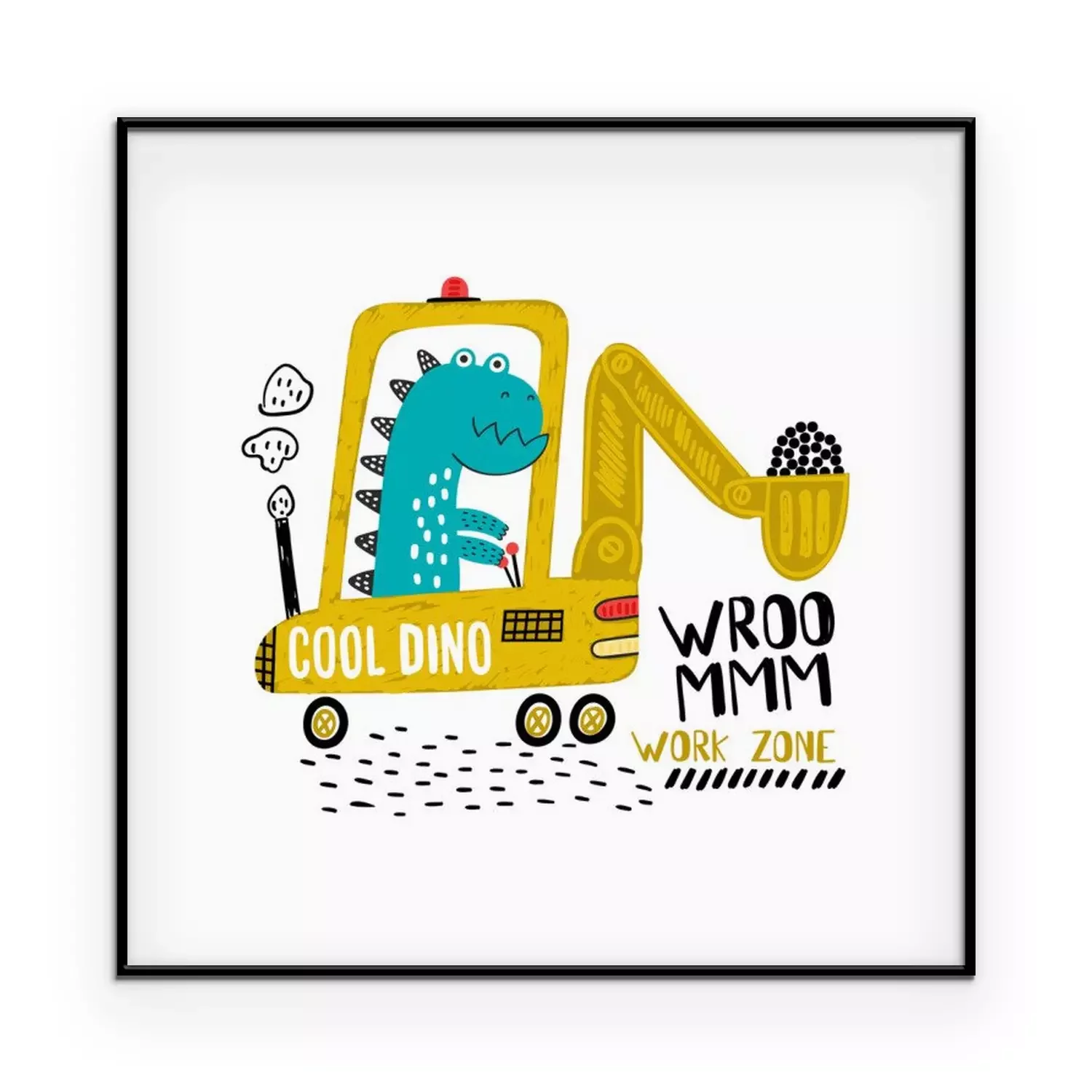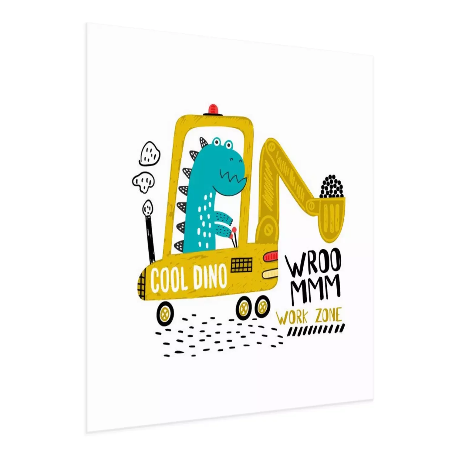 Poster : Dinosaure dans une pelle jaune avec une bande rouge