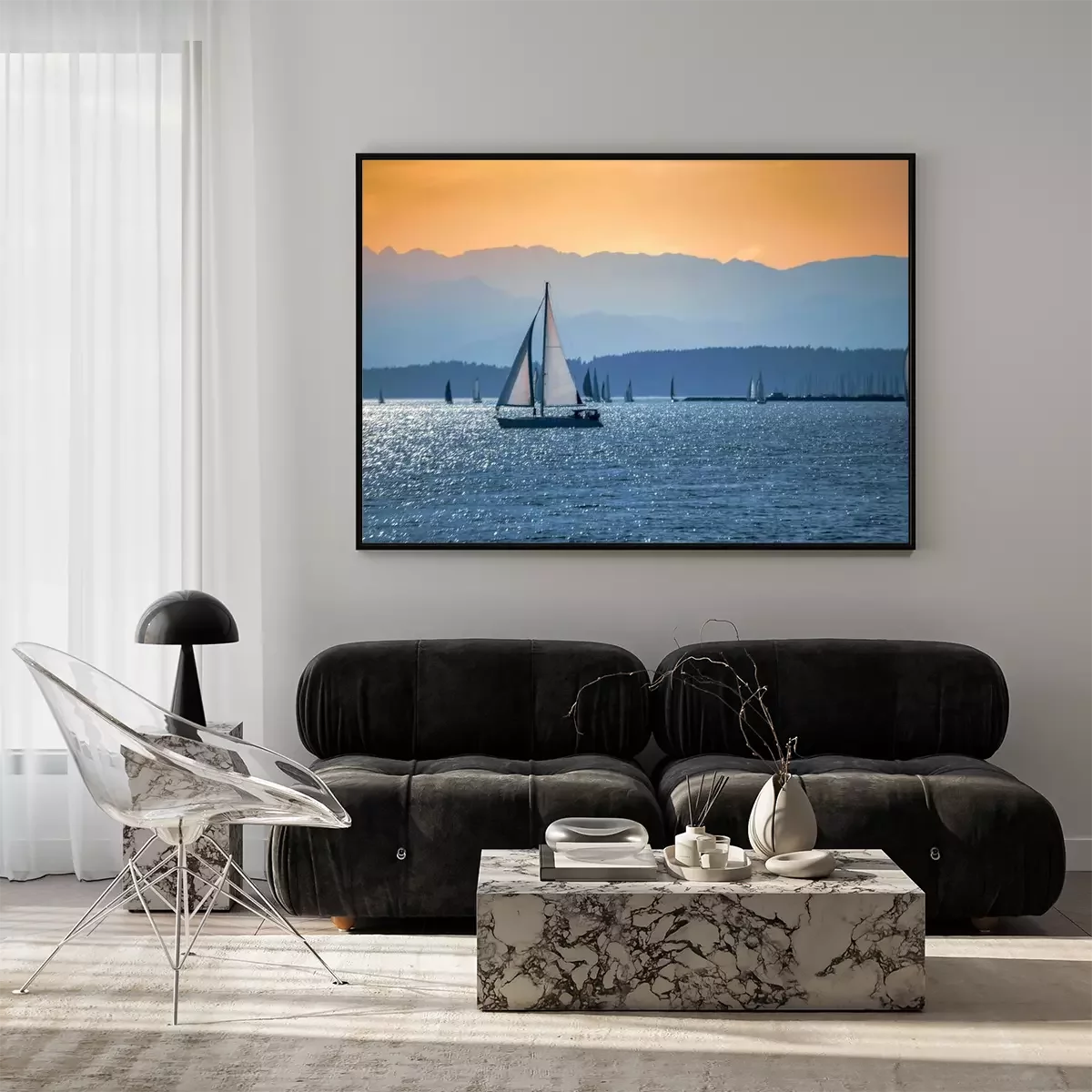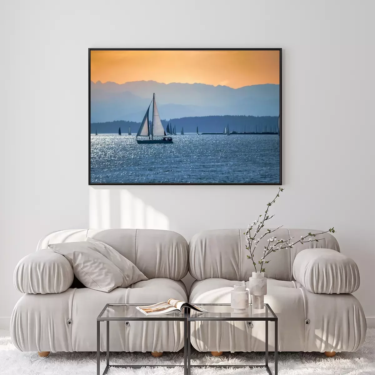 Poster : Distant sailboats on the Salish sea with Olympic Mountains at sunset.