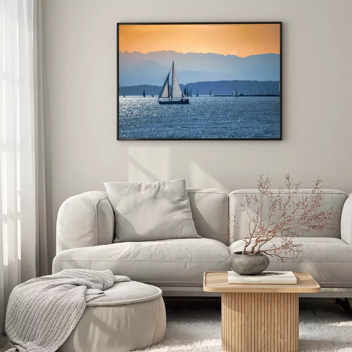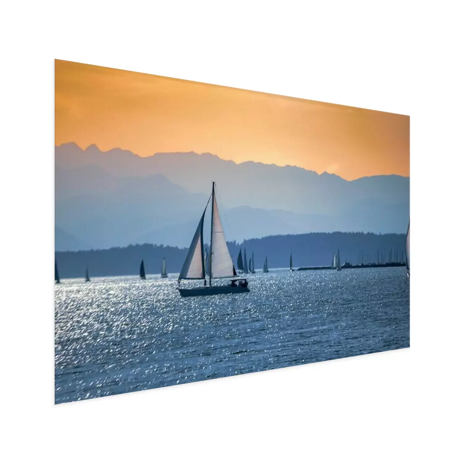 Poster  Distant sailboats on the Salish sea with Olympic Mountains at sunset.
