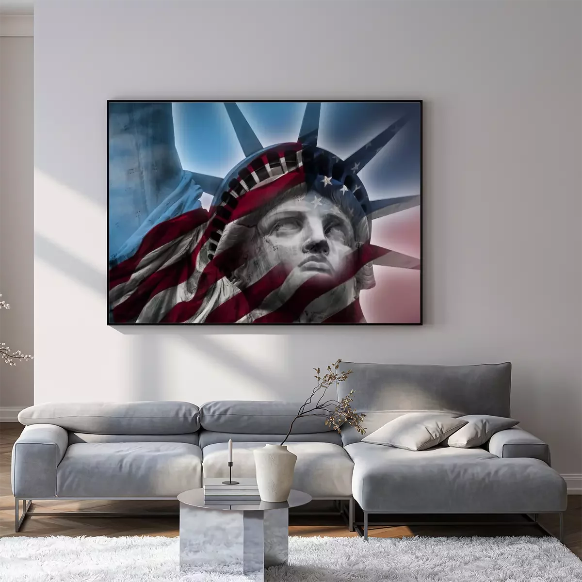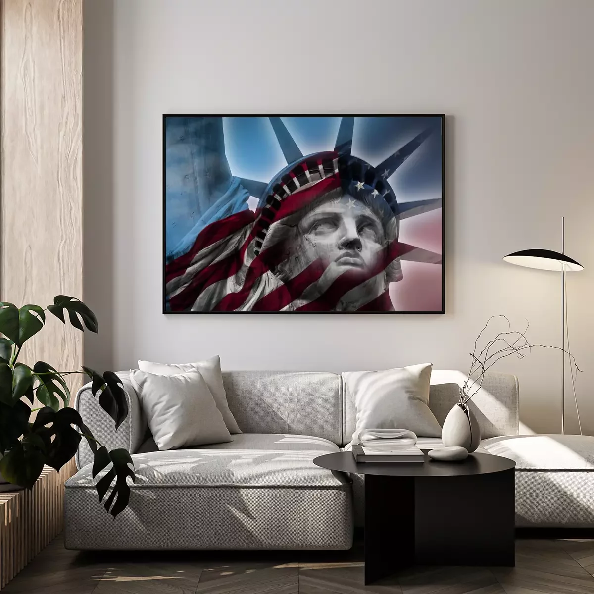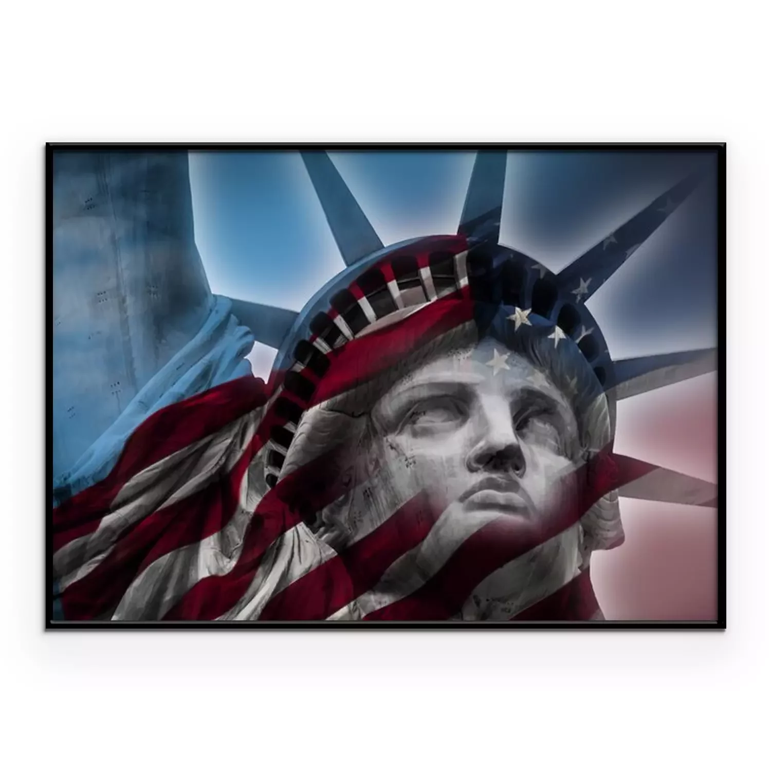 Poster  Double exposure image of the Statue of Liberty and the American flag