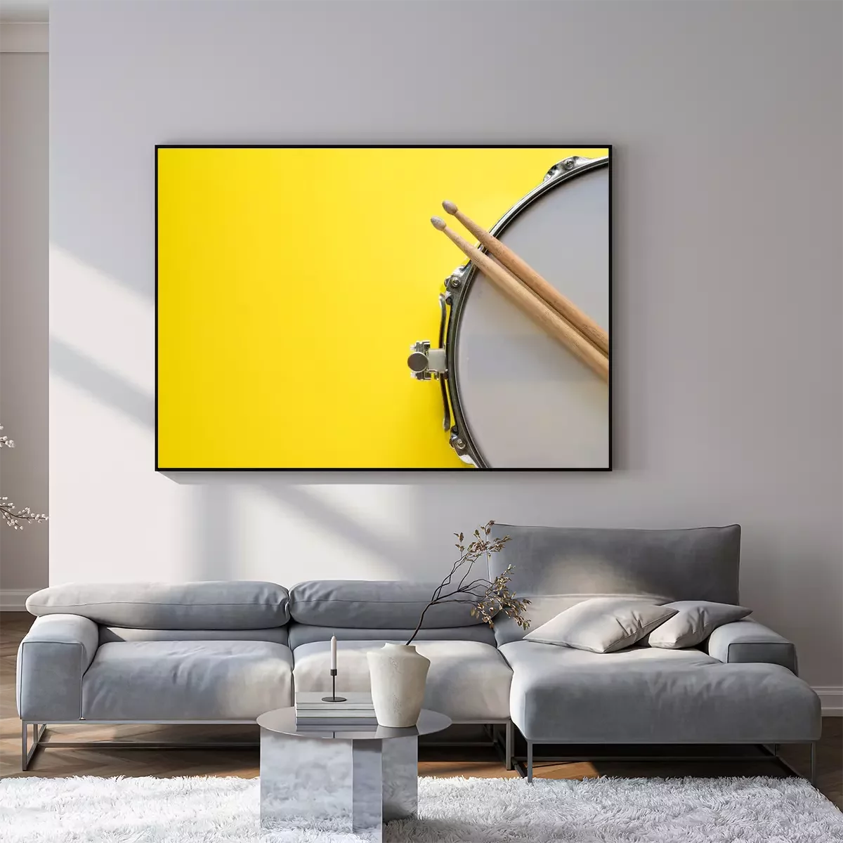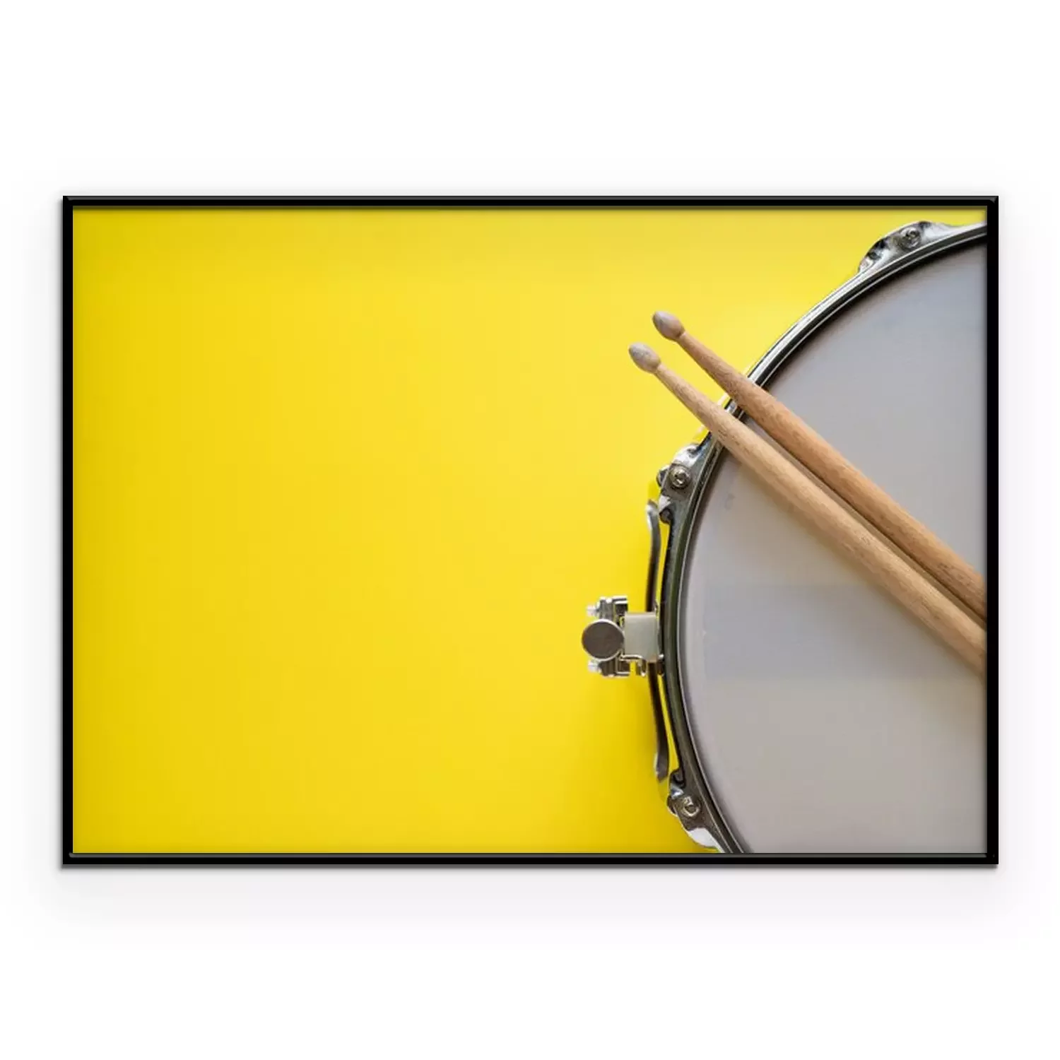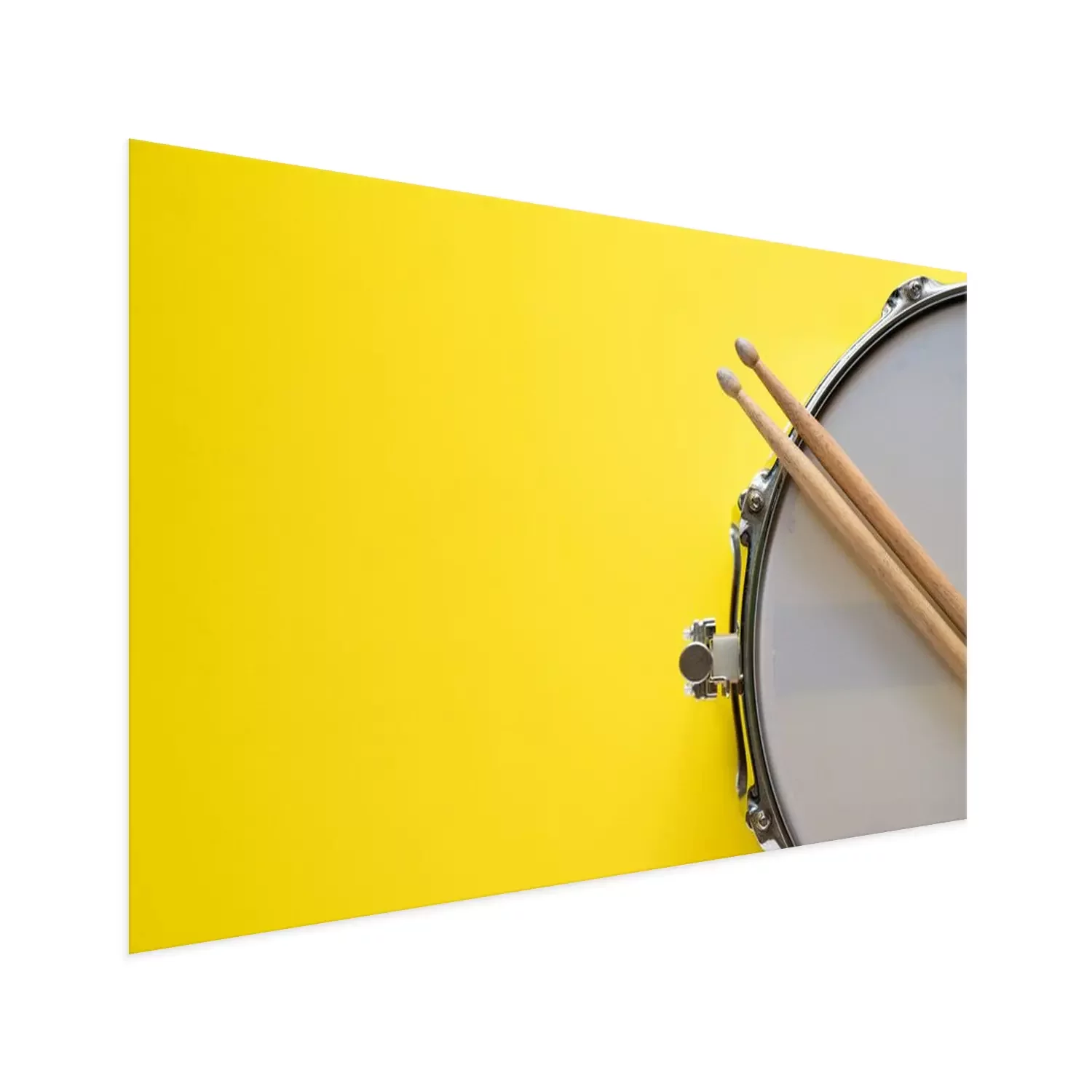 Poster  Drum stick and drum on yellow table background, top view, music concept