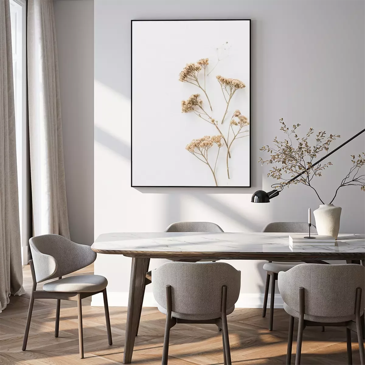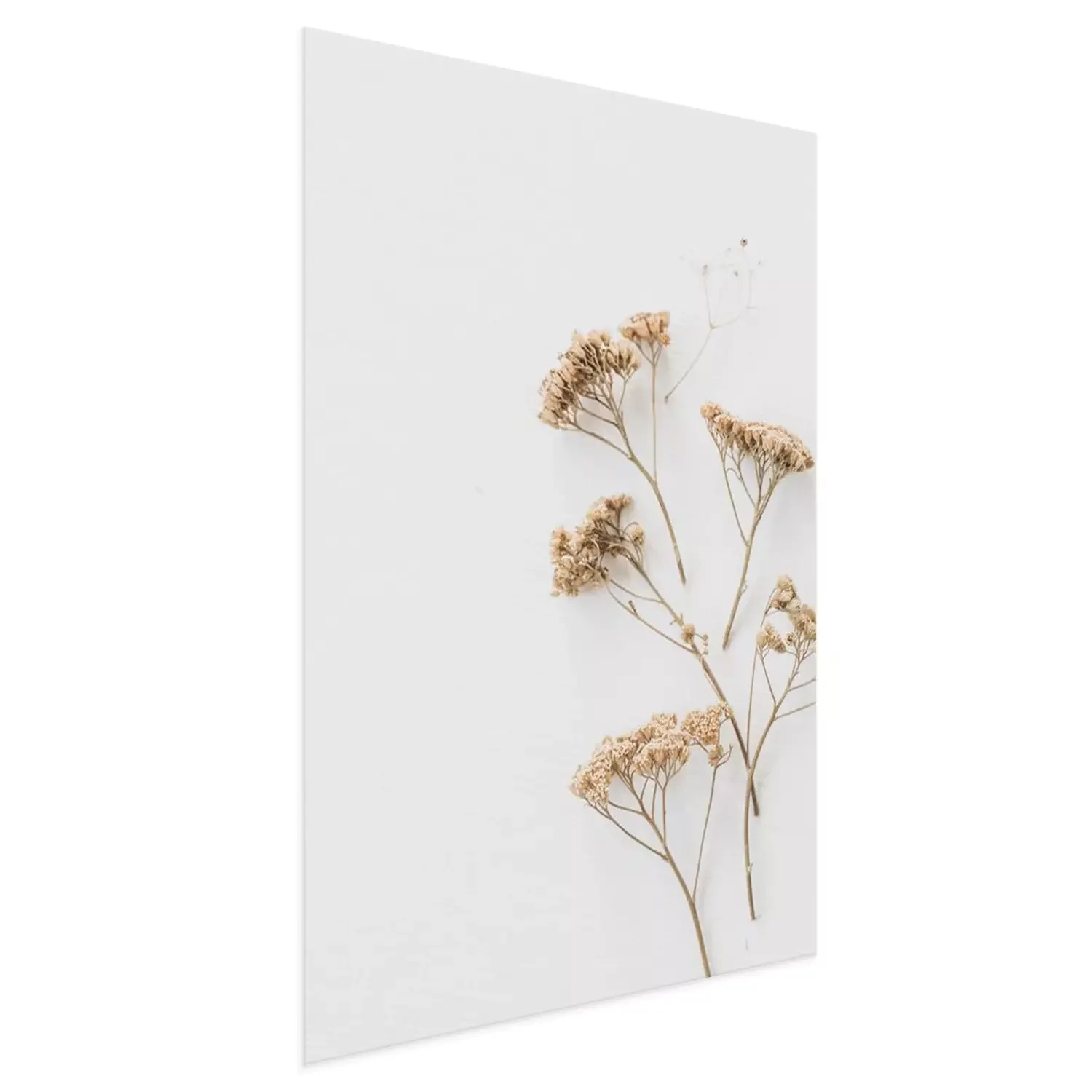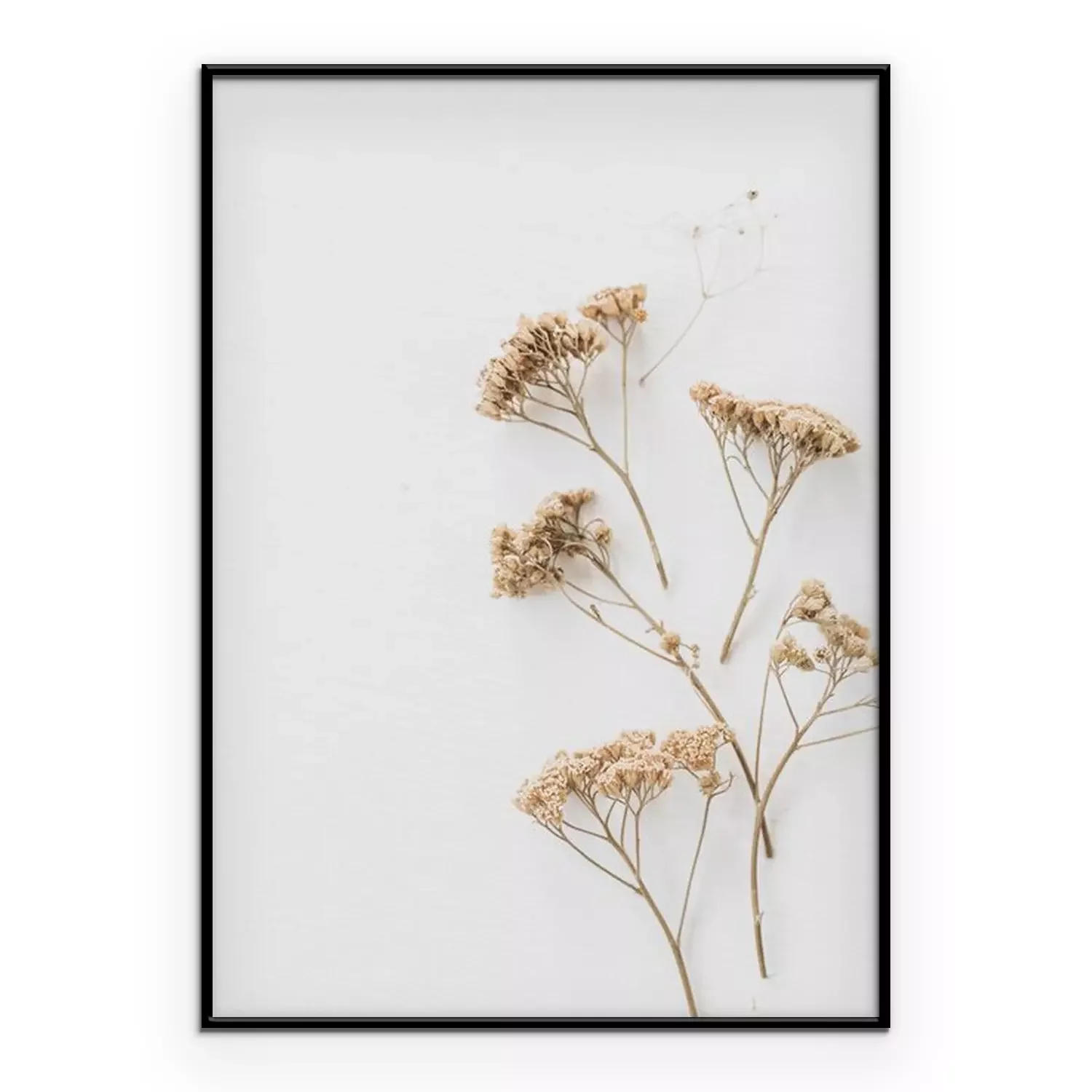 Poster  Dry floral branch on white background. Flat lay, top view minimal neutral flower composition.