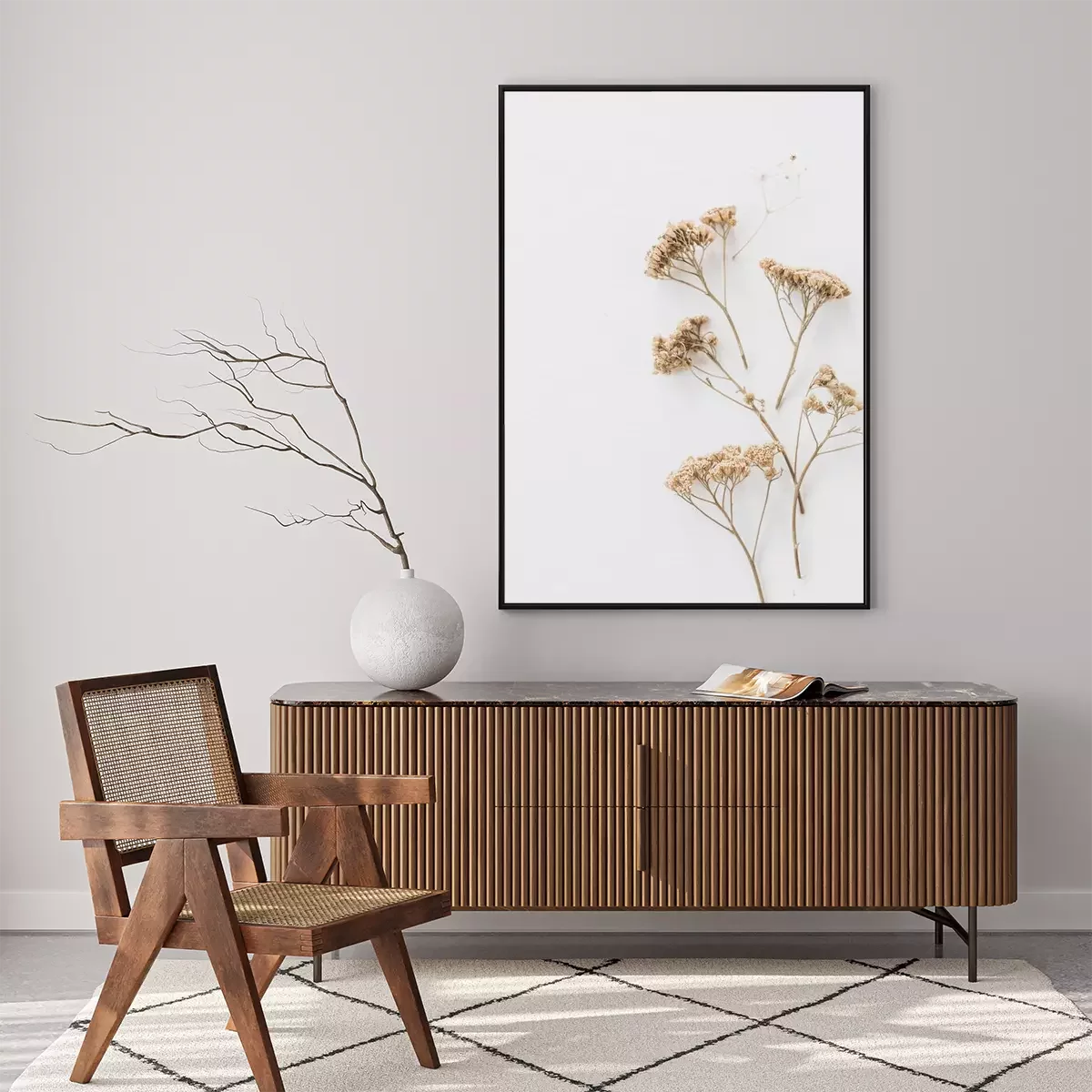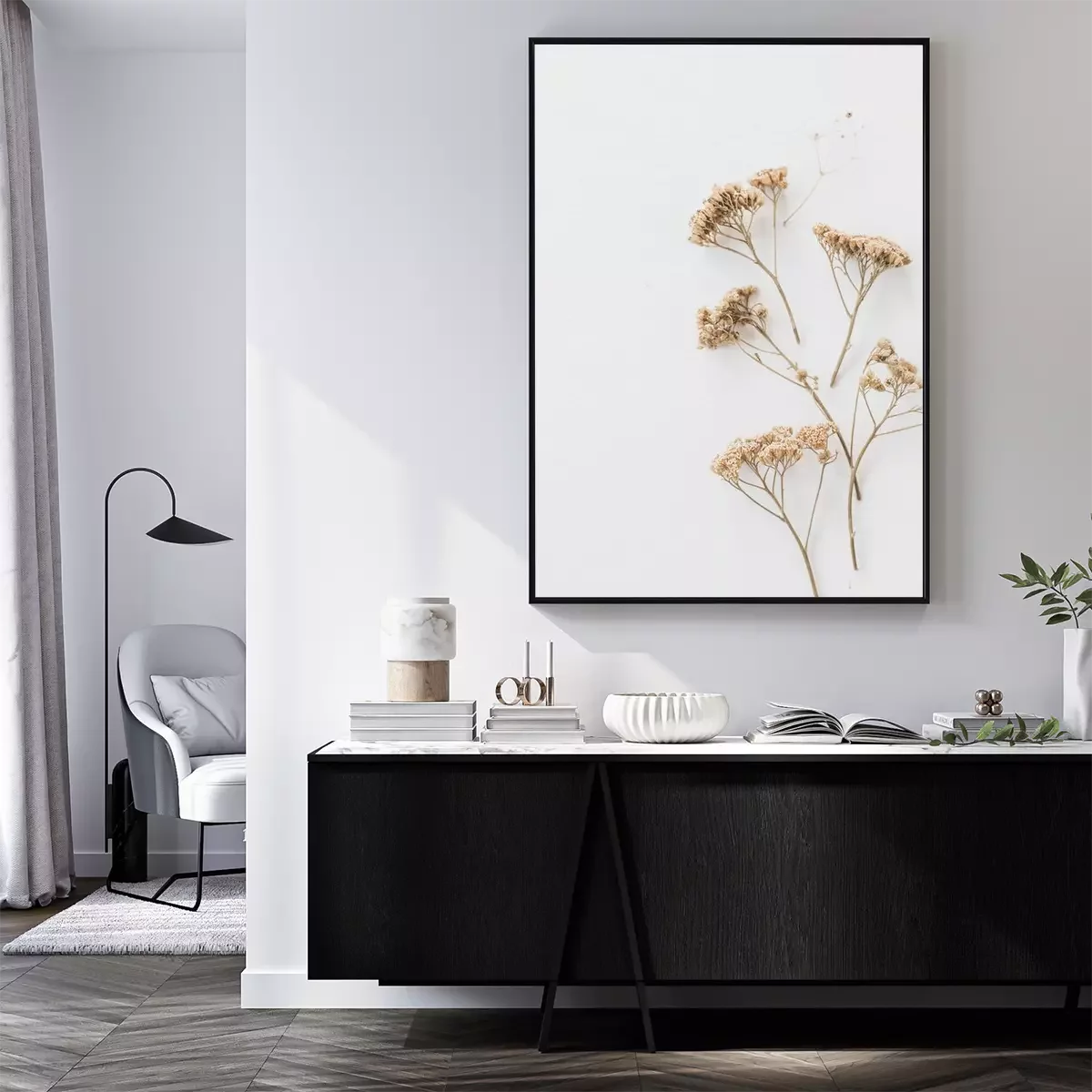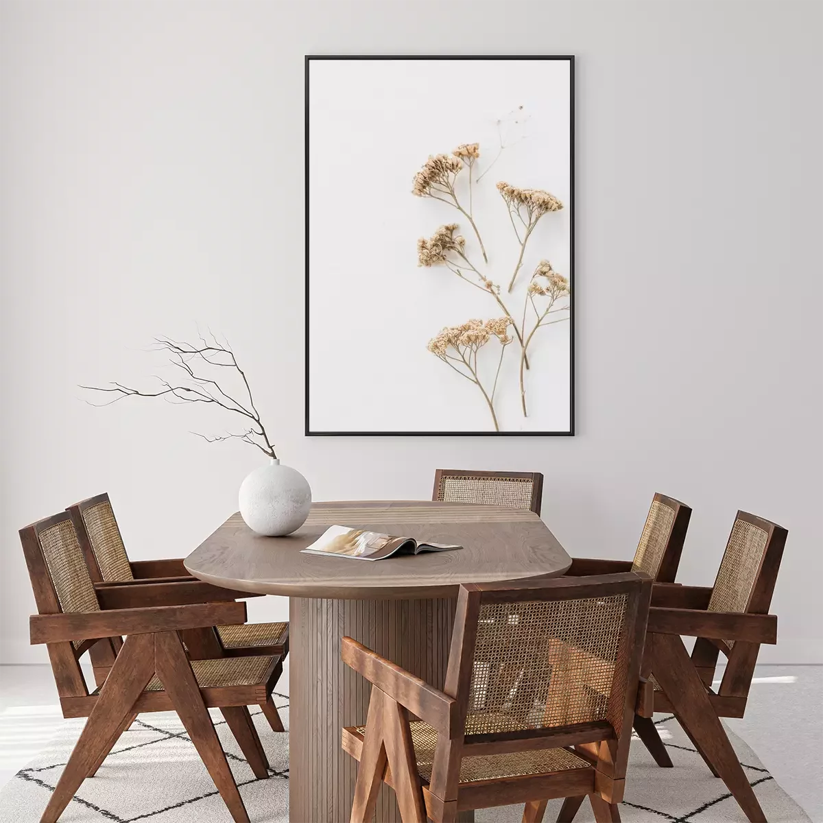 Poster  Dry floral branch on white background. Flat lay, top view minimal neutral flower composition.