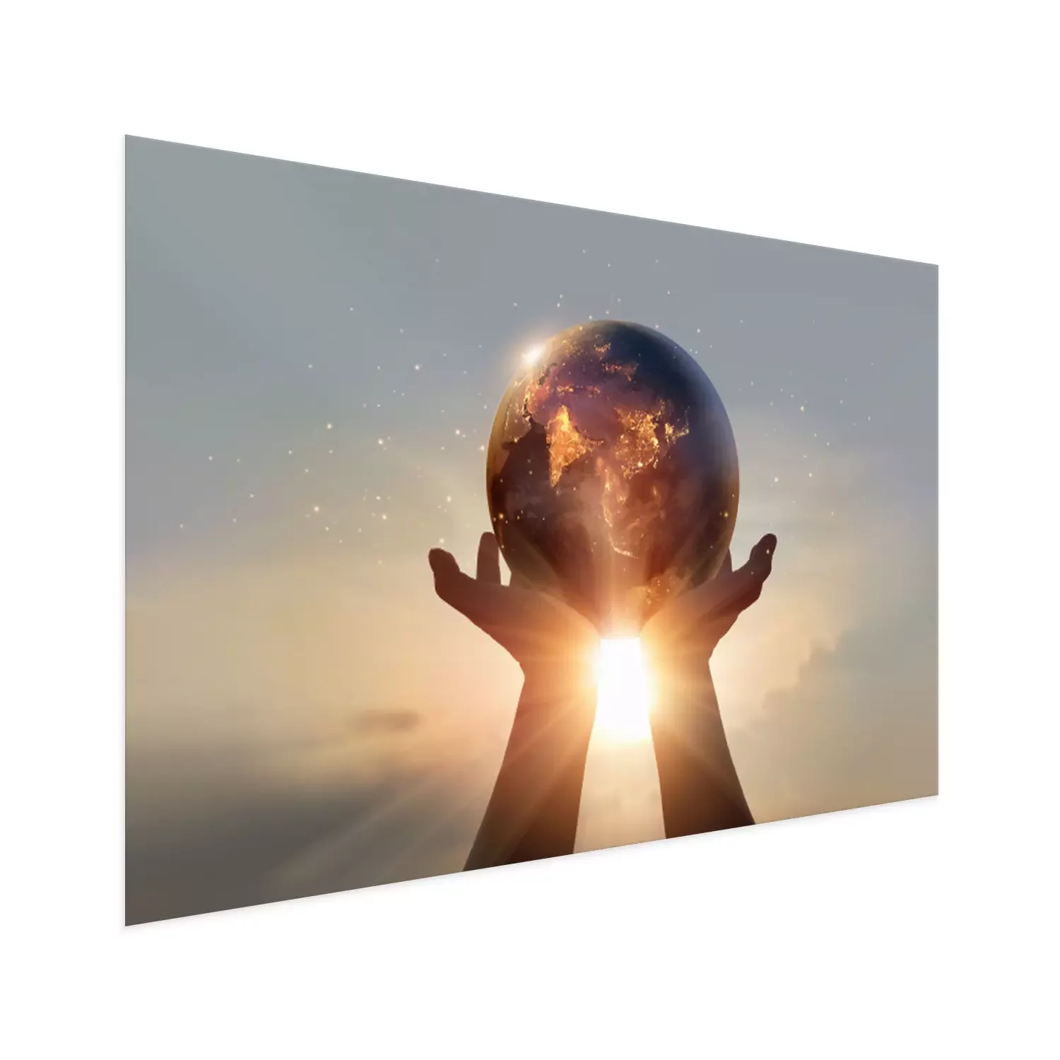 Poster : Earth at night was holding in human hands. Earth day. Energy saving concept, Elements of this image furnished by NASA