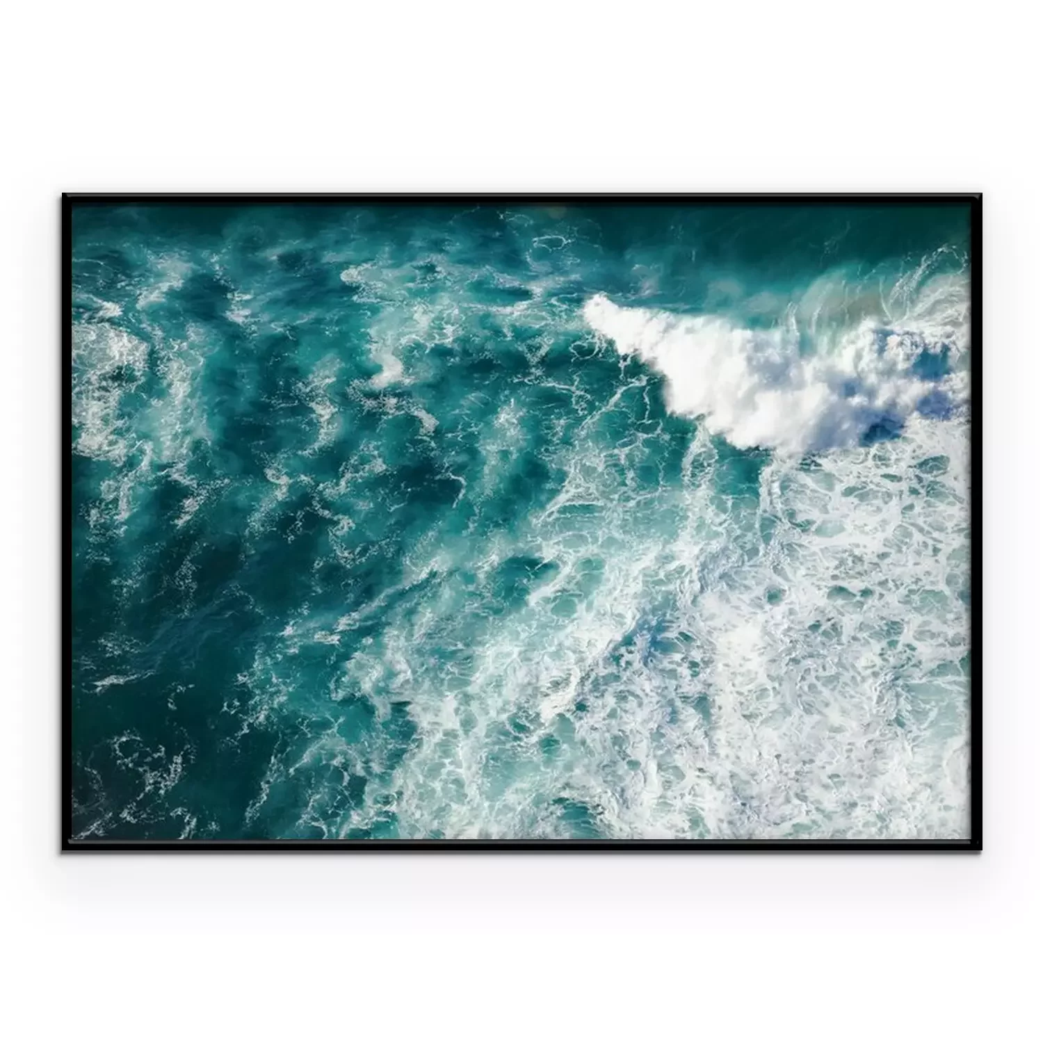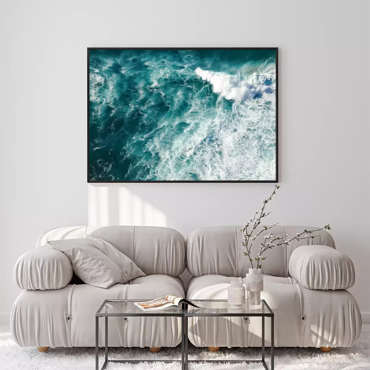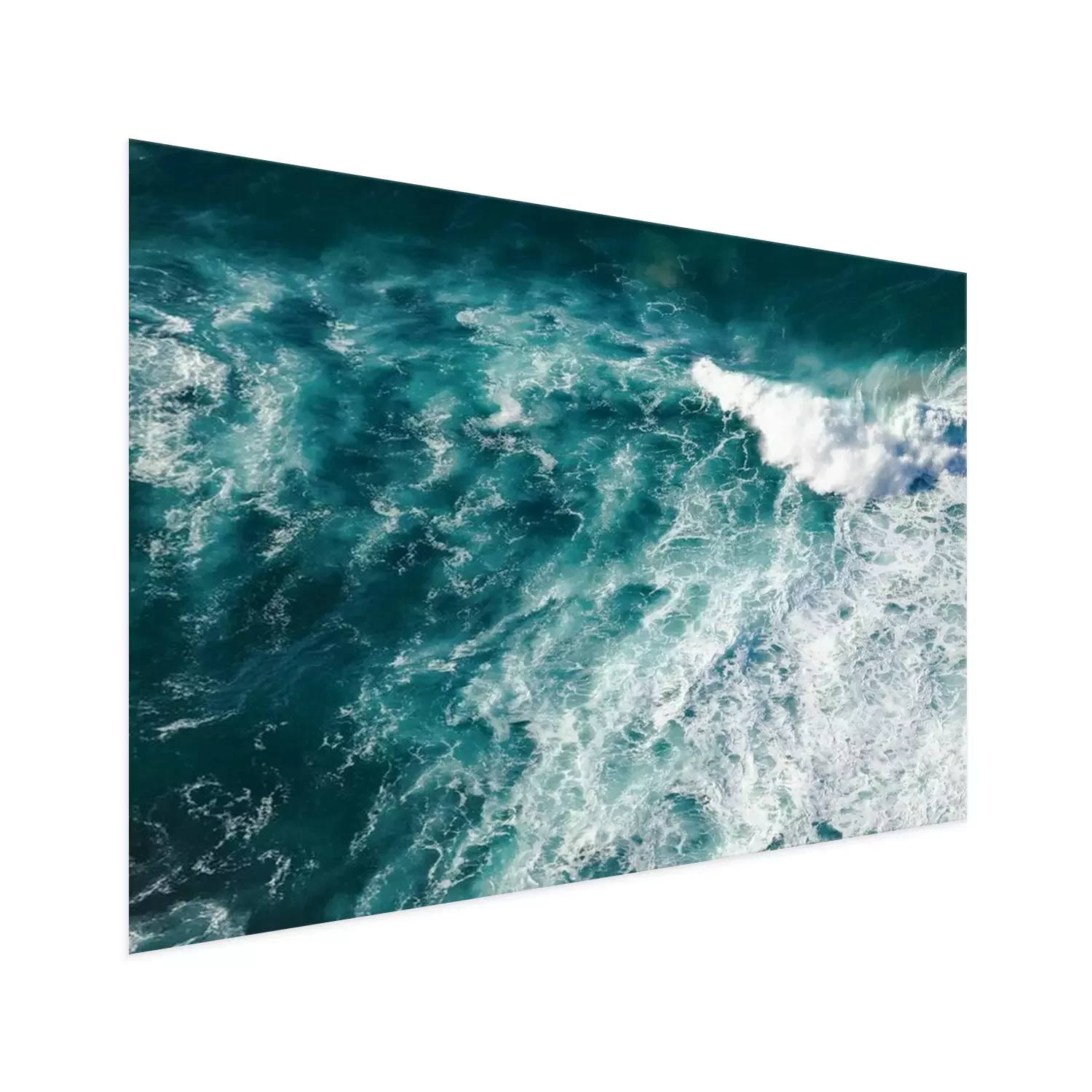 Poster  Eau de mer turquoise avec des vagues mousseuses, image d'en haut, fond de l'océan abstrait et texture
