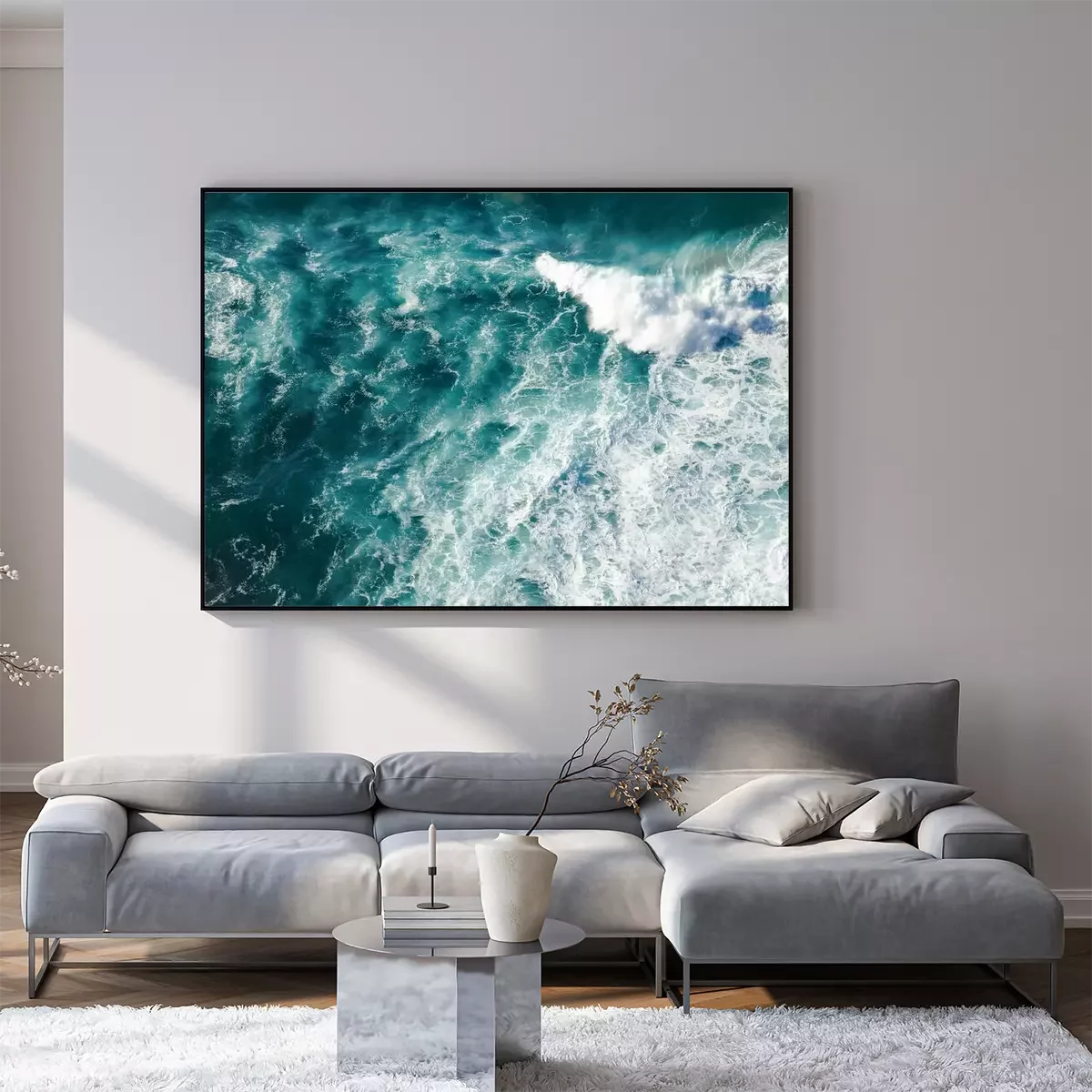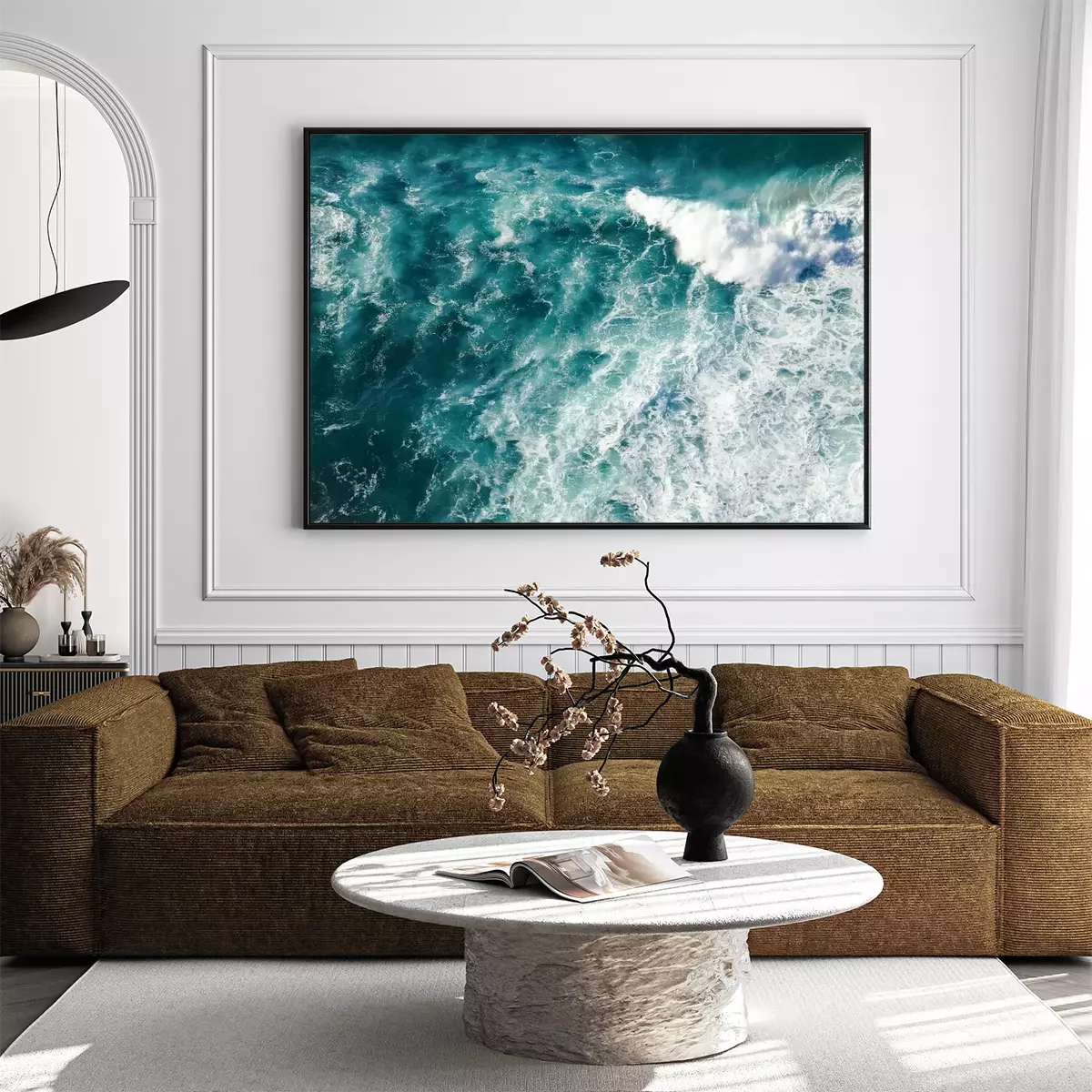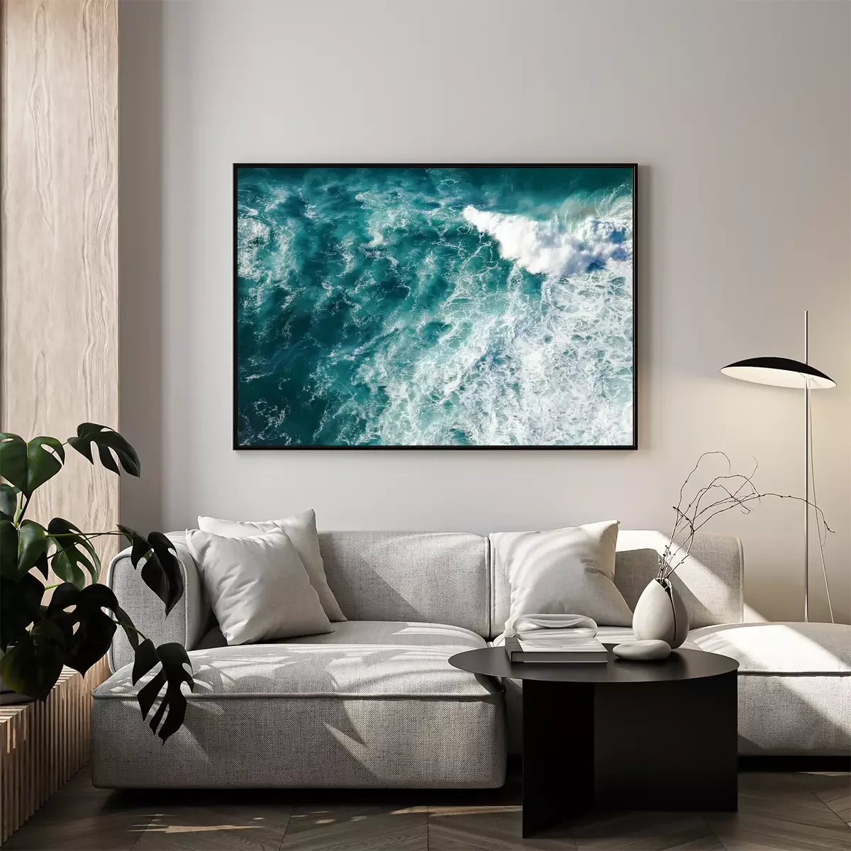 Poster  Eau de mer turquoise avec des vagues mousseuses, image d'en haut, fond de l'océan abstrait et texture