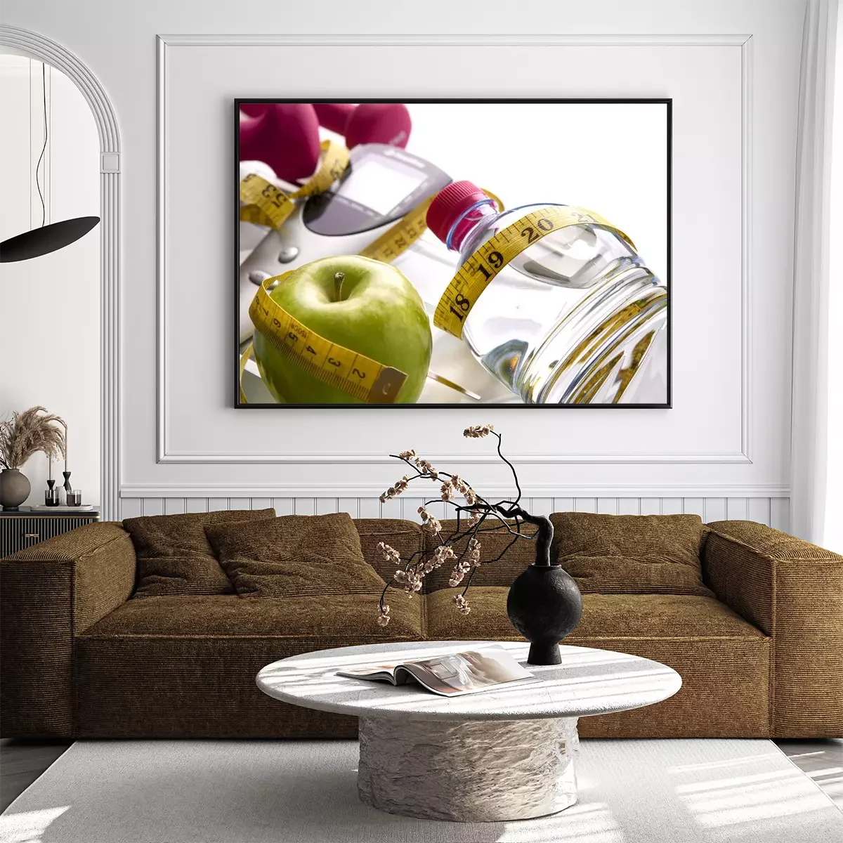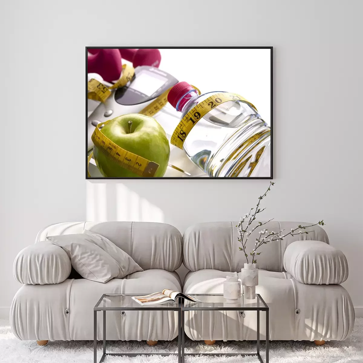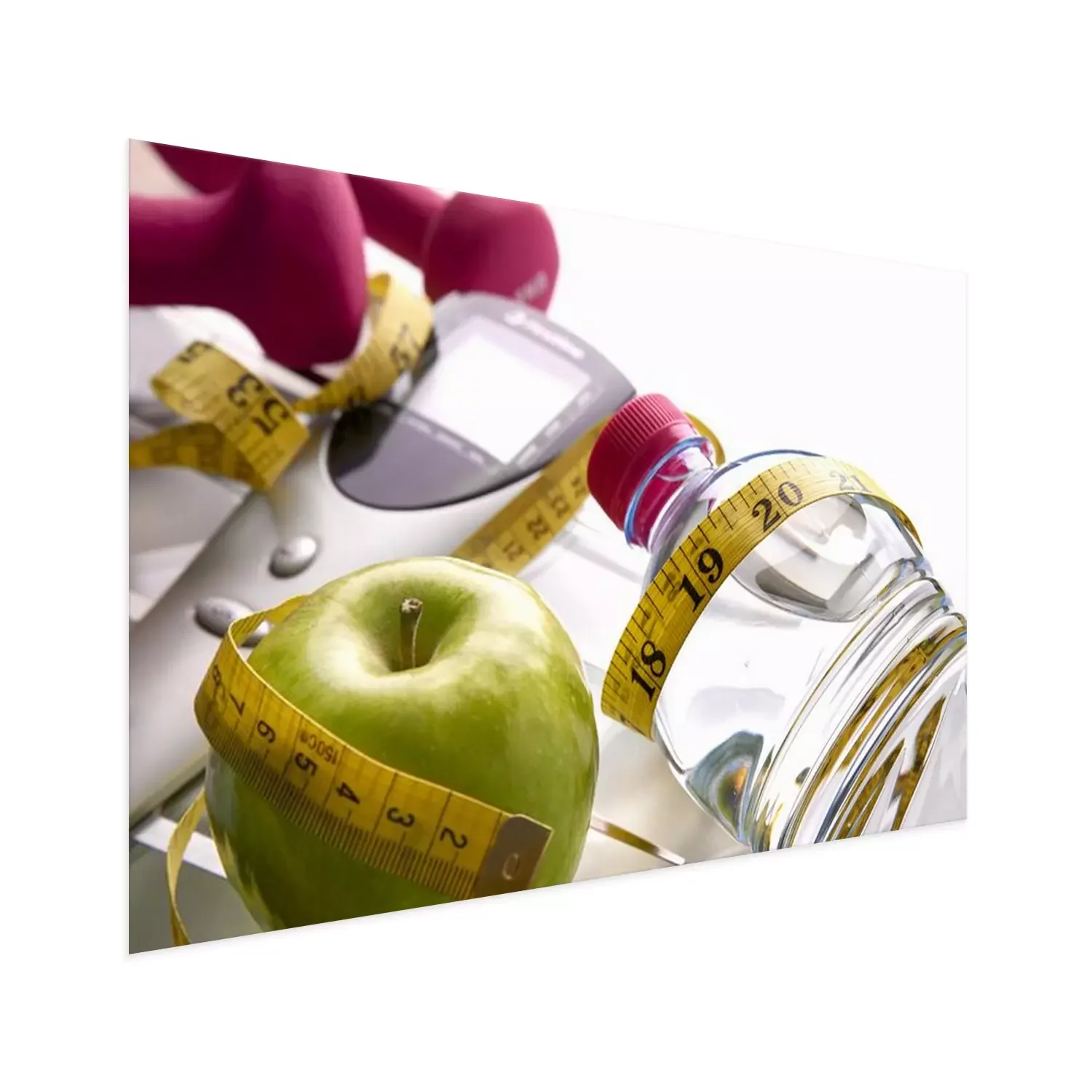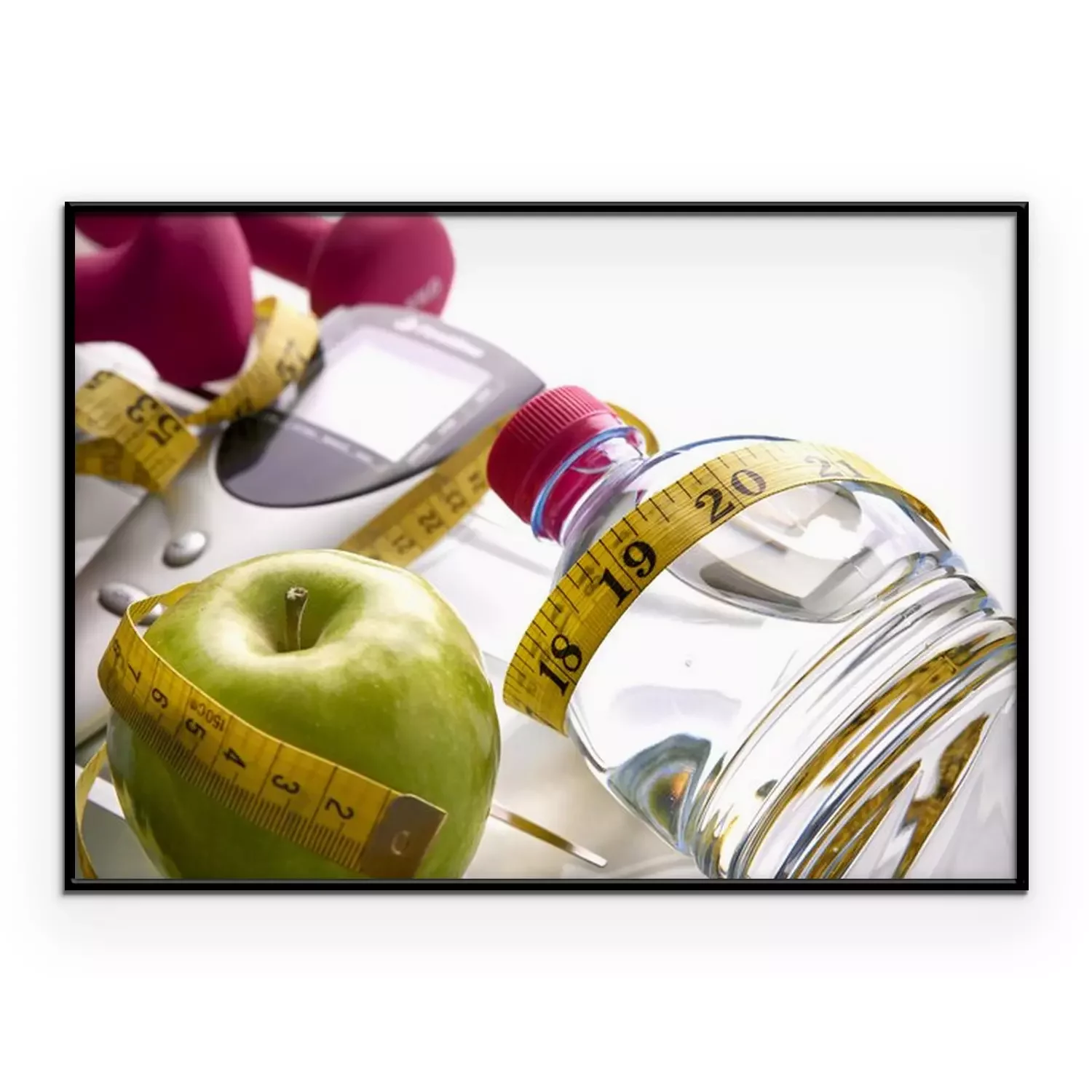 Poster  Échelle, haltères, bouteille, pomme, ruban, mesure, élevé, vue