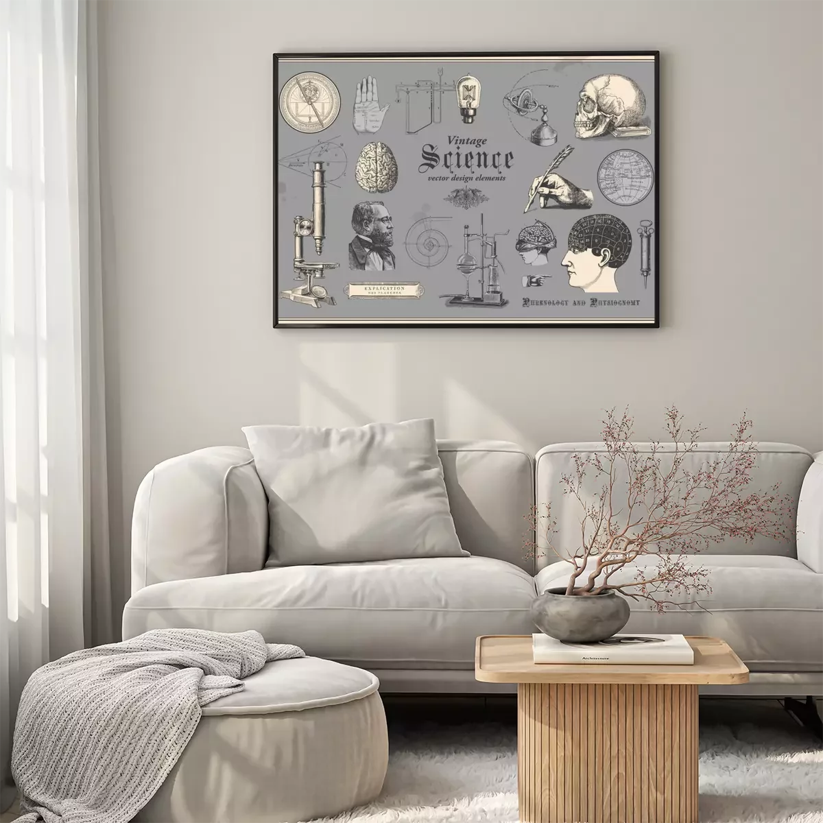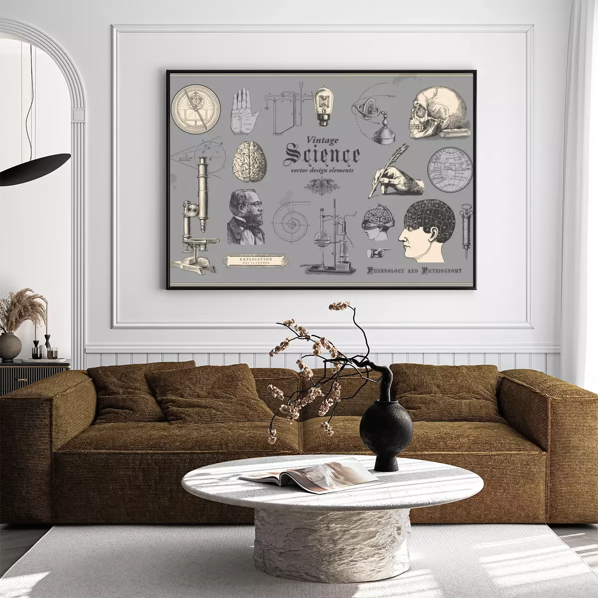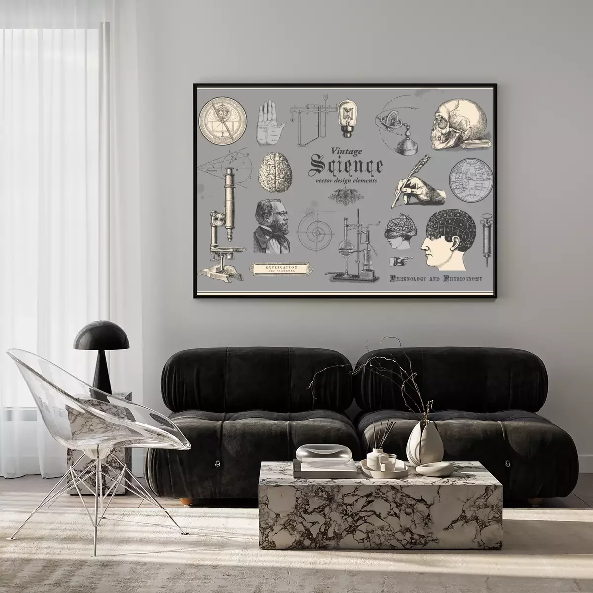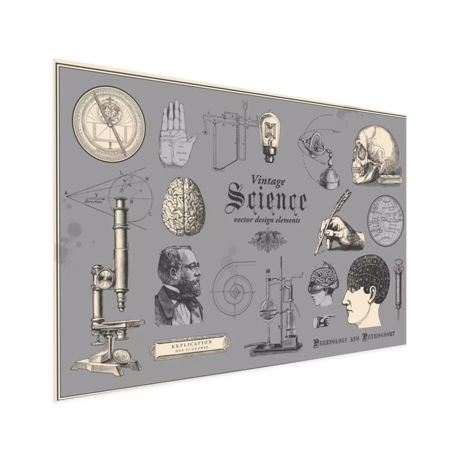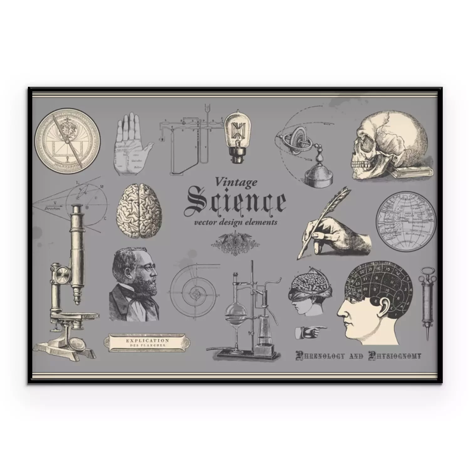Poster  Éléments de conception graphique rétro: science vintage - collection de dessins anciens mettant en vedette des disciplines telles que la médecine, la phrénologie, la chimie, la lecture de la paume (ch