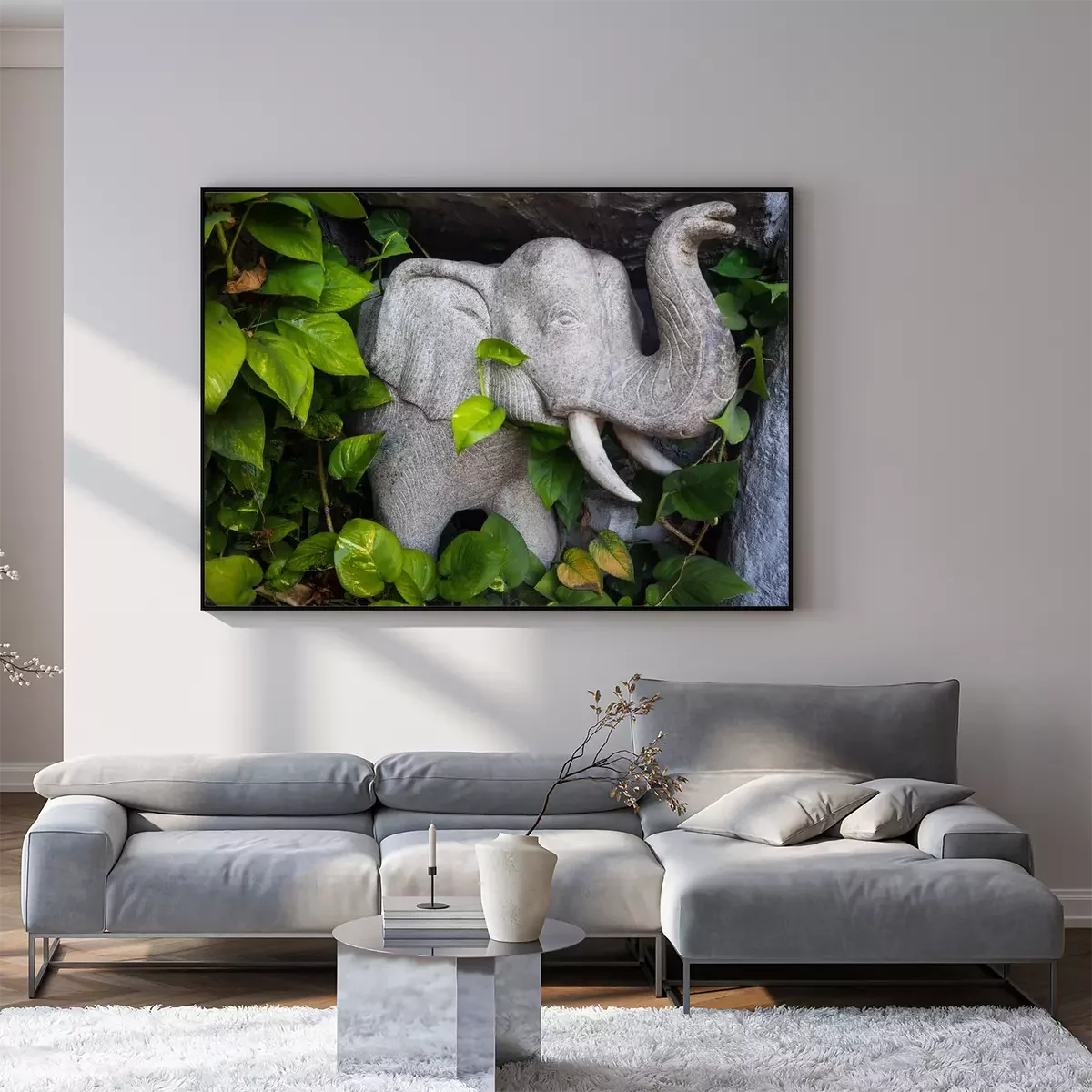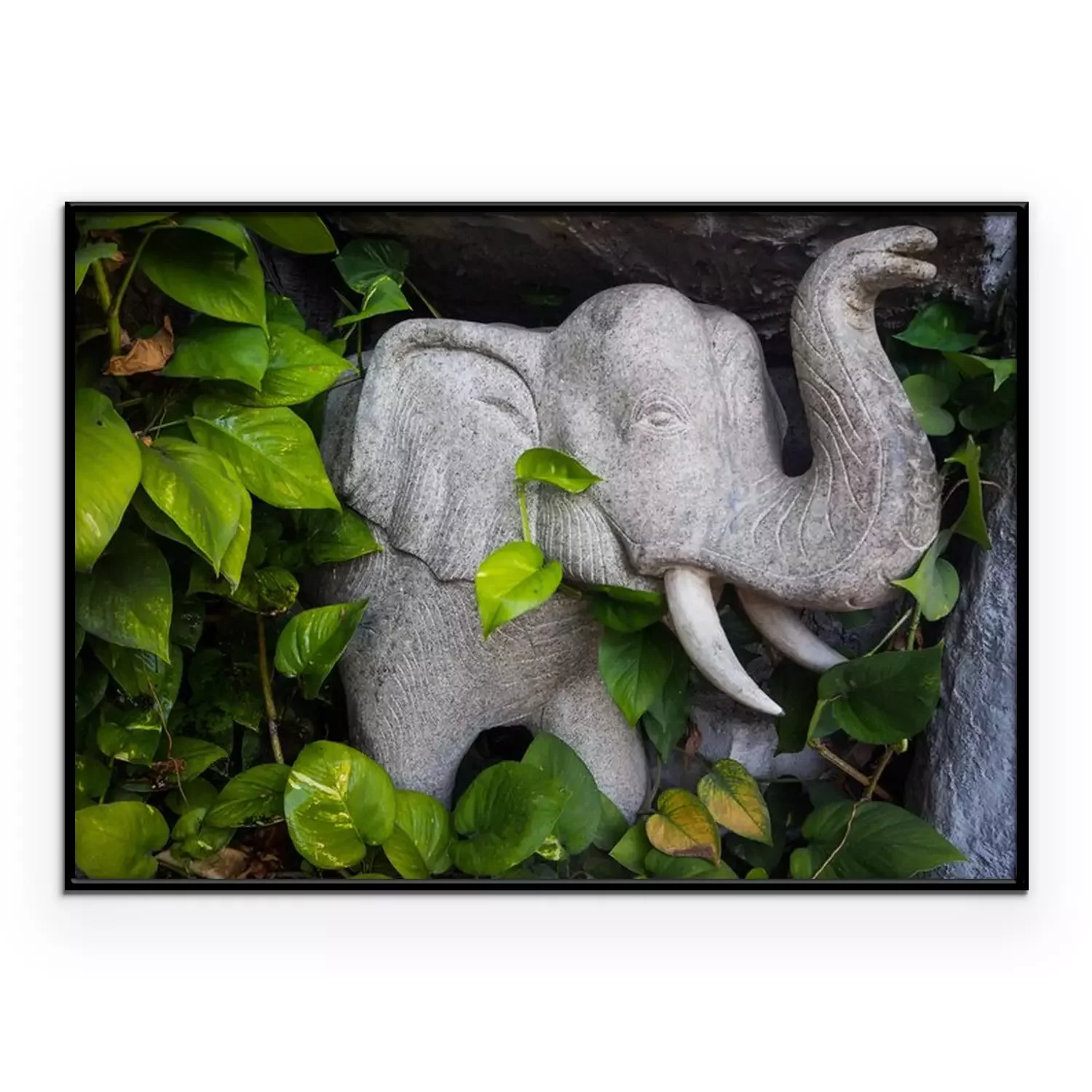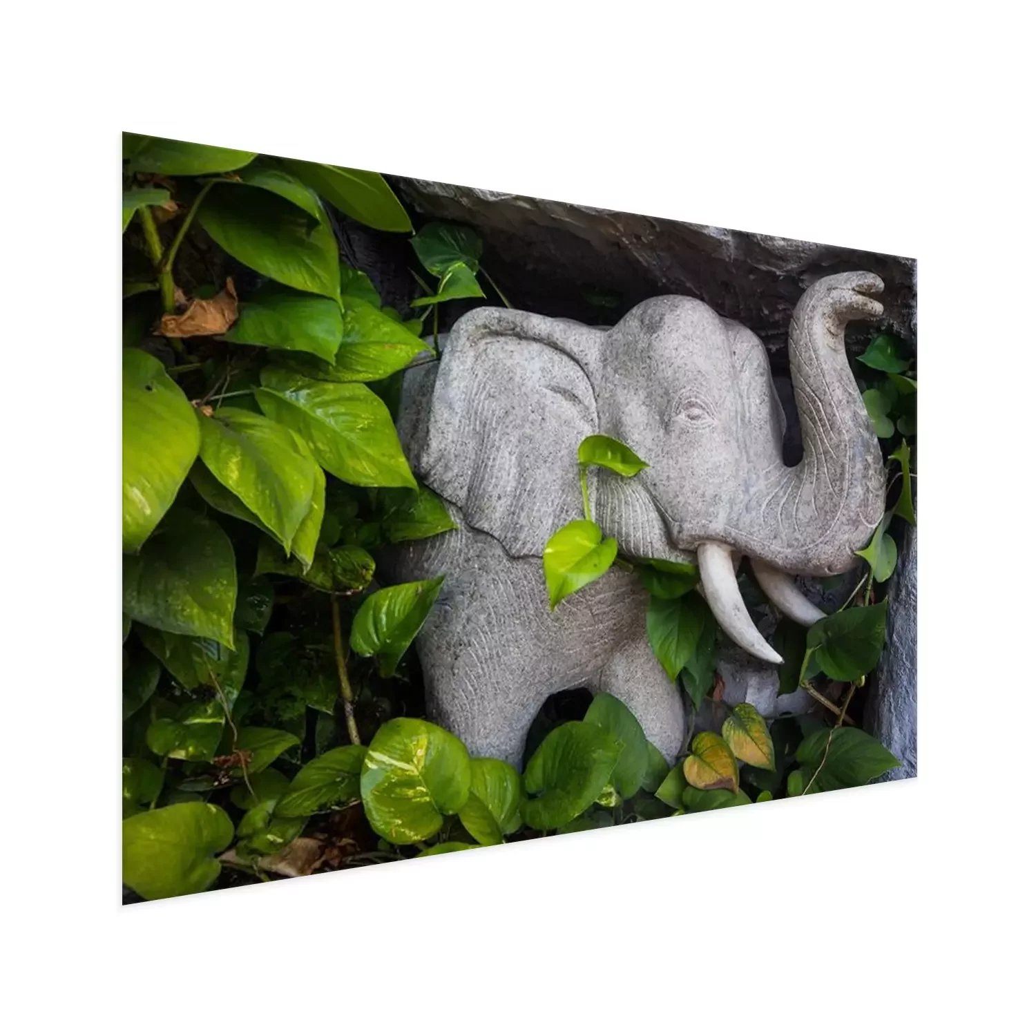 Poster : Éléphant en pierre parmi les feuilles