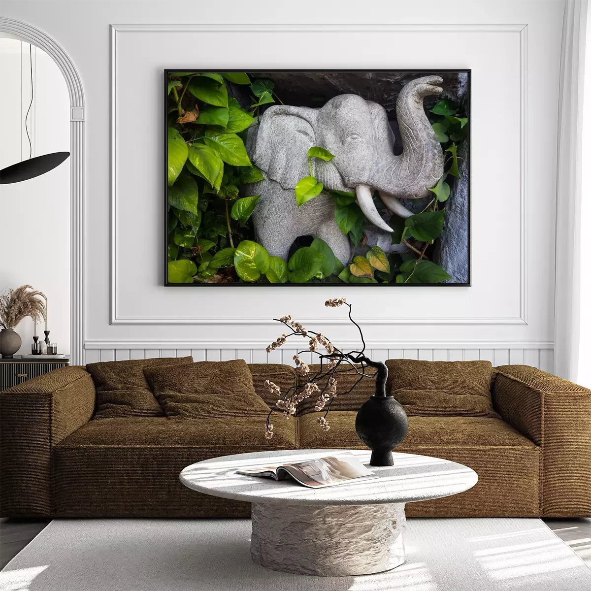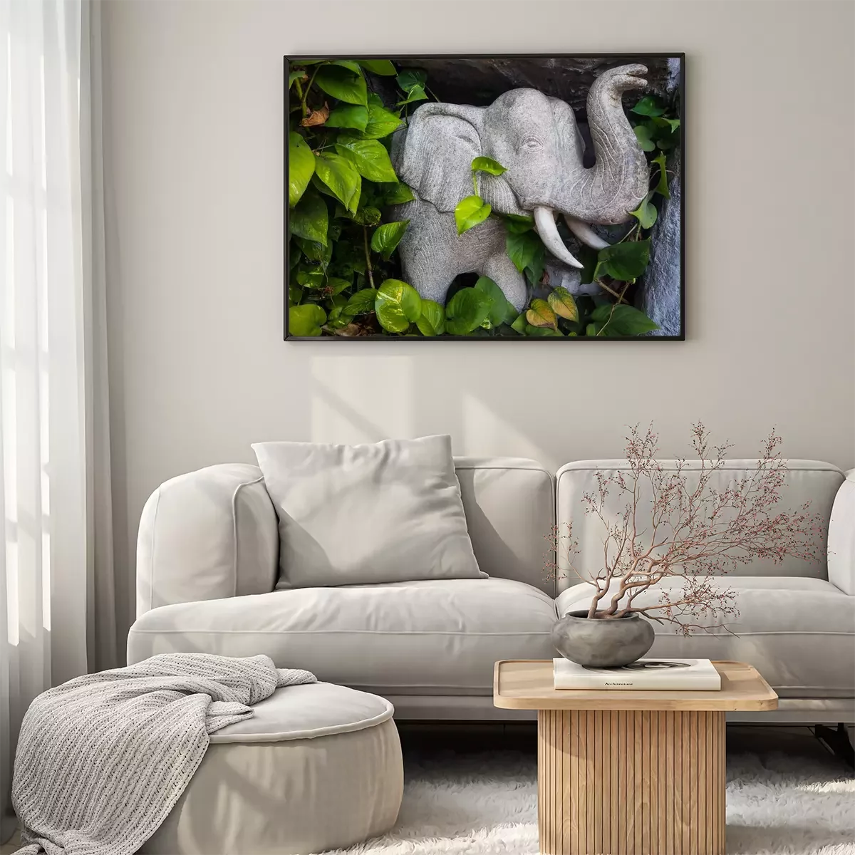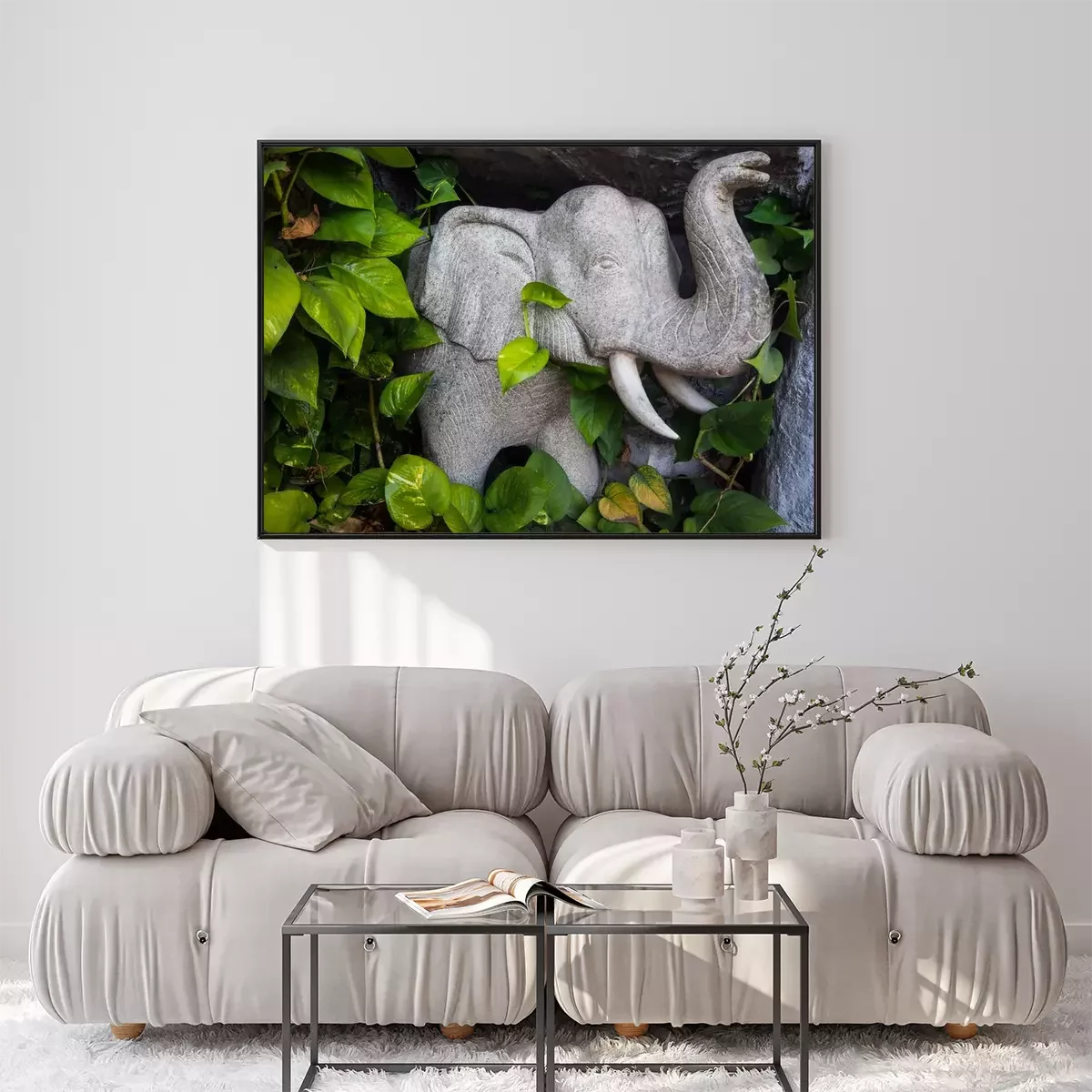 Poster : Éléphant en pierre parmi les feuilles