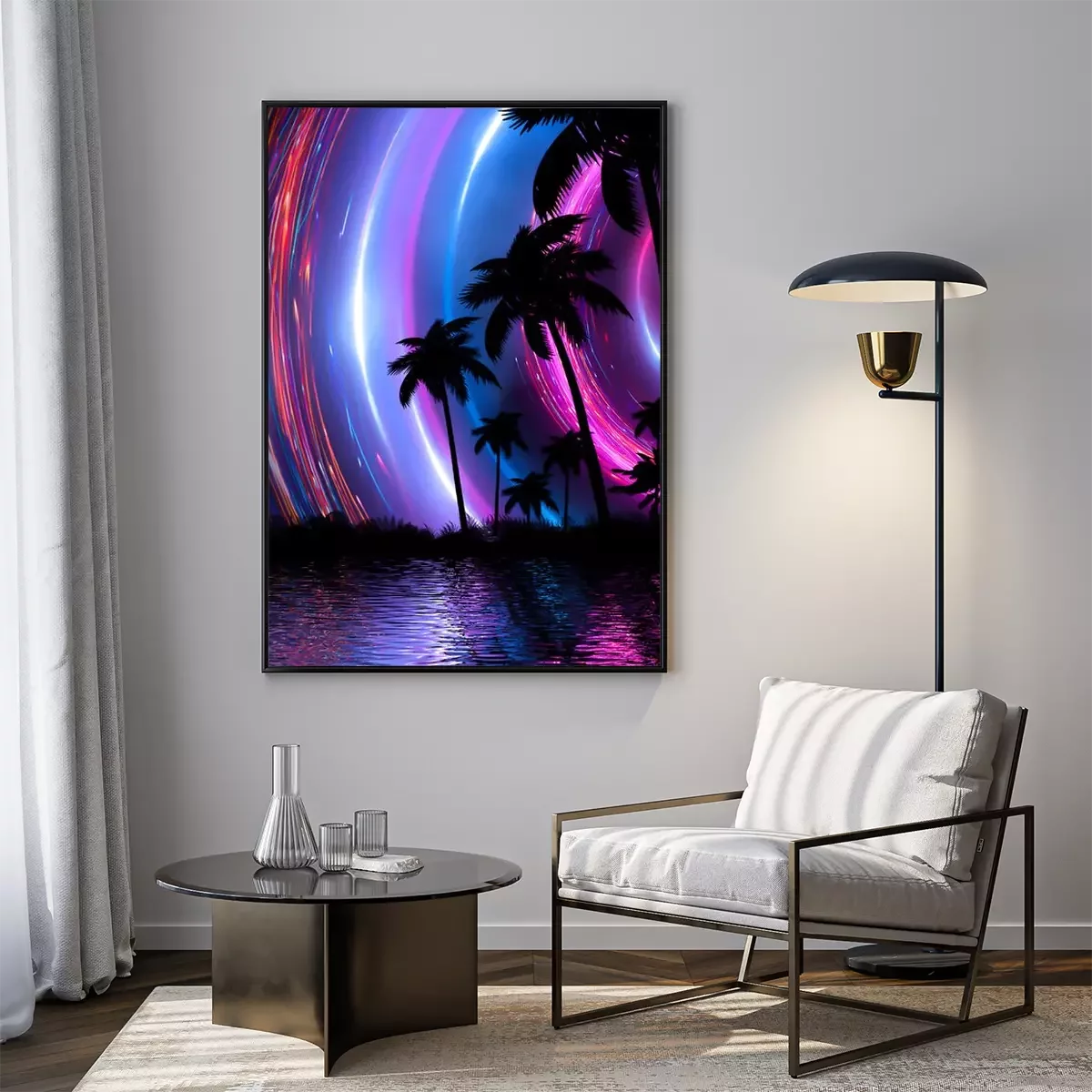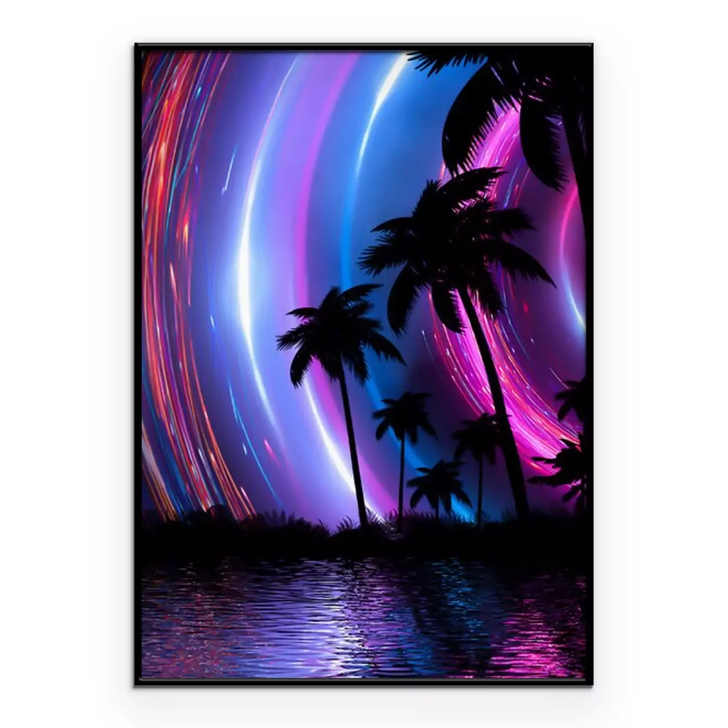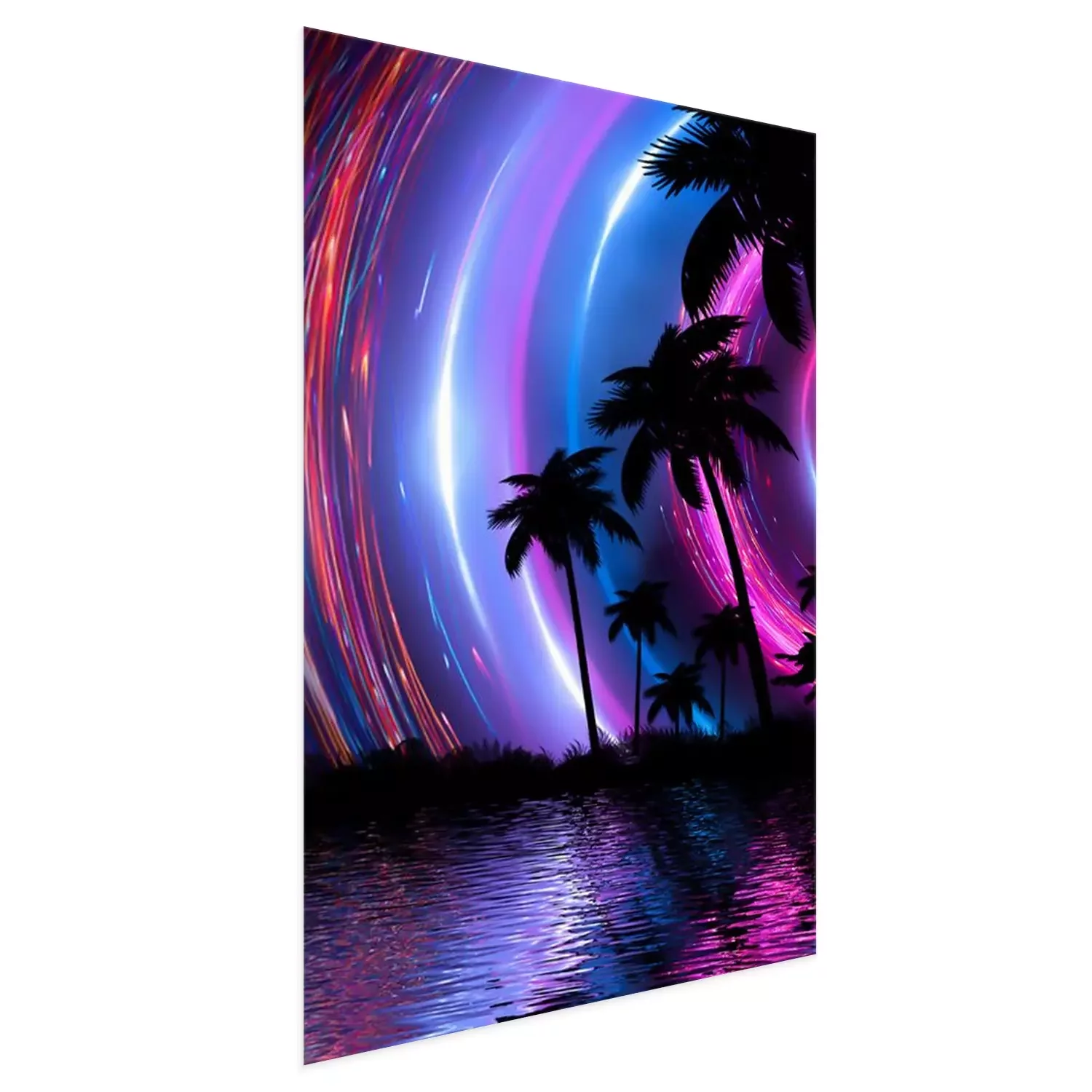 Poster  Empty tropical background of night sea beach. Silhouettes of tropical palm trees on a background of bright sunset. 3d illustration