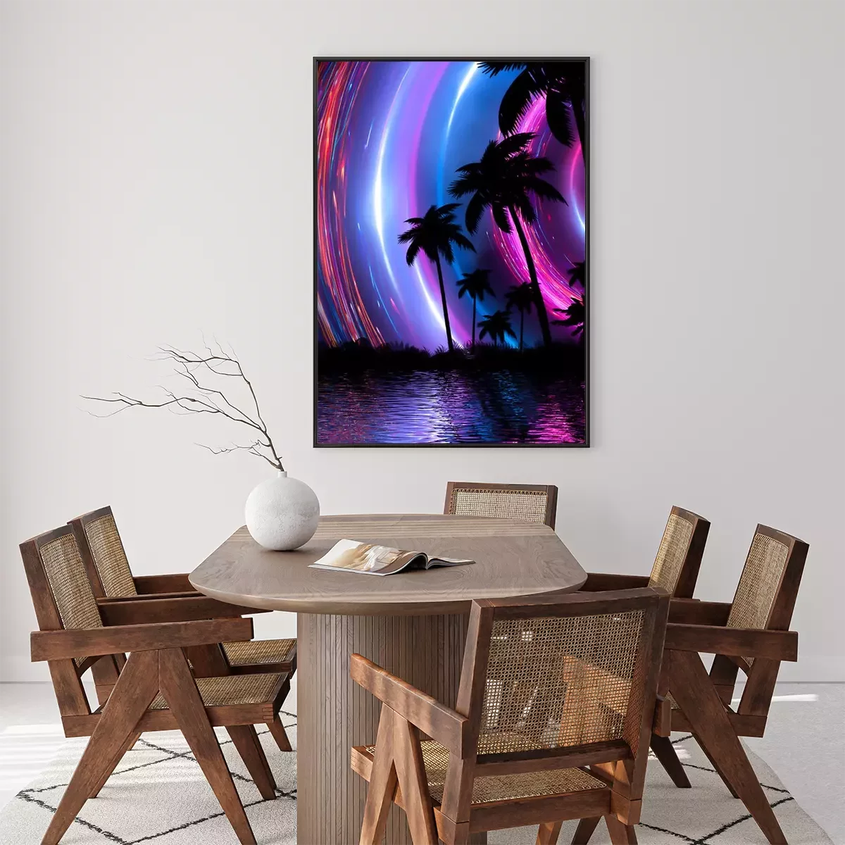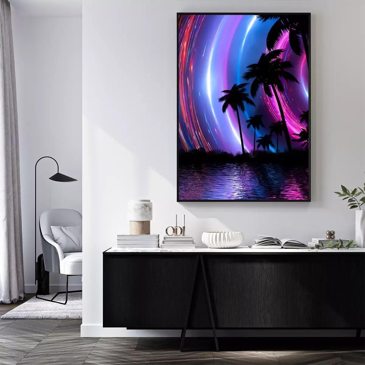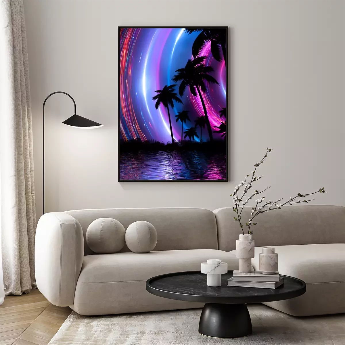 Poster  Empty tropical background of night sea beach. Silhouettes of tropical palm trees on a background of bright sunset. 3d illustration