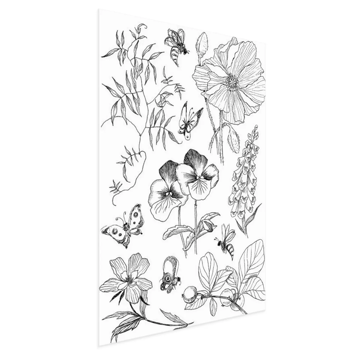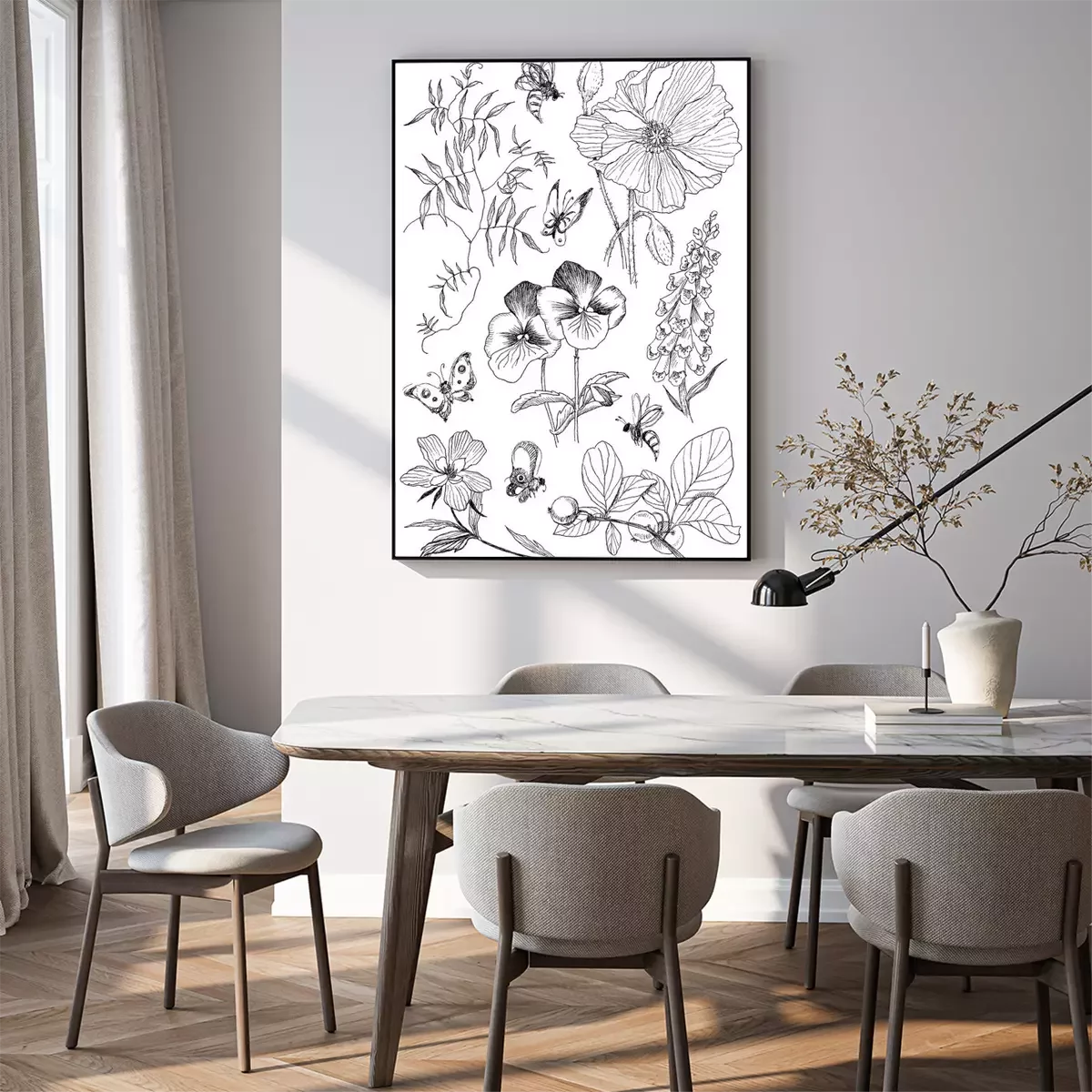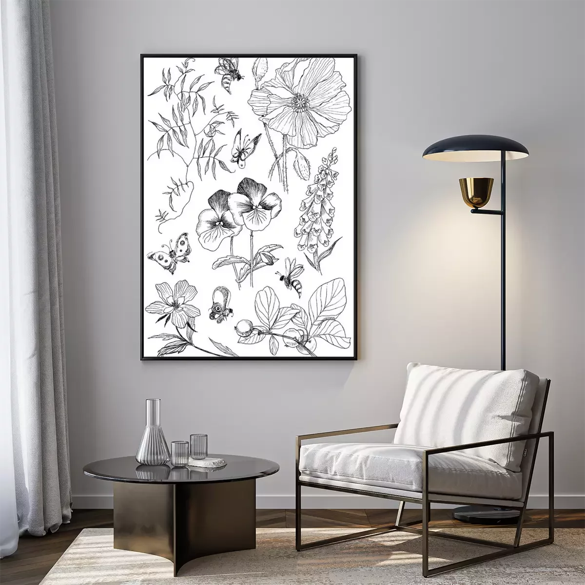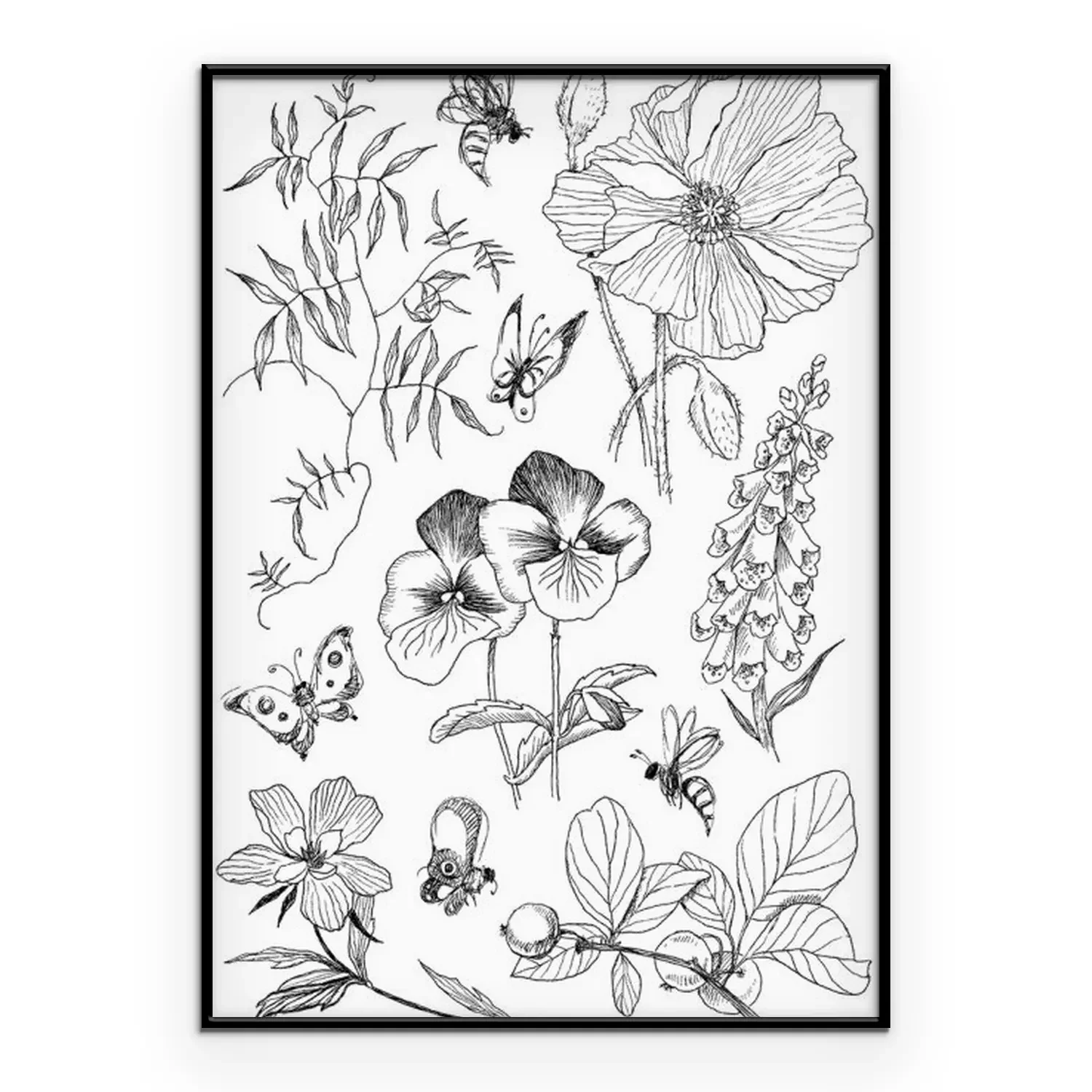 Poster  Esquisse de fleurs d'abeilles et de papillons