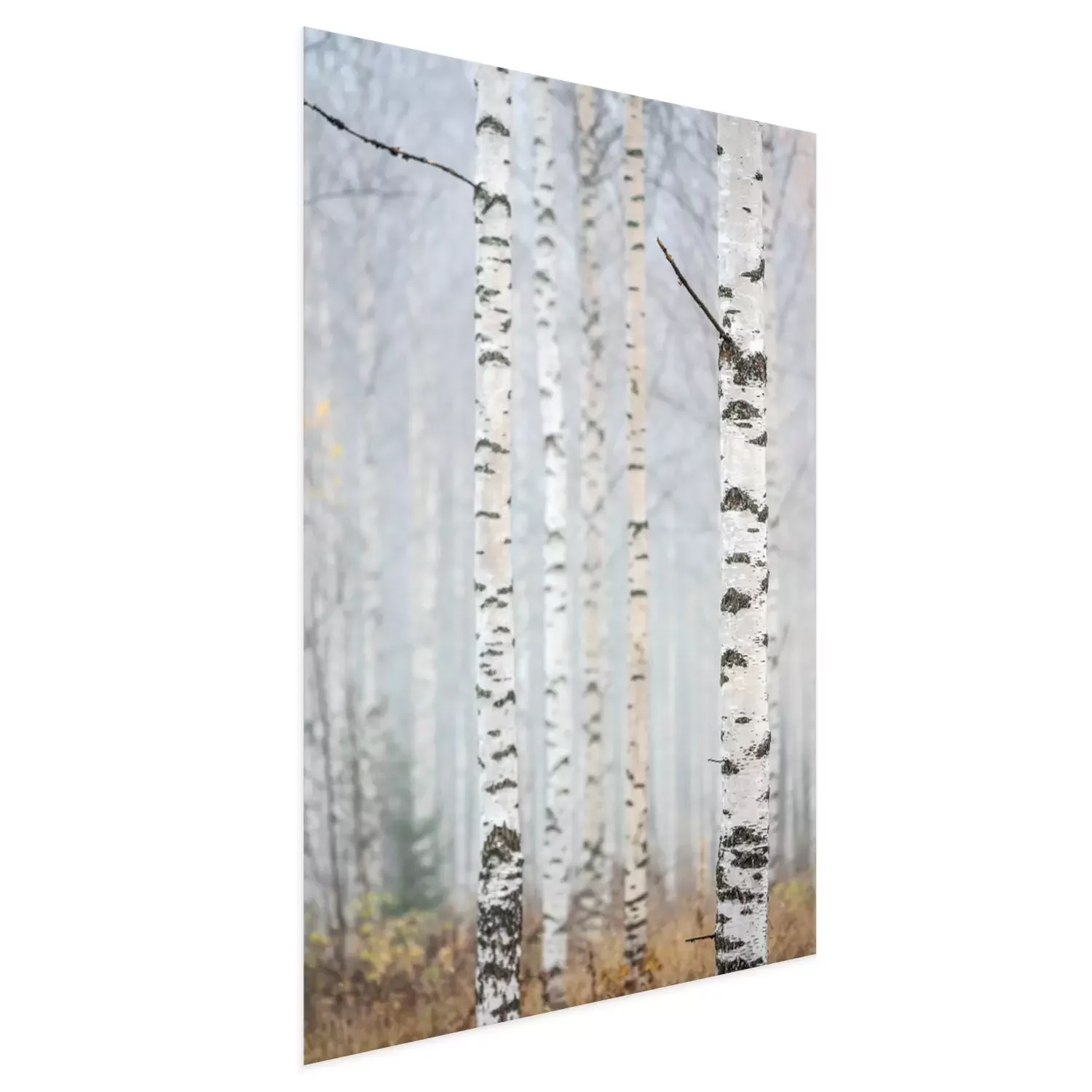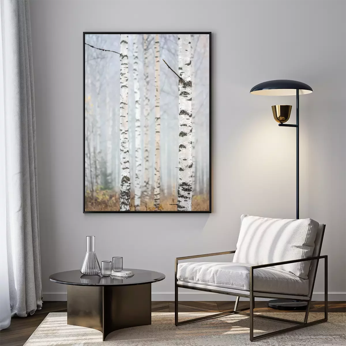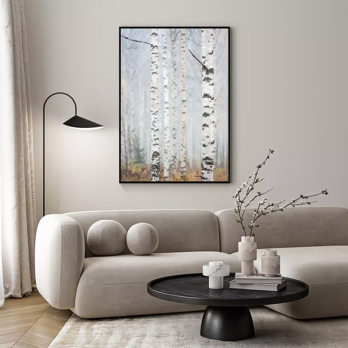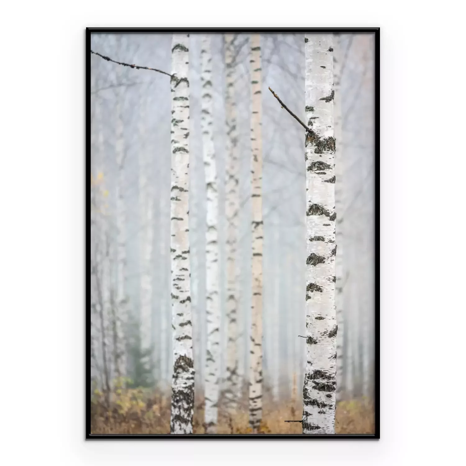 Birch forest in fog. Autumn view. Focus in foreground tree trunk.