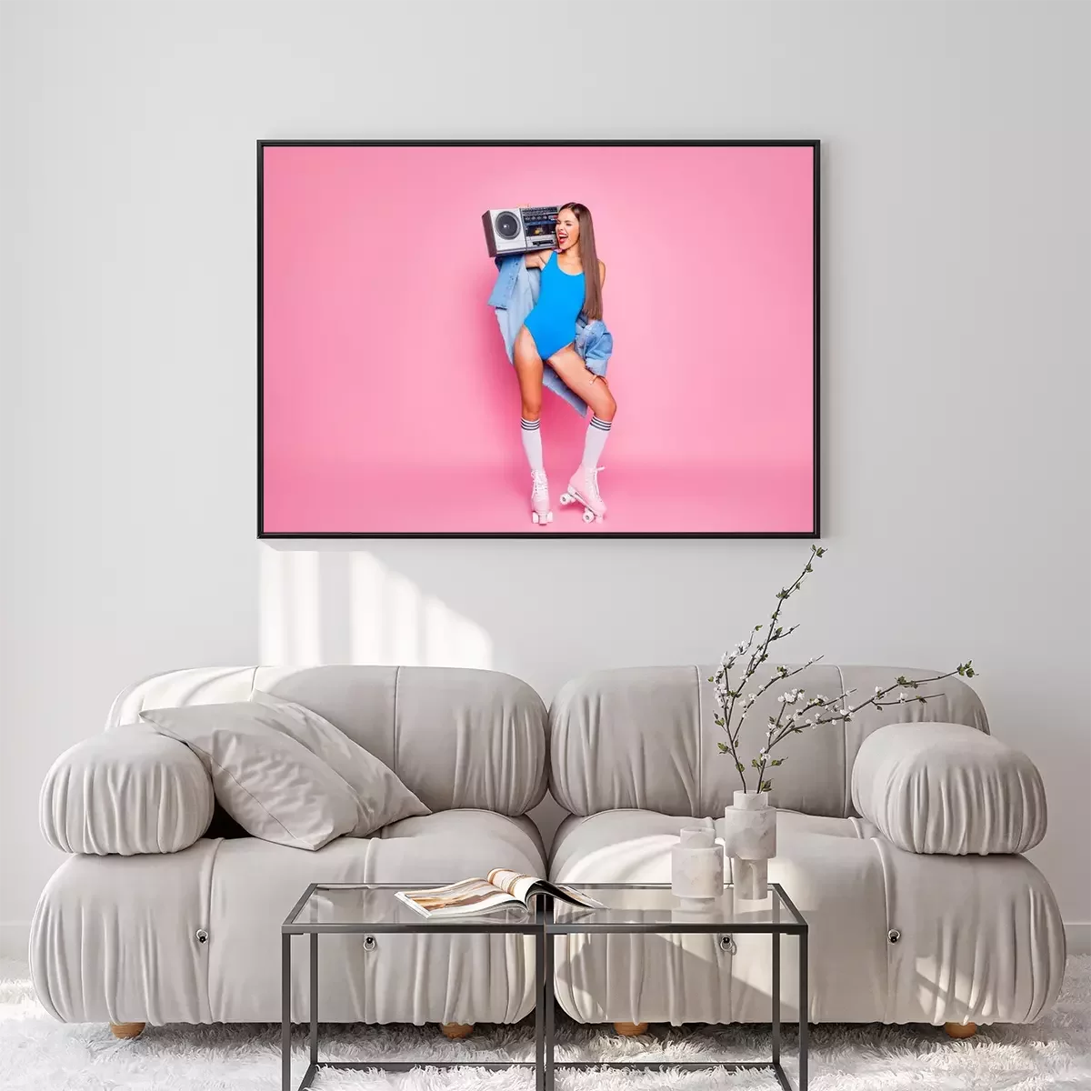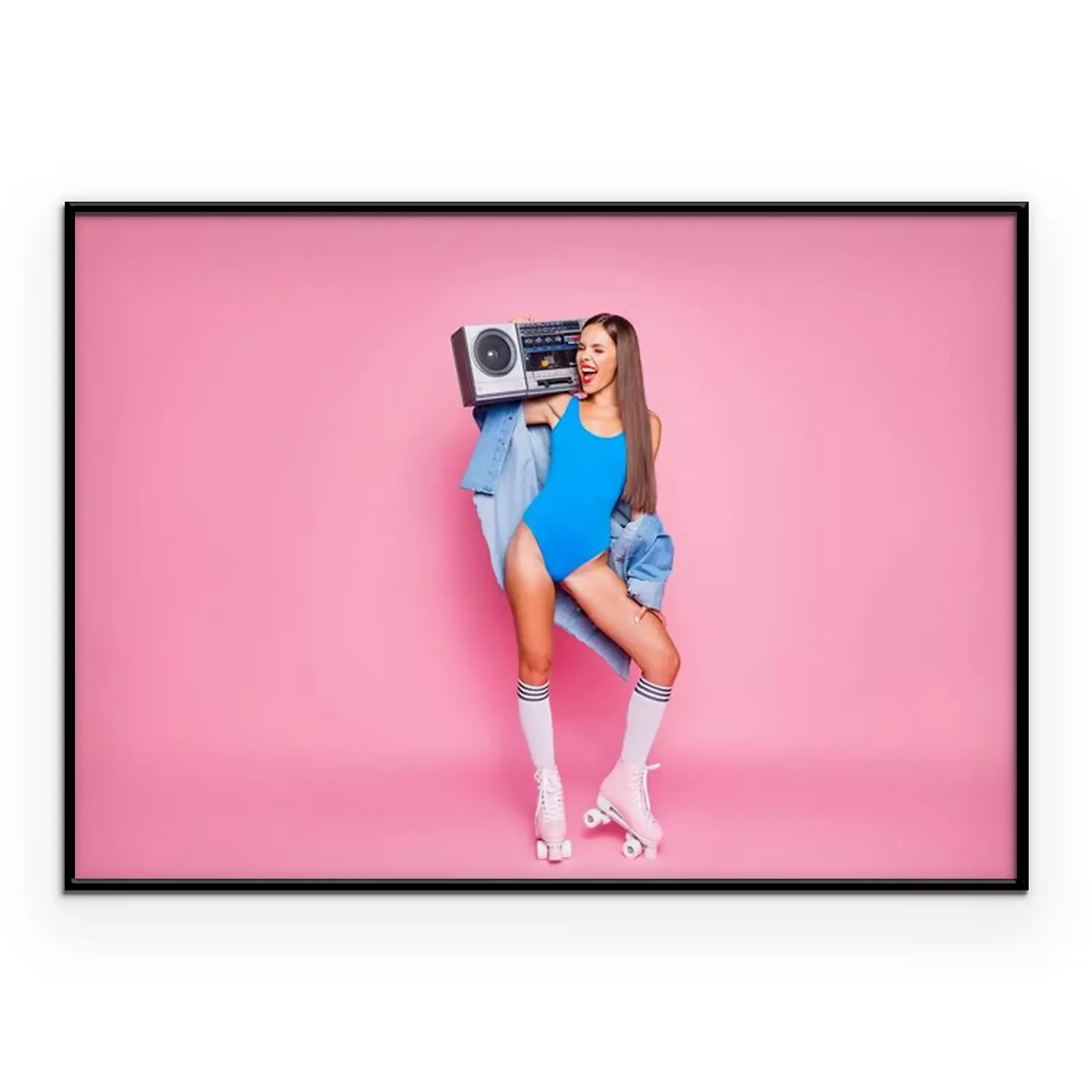 Poster  Faisons du bruit! Concept de méloman swag personnes personne loisirs passe-temps mélodie. Photo de toute la longueur de la taille du corps de la belle fille joyeuse folle excitée tenant une radio sur