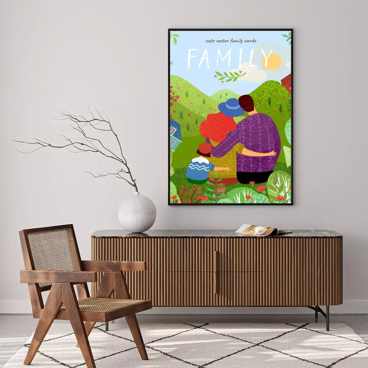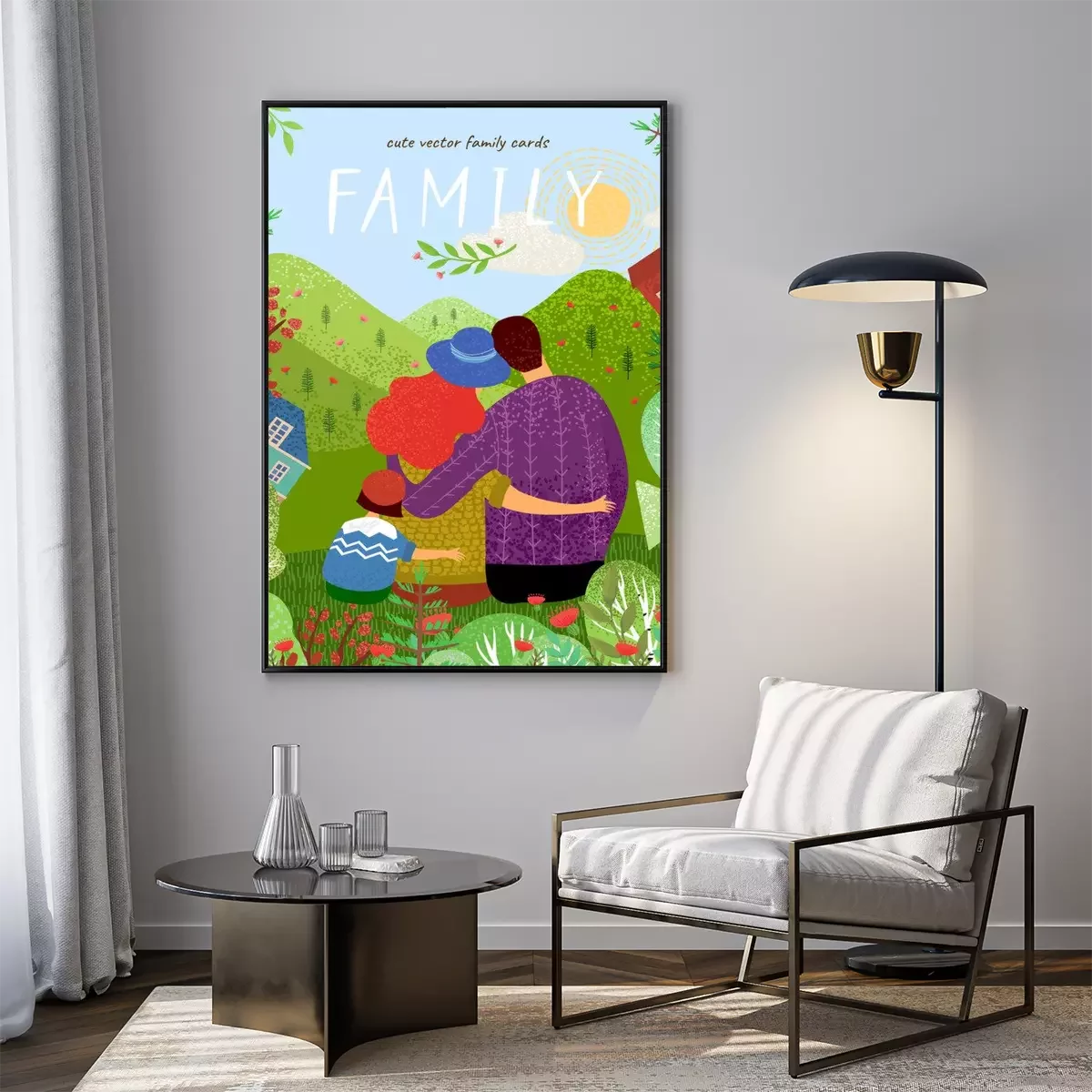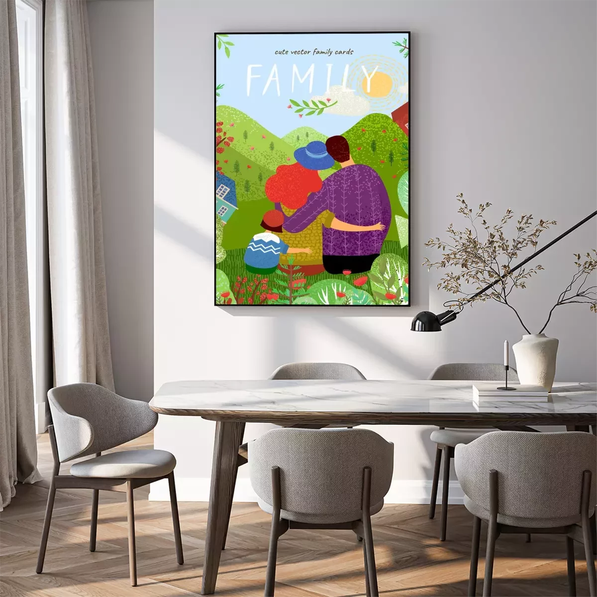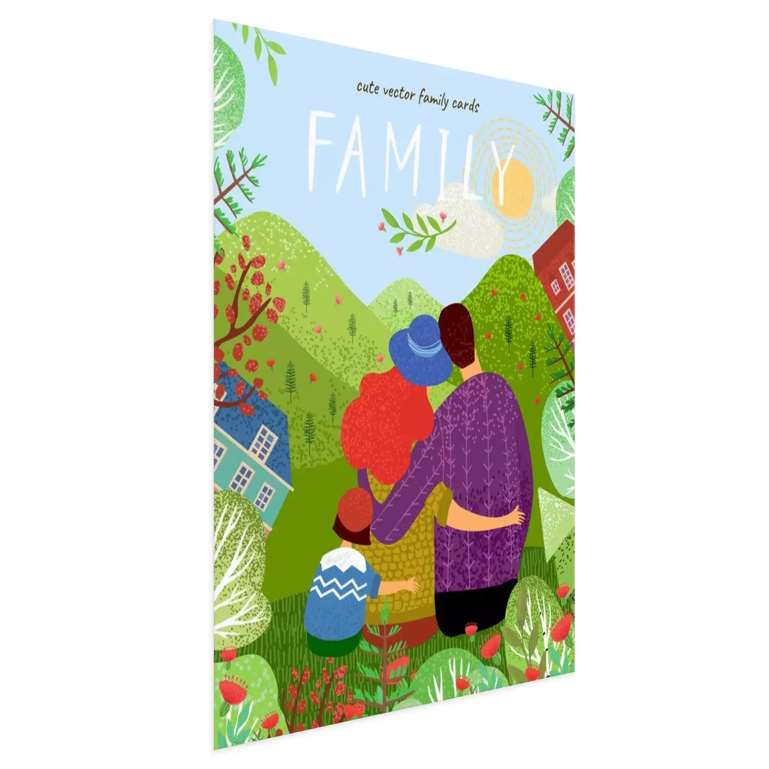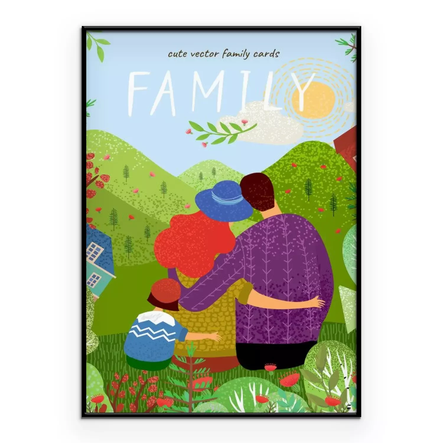 Poster : famille heureuse. Affiche de vecteur mignon, carte ou couverture avec une illustration d'un père, mère et bébé nouveau-né sur un fond de verdure, de montagnes et de paysages forestiers avec des fleurs
