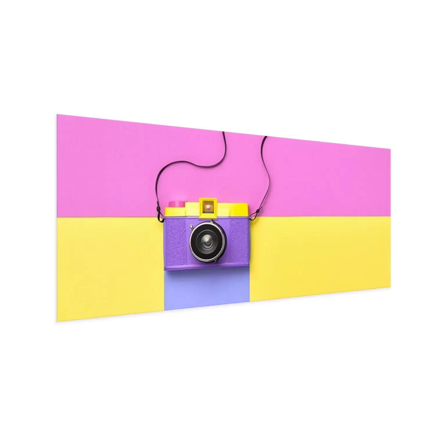 Poster  Fashion film camera. Minimal hipster summer trend flat lay. Retro design camera on vivid color. Summertime concept. Trendy fashionable film camera, creative pop art