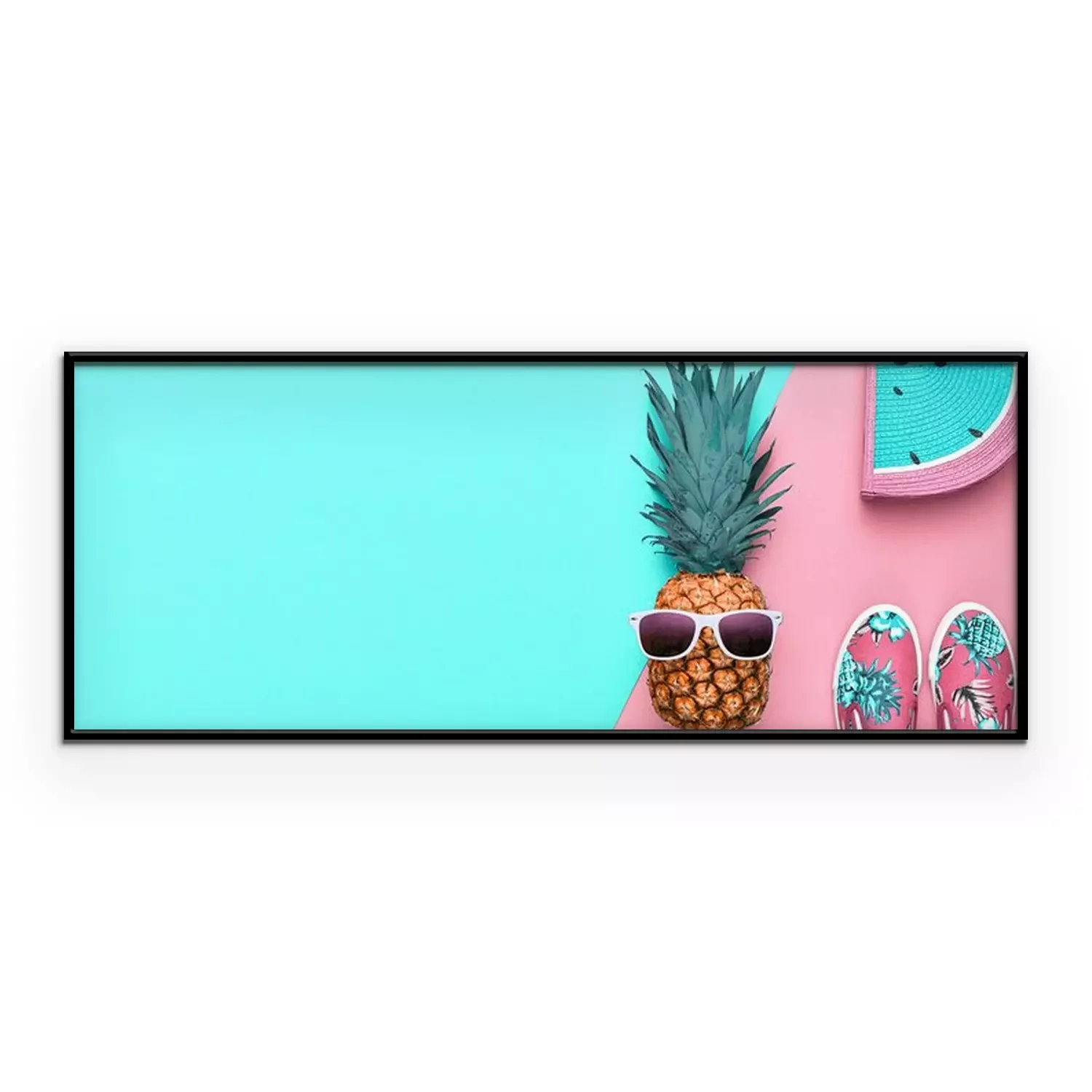 Poster  Fashion. Pineapple hipster in sunglasses, stylish sneakers, handbag. Minimal concept, summer accessories, tropical pineapple. Creative art fashionable concept, summertime, banner