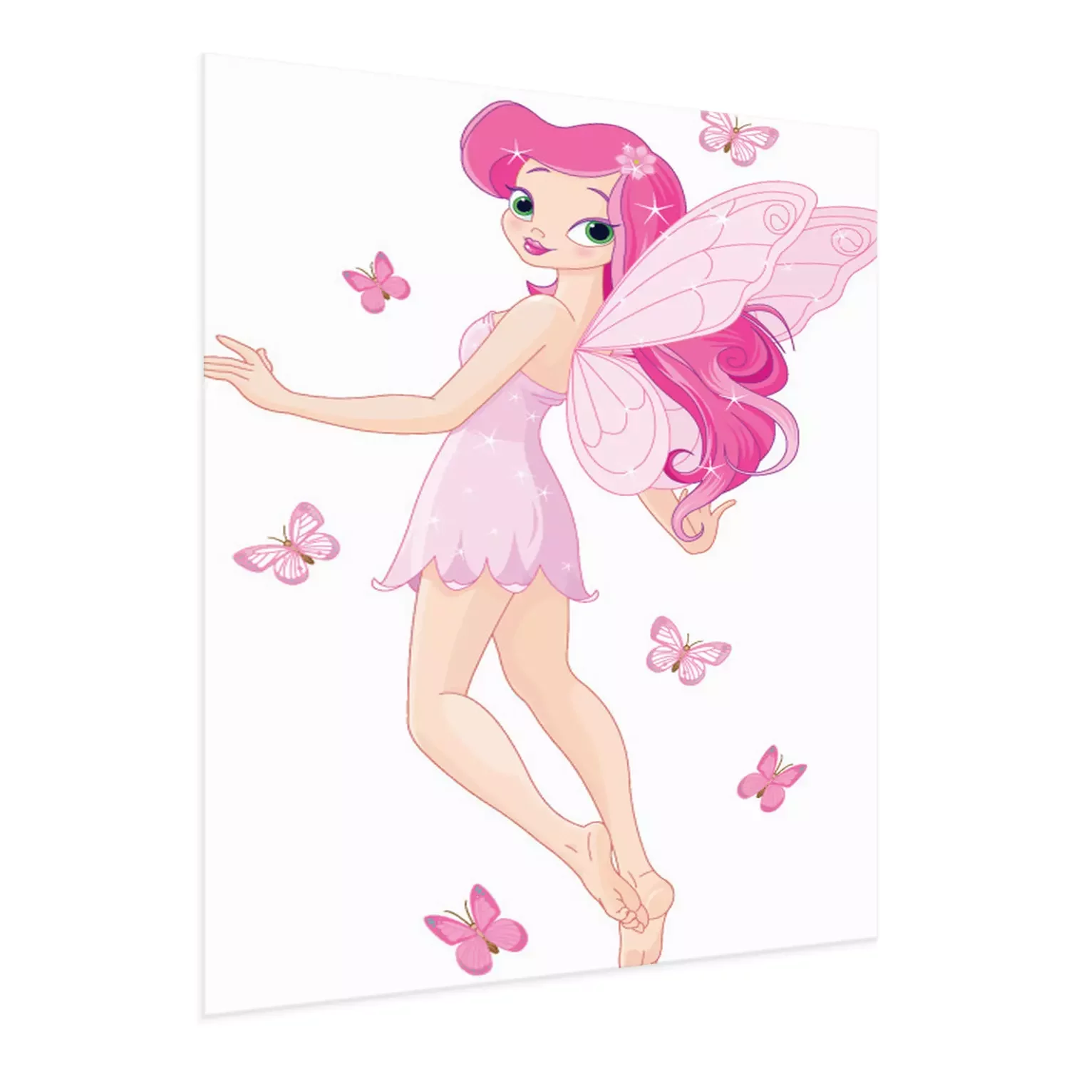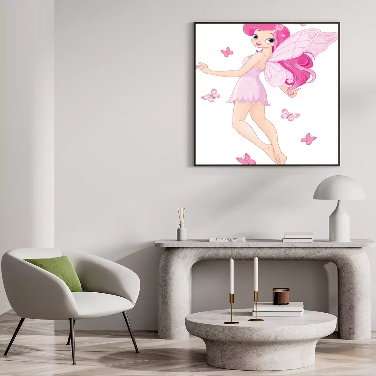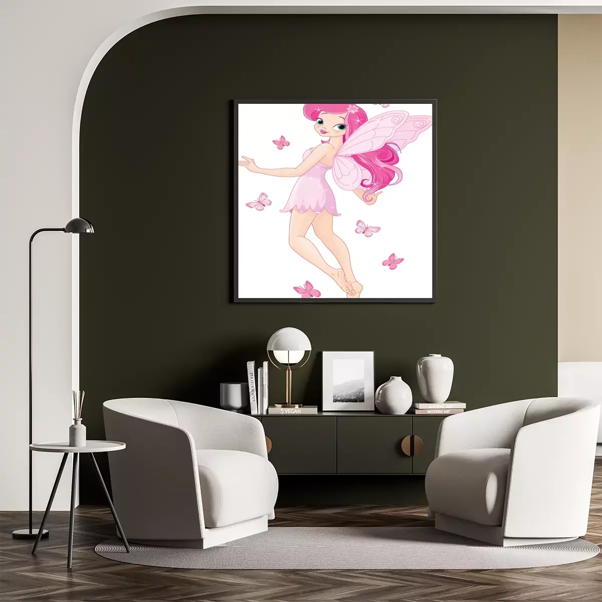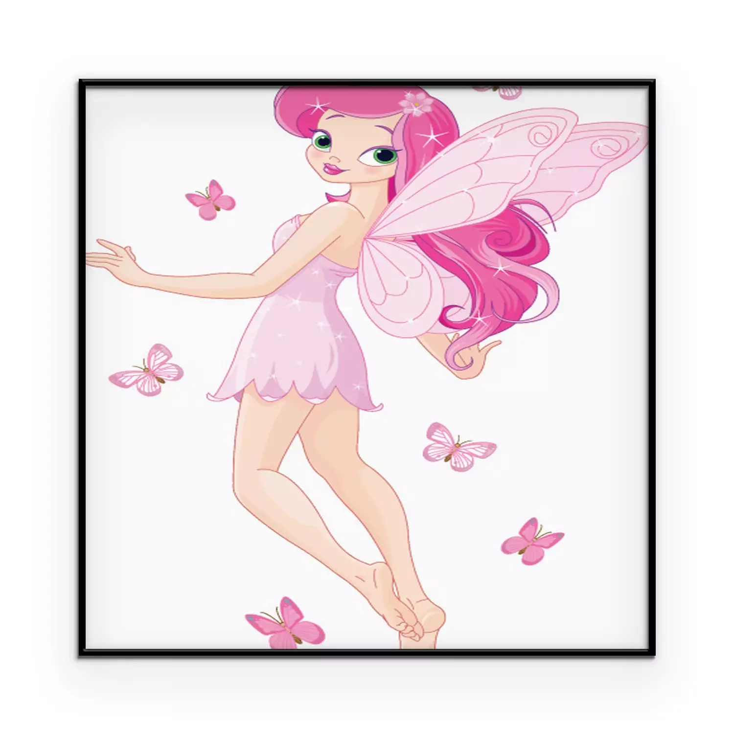 Une fée ailée aux cheveux roses entourée de petits papillons