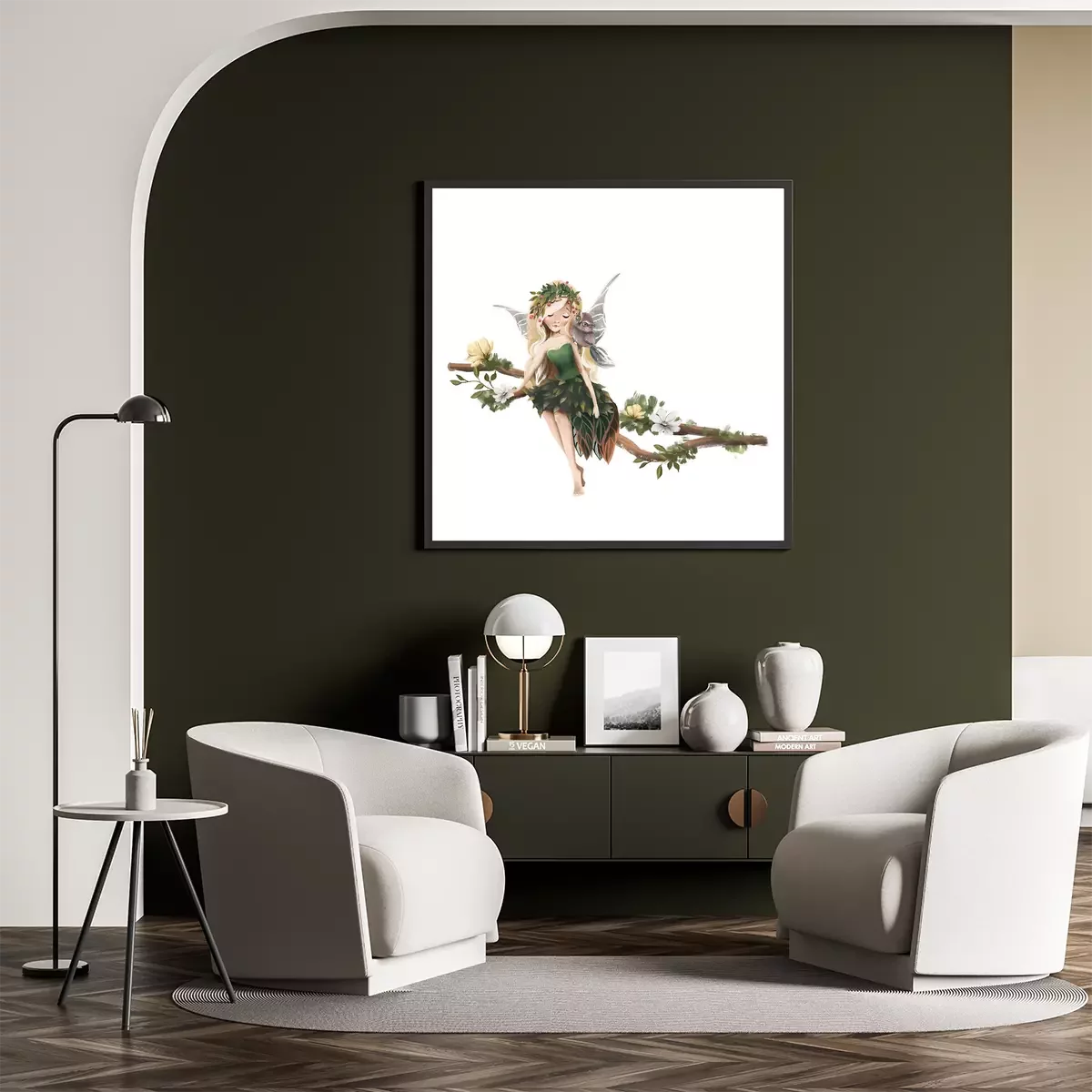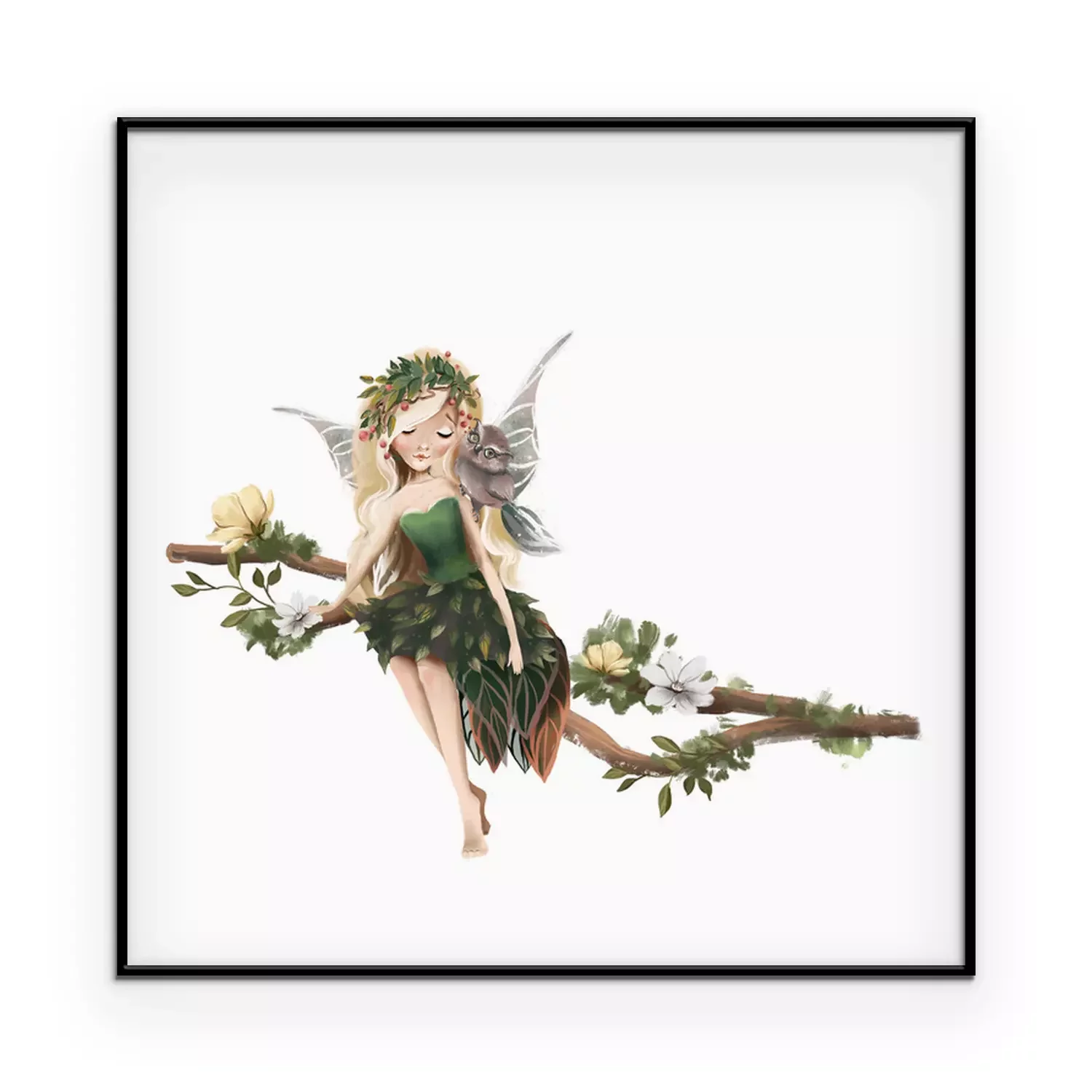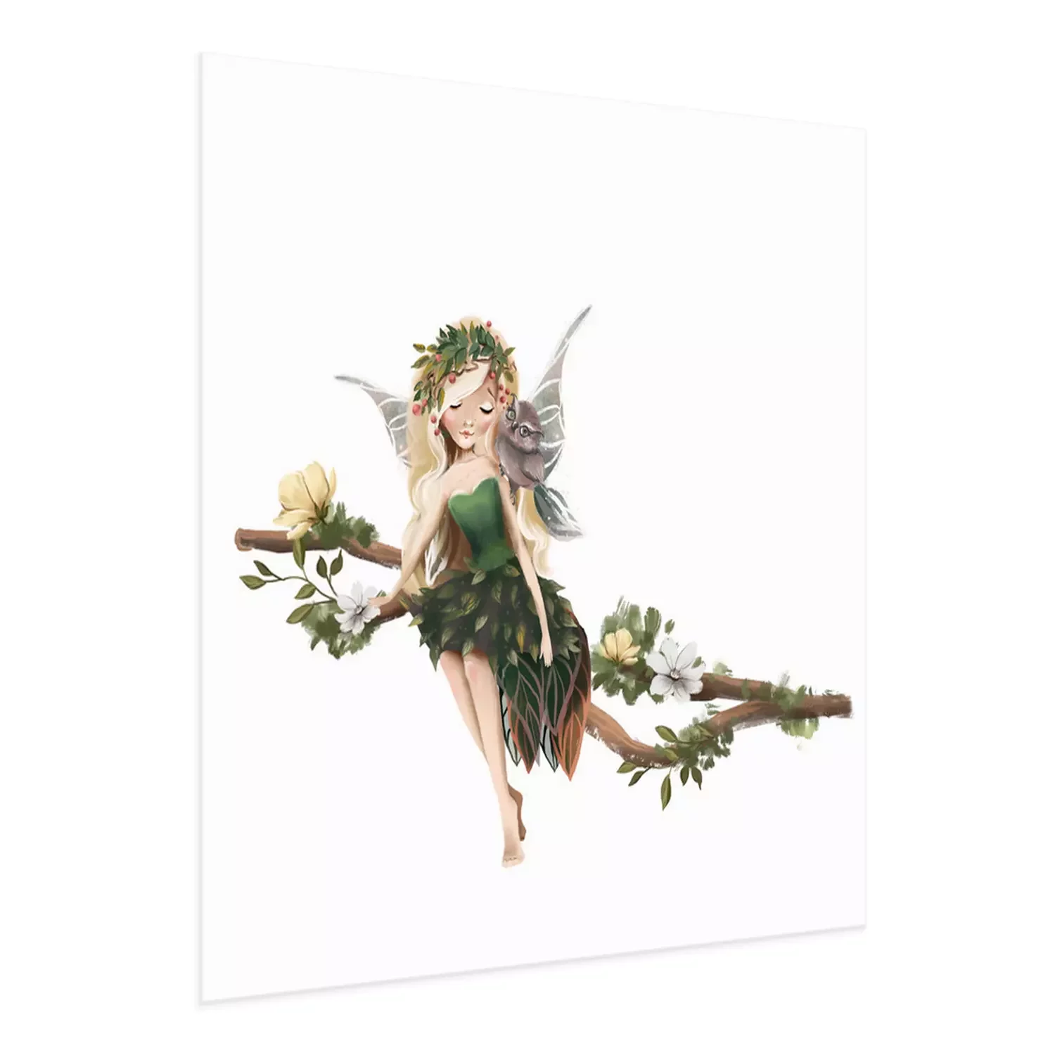 Poster : Fée de la forêt sur une branche couverte de fleurs