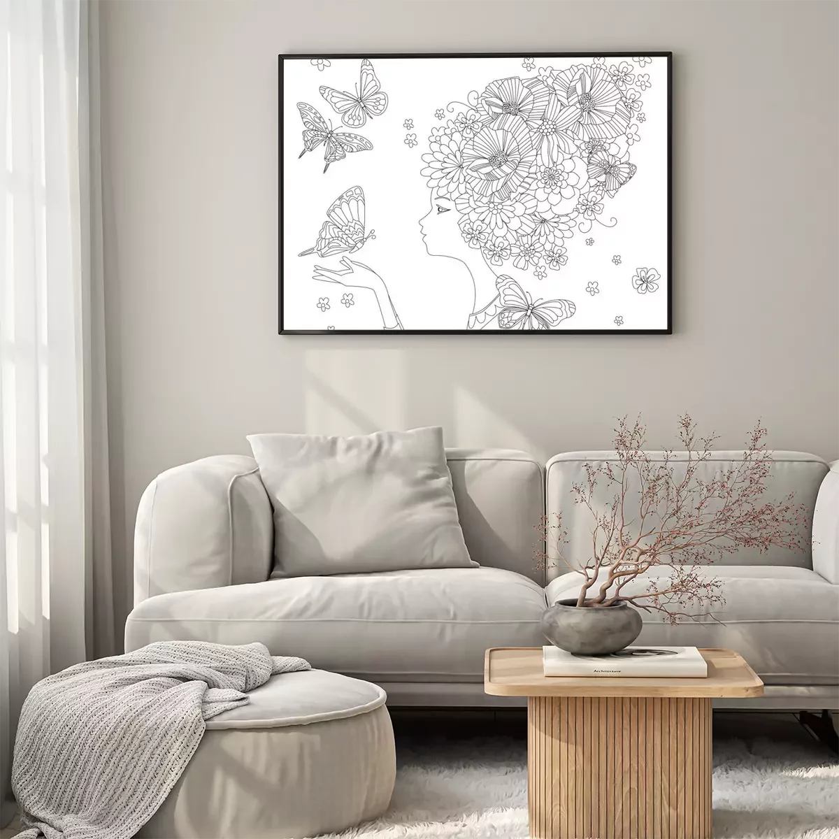 Poster  Femme avec des fleurs au lieu de cheveux et de papillons