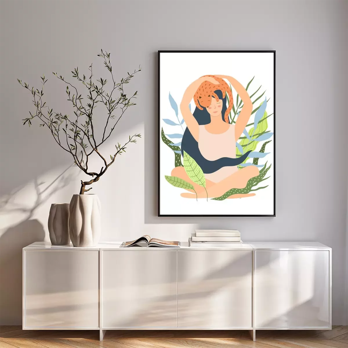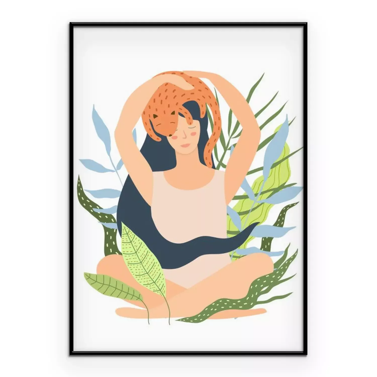 Poster  Femme détendue avec un chat sur la tête