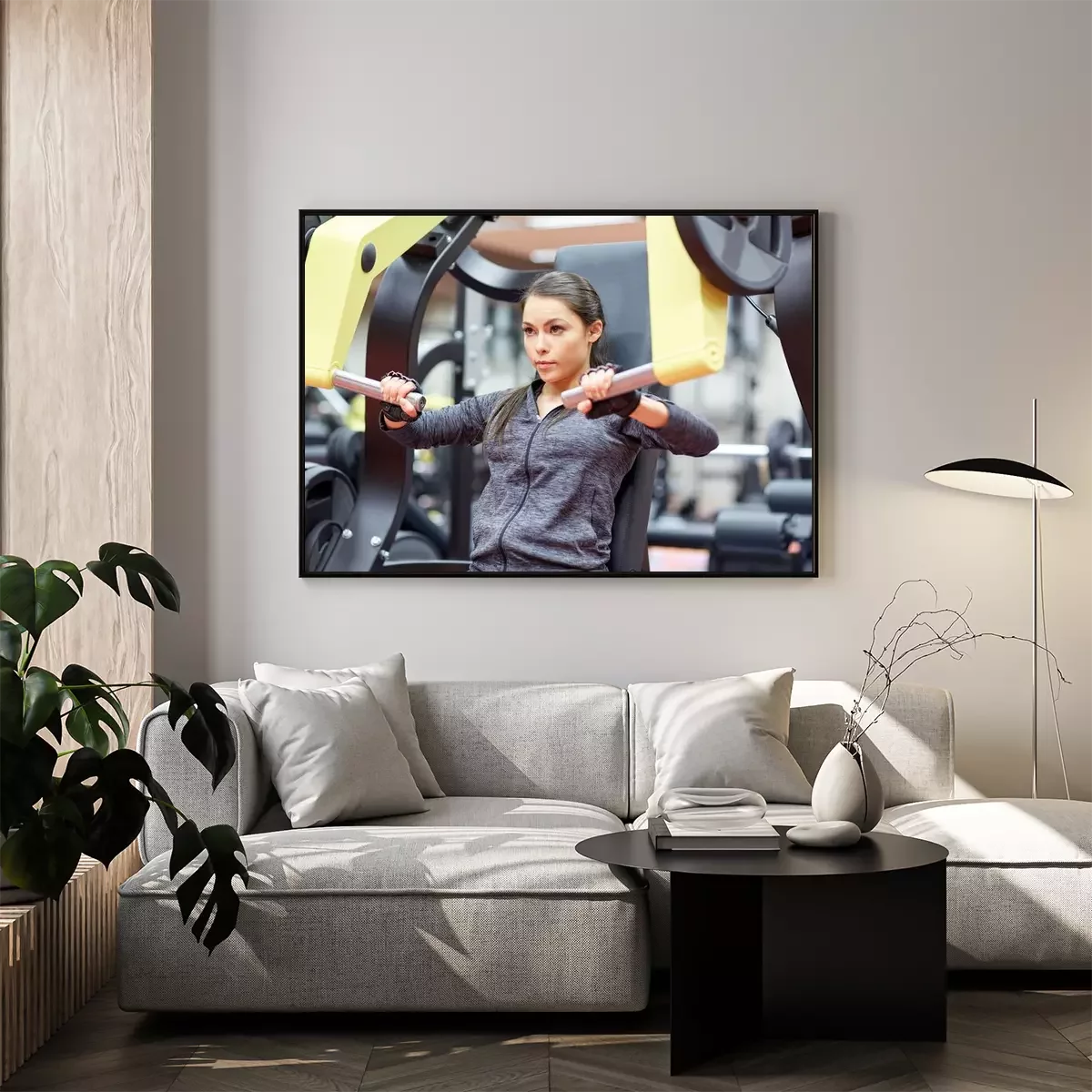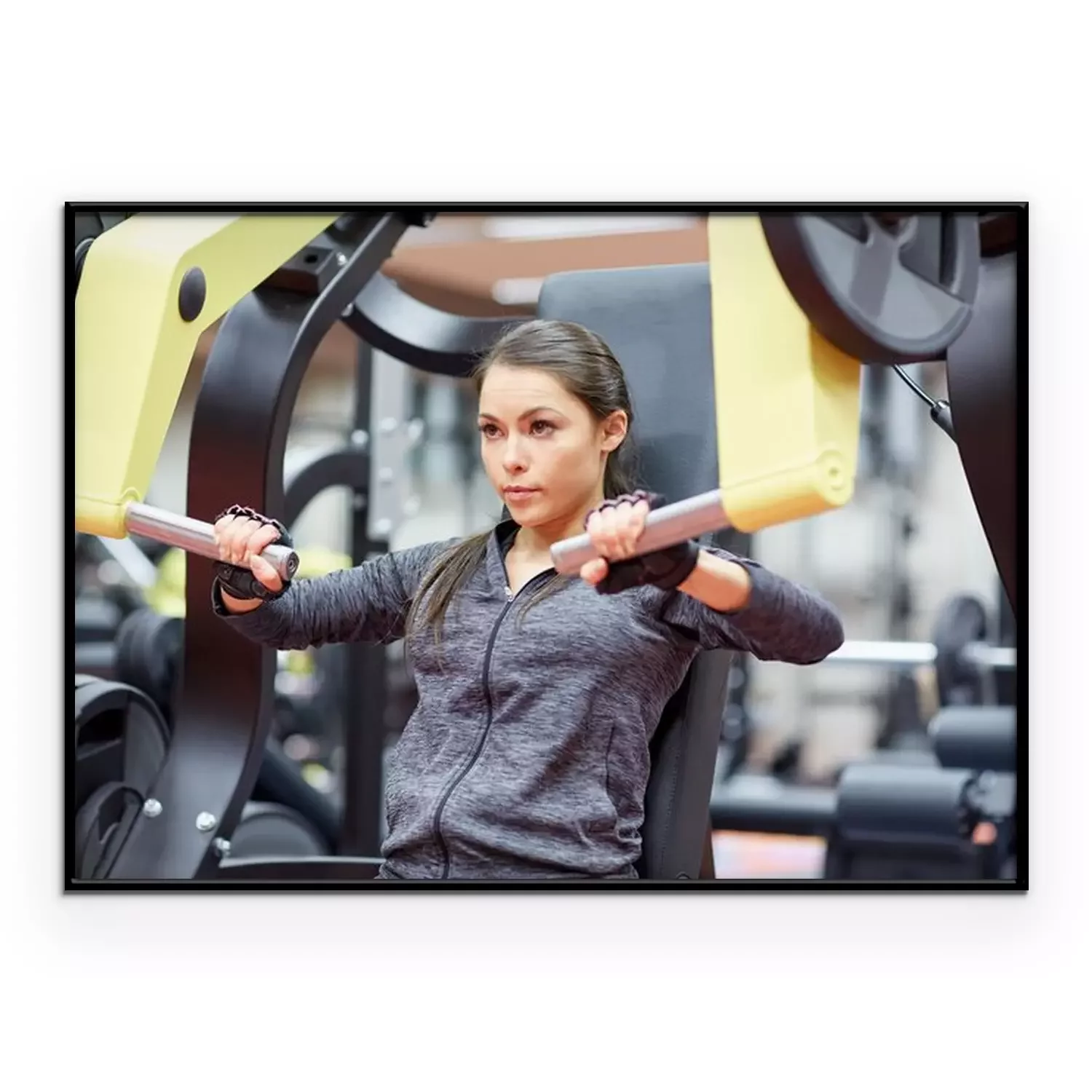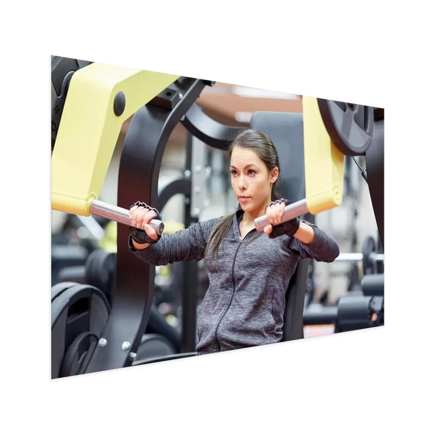 Poster : Femme, fléchir, muscles, poitrine, presse, gym, machine