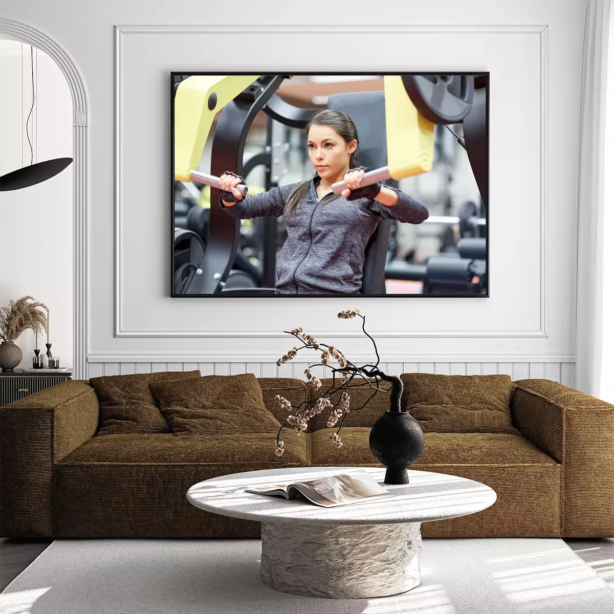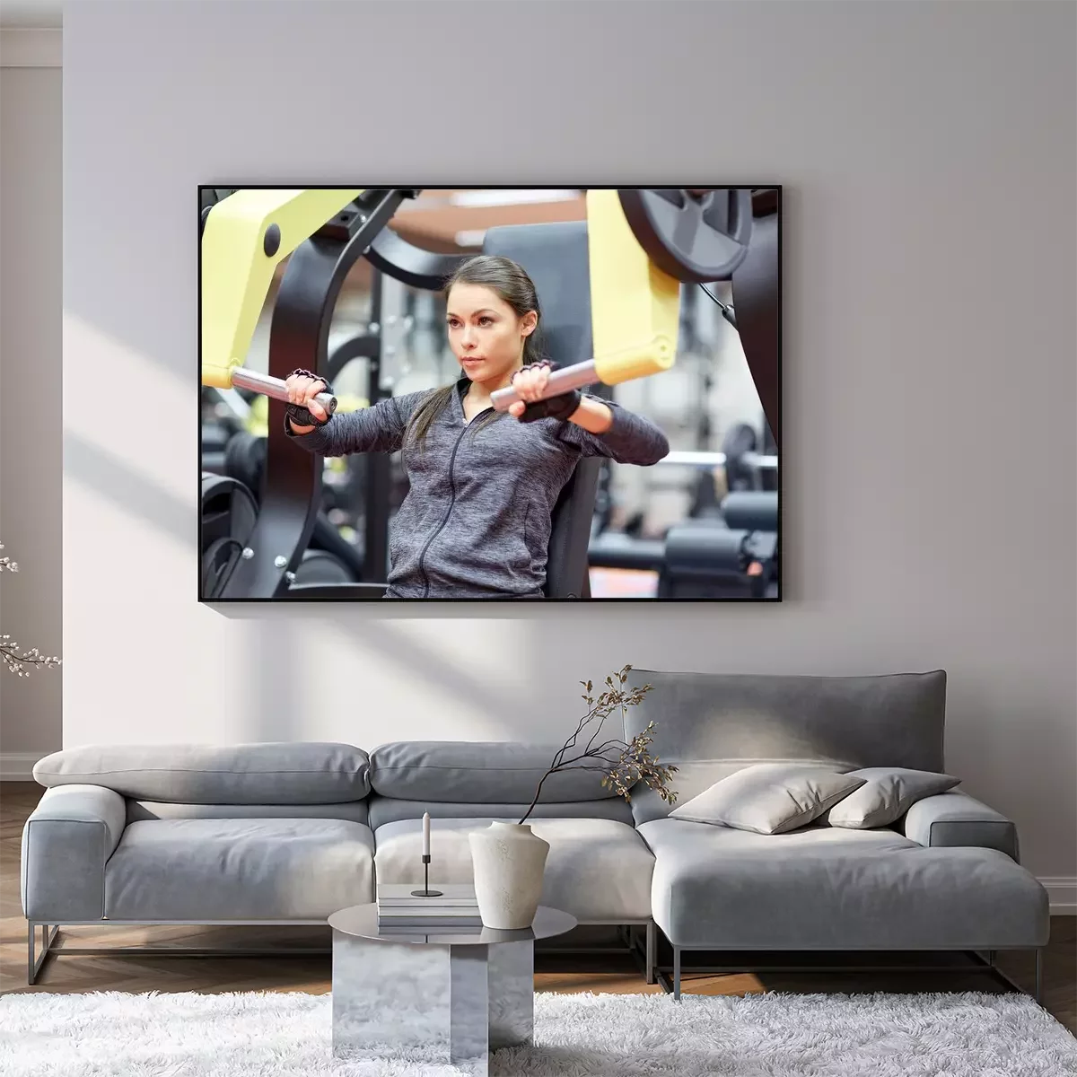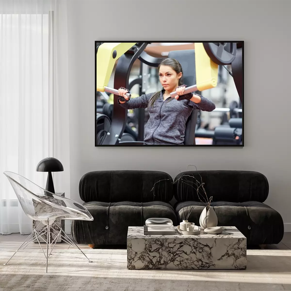 Poster : Femme, fléchir, muscles, poitrine, presse, gym, machine