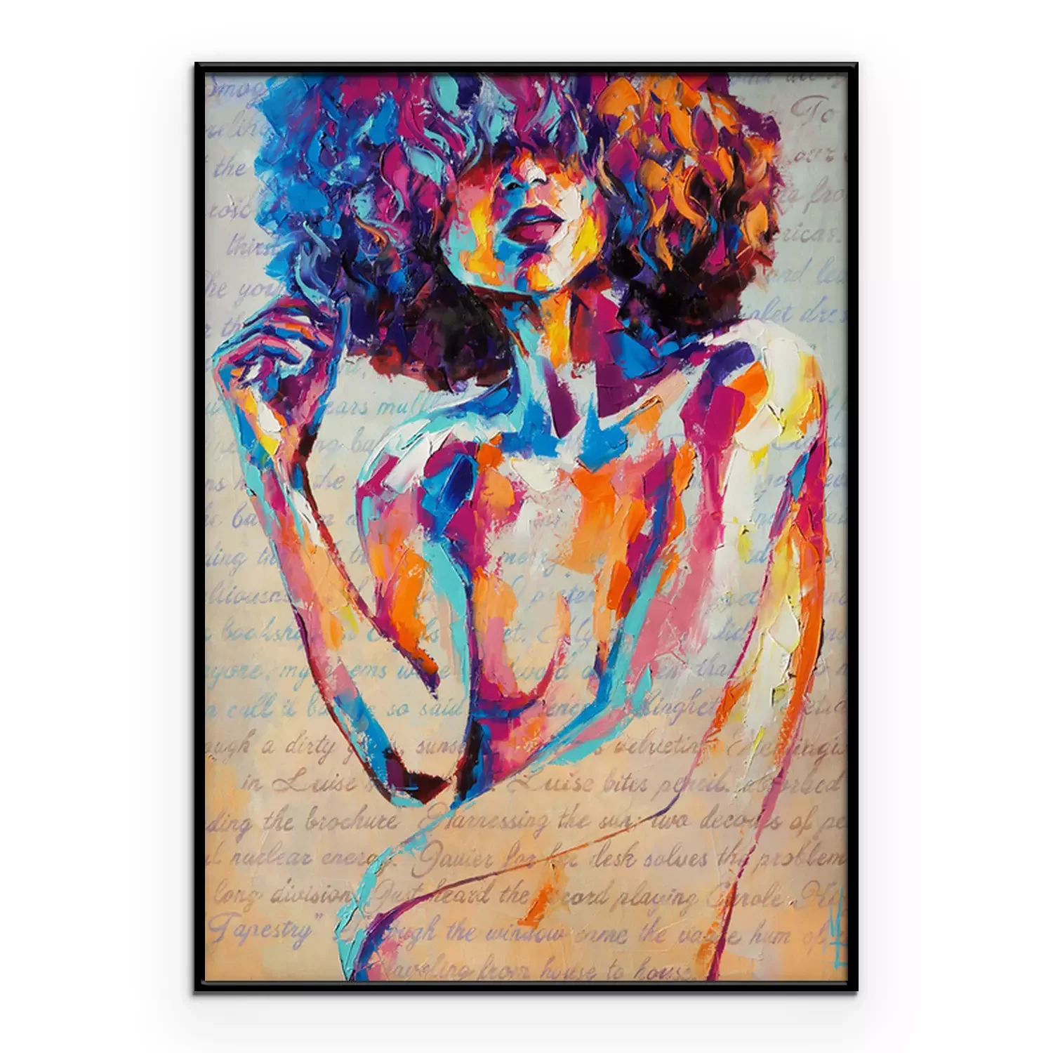 “Louise” - oil painting. Conceptual abstract picture of a beautiful girl. On the background is written text from a book. Conceptual abstract closeup of an oil painting and palette knife on canvas.
