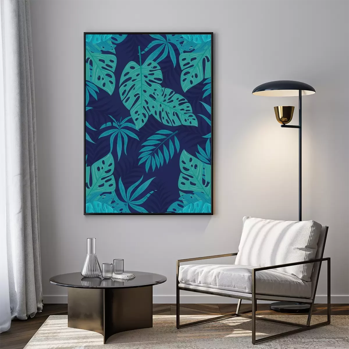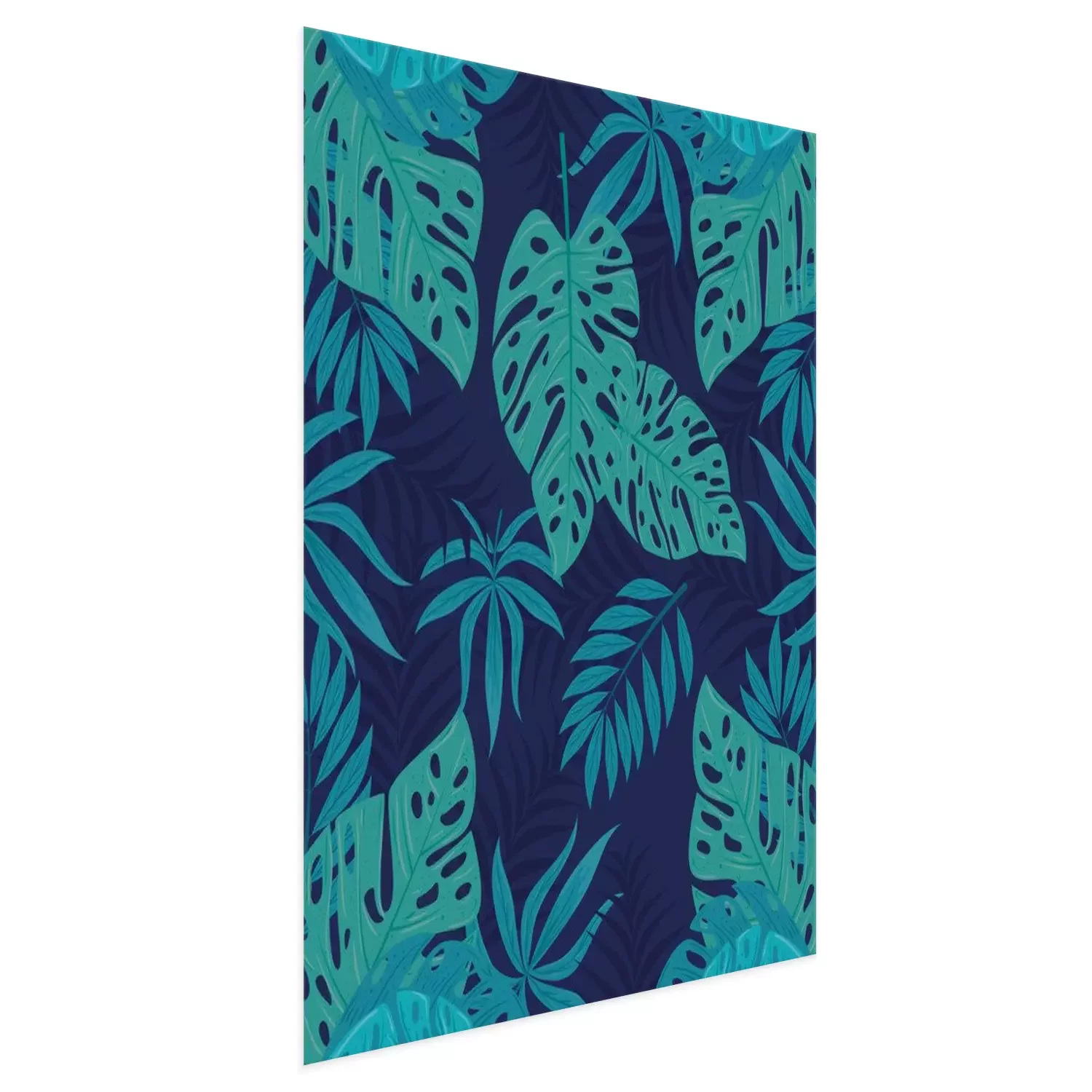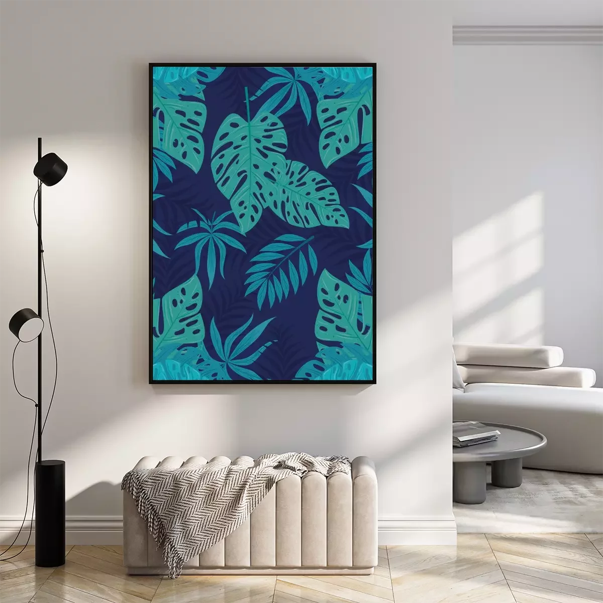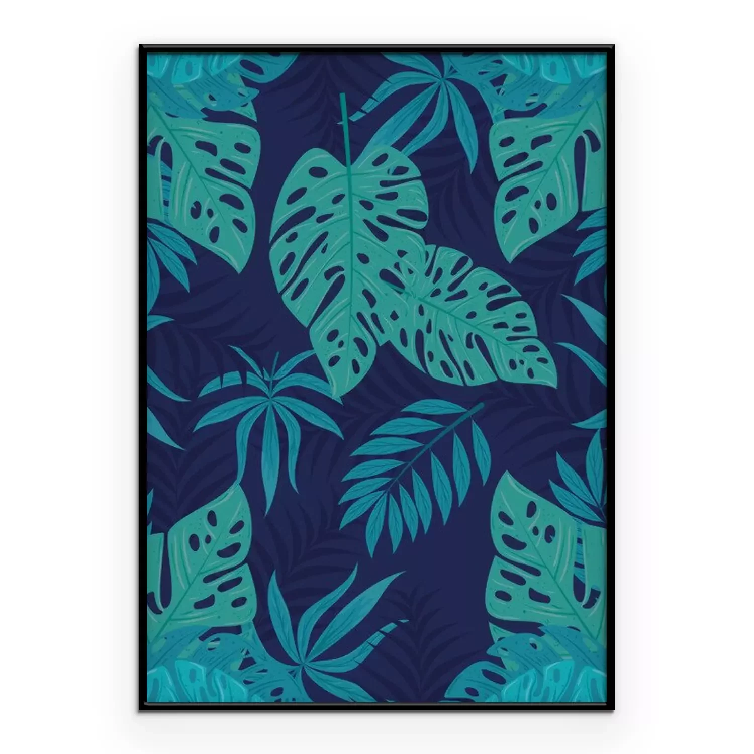 Poster : Feuilles bleues et vertes sur fond bleu foncé