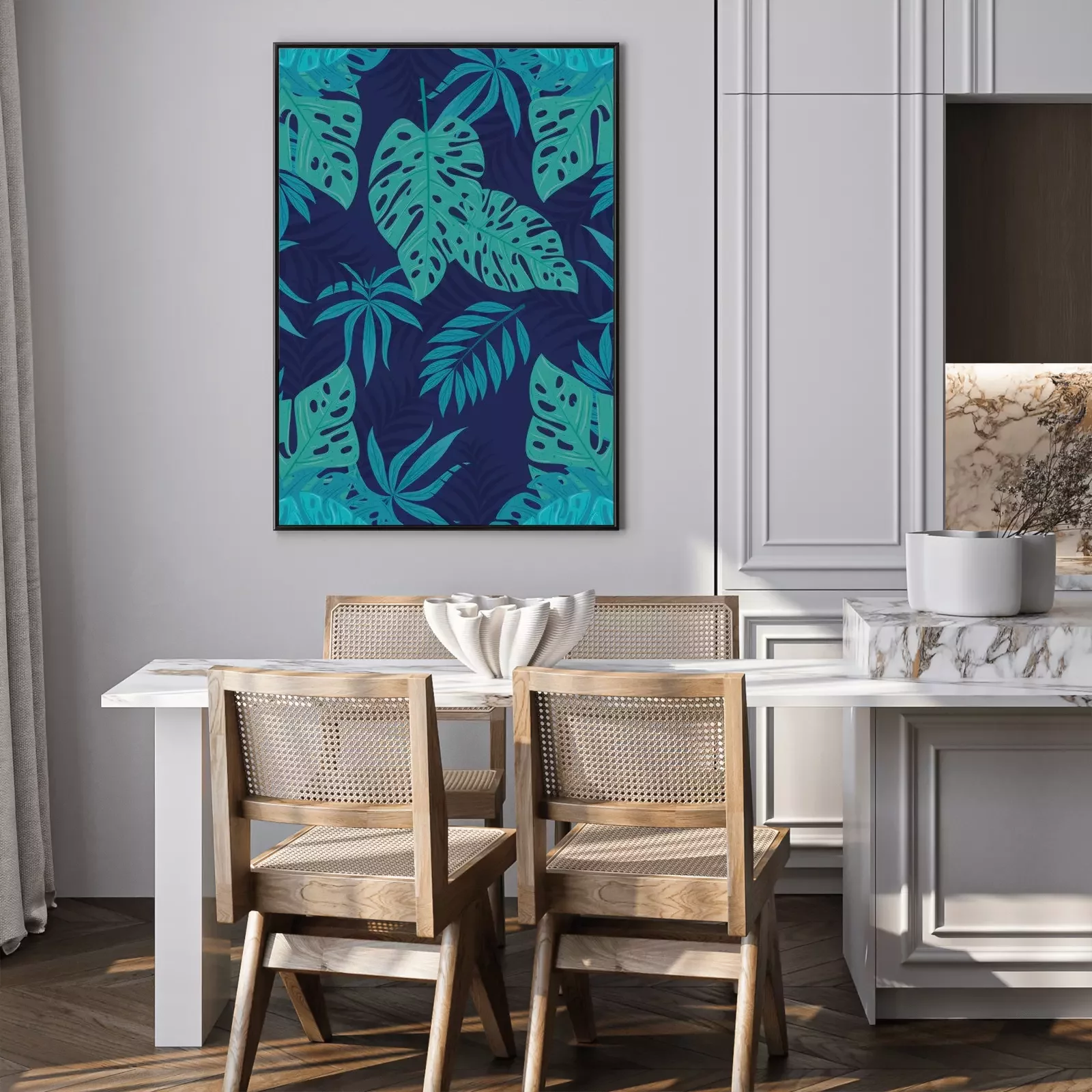 Poster  Feuilles bleues et vertes sur fond bleu foncé
