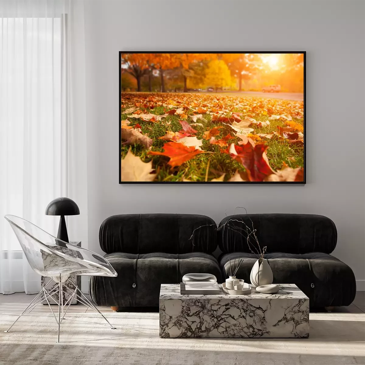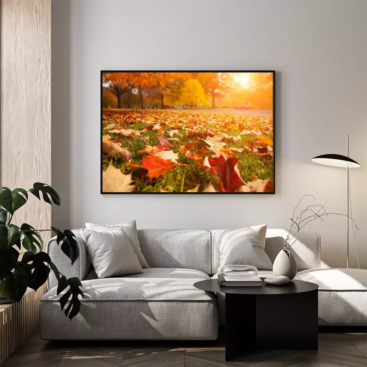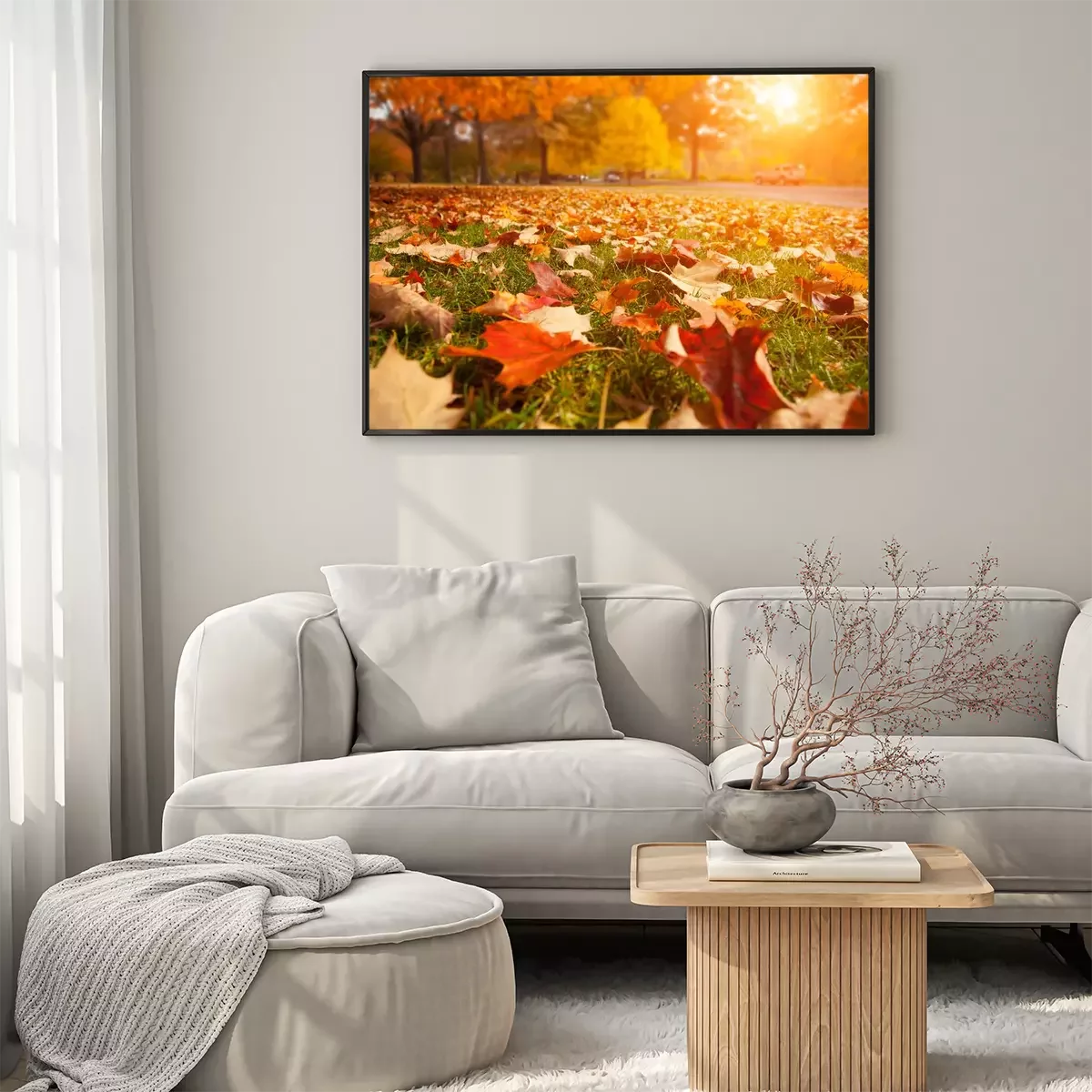 Poster : Feuilles d'automne sur l'herbe en bordure de route