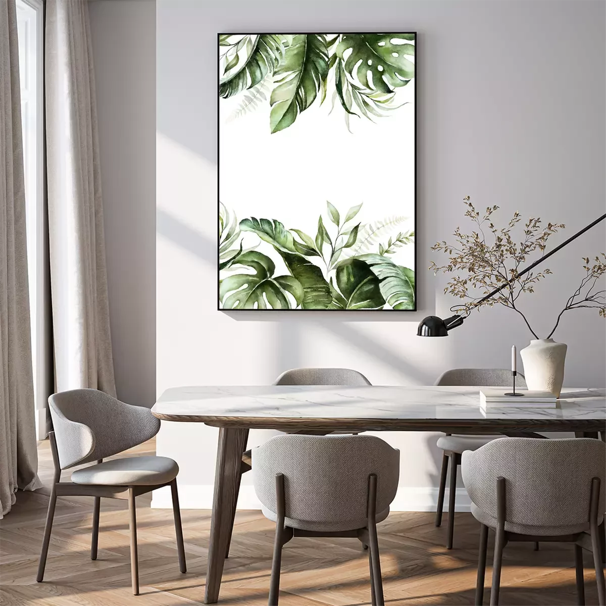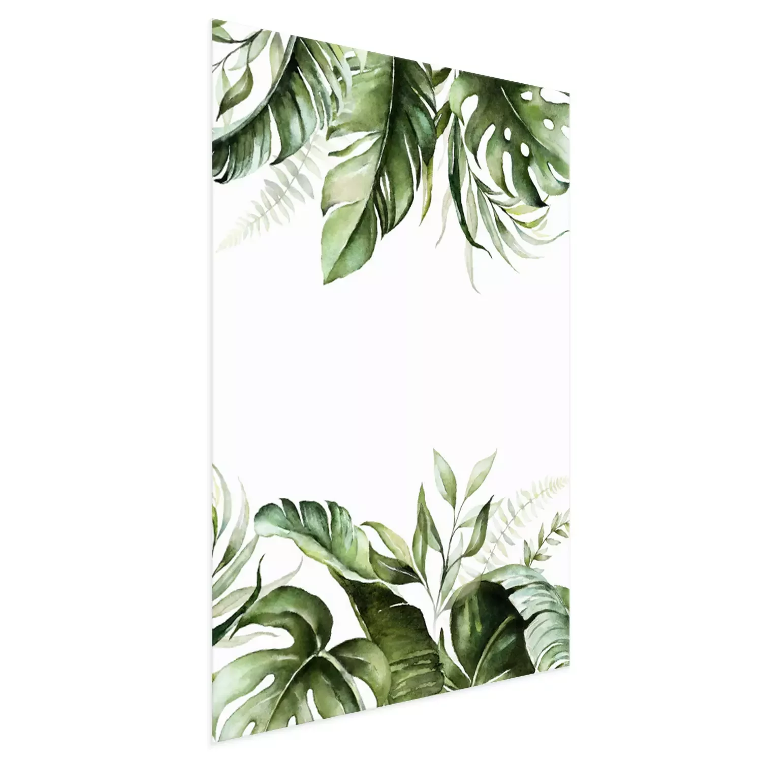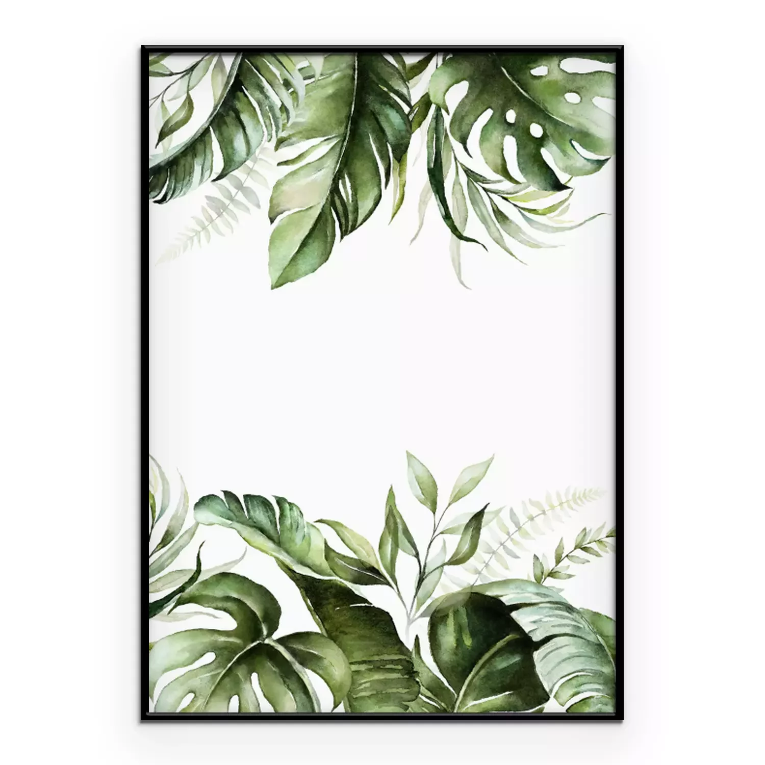 Green tropical leaves on white background. Watercolor hand painted seamless border. Floral tropic illustration. Jungle foliage pattern.
