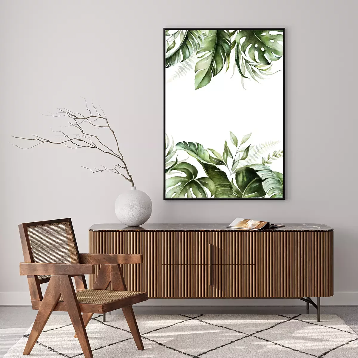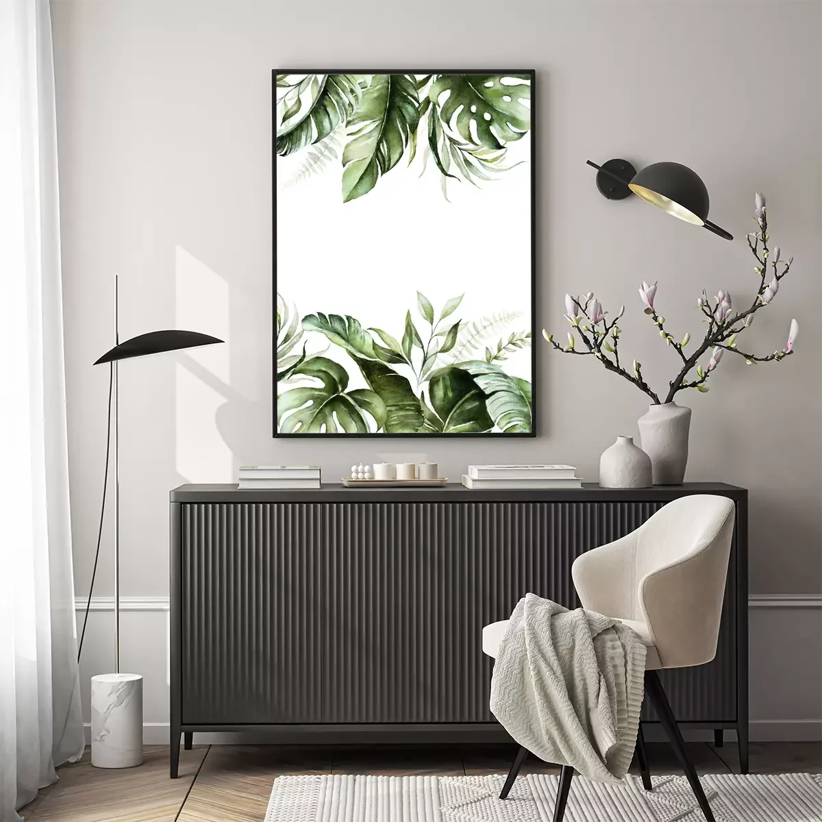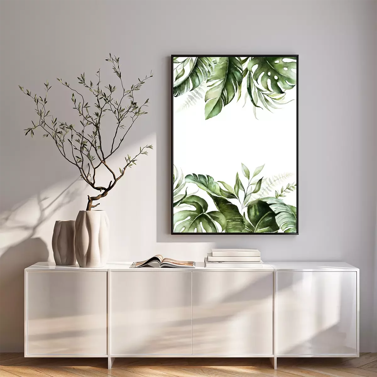 Green tropical leaves on white background. Watercolor hand painted seamless border. Floral tropic illustration. Jungle foliage pattern.