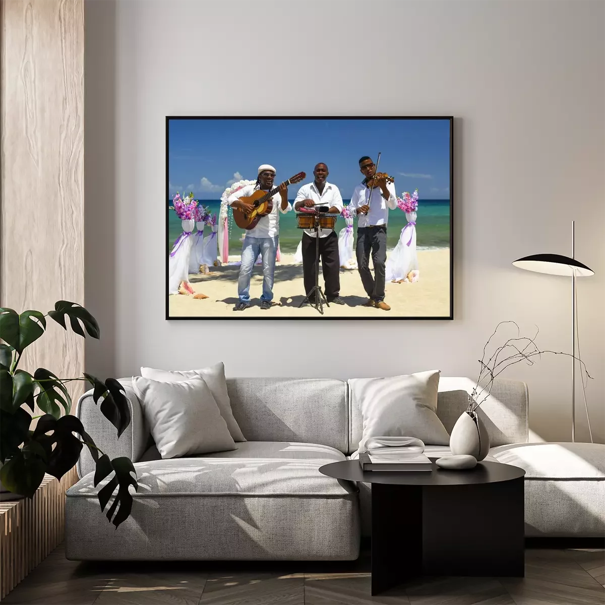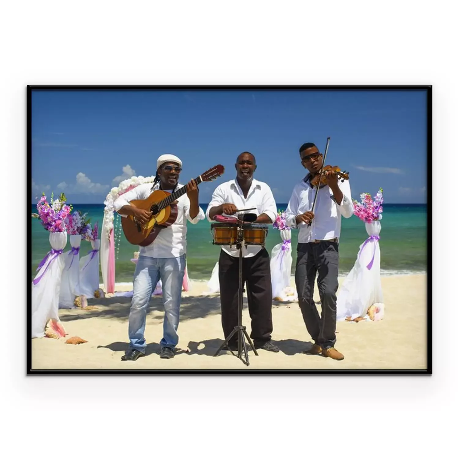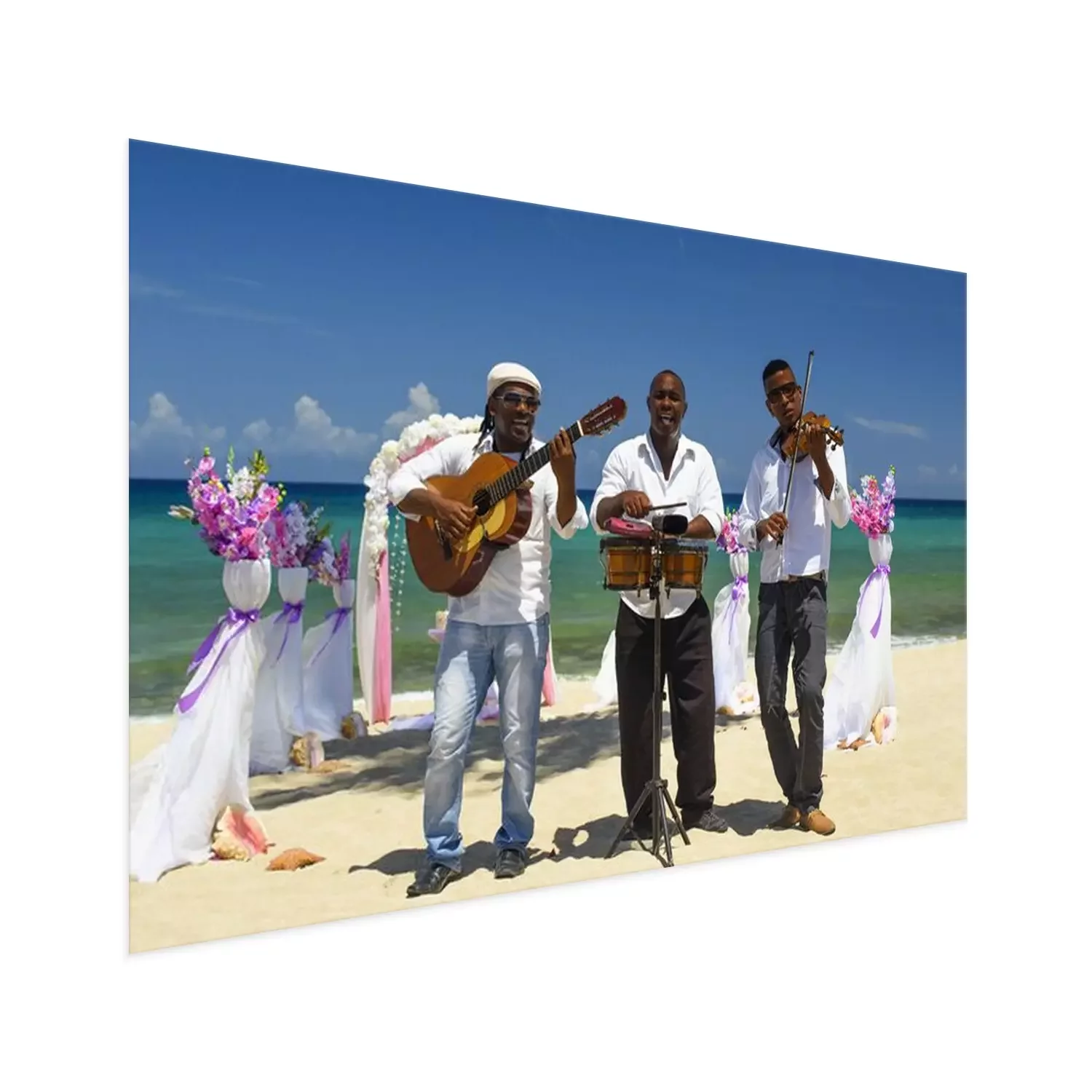 Poster : Fiddler, guitariste et batteur en chemise blanche et chapeau gris jouent des instruments de musique sur la plage