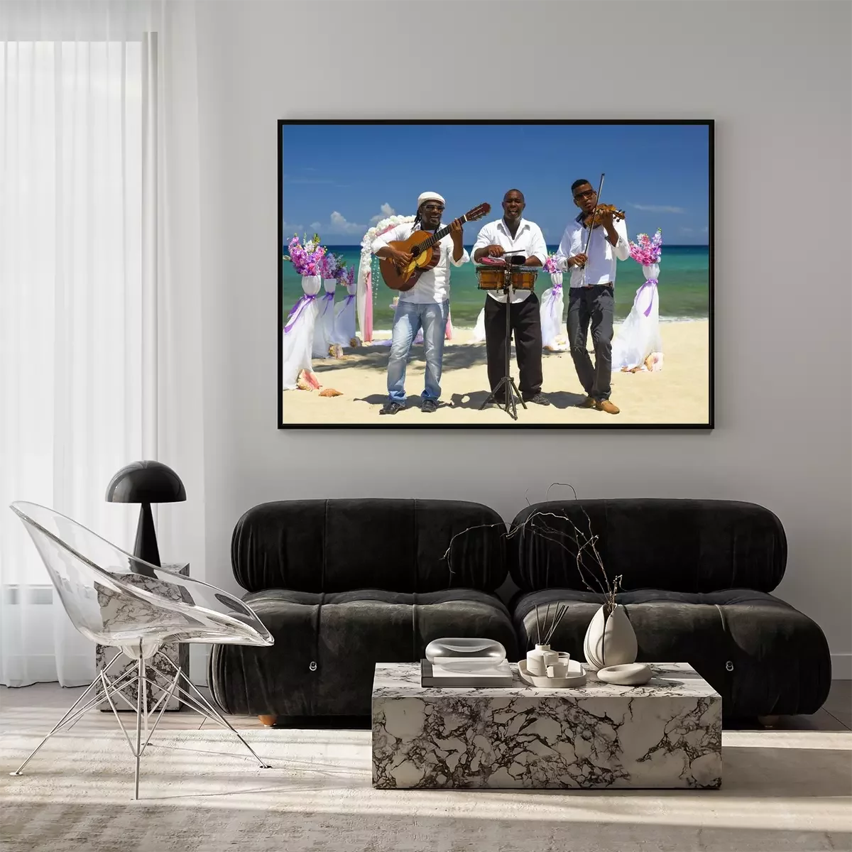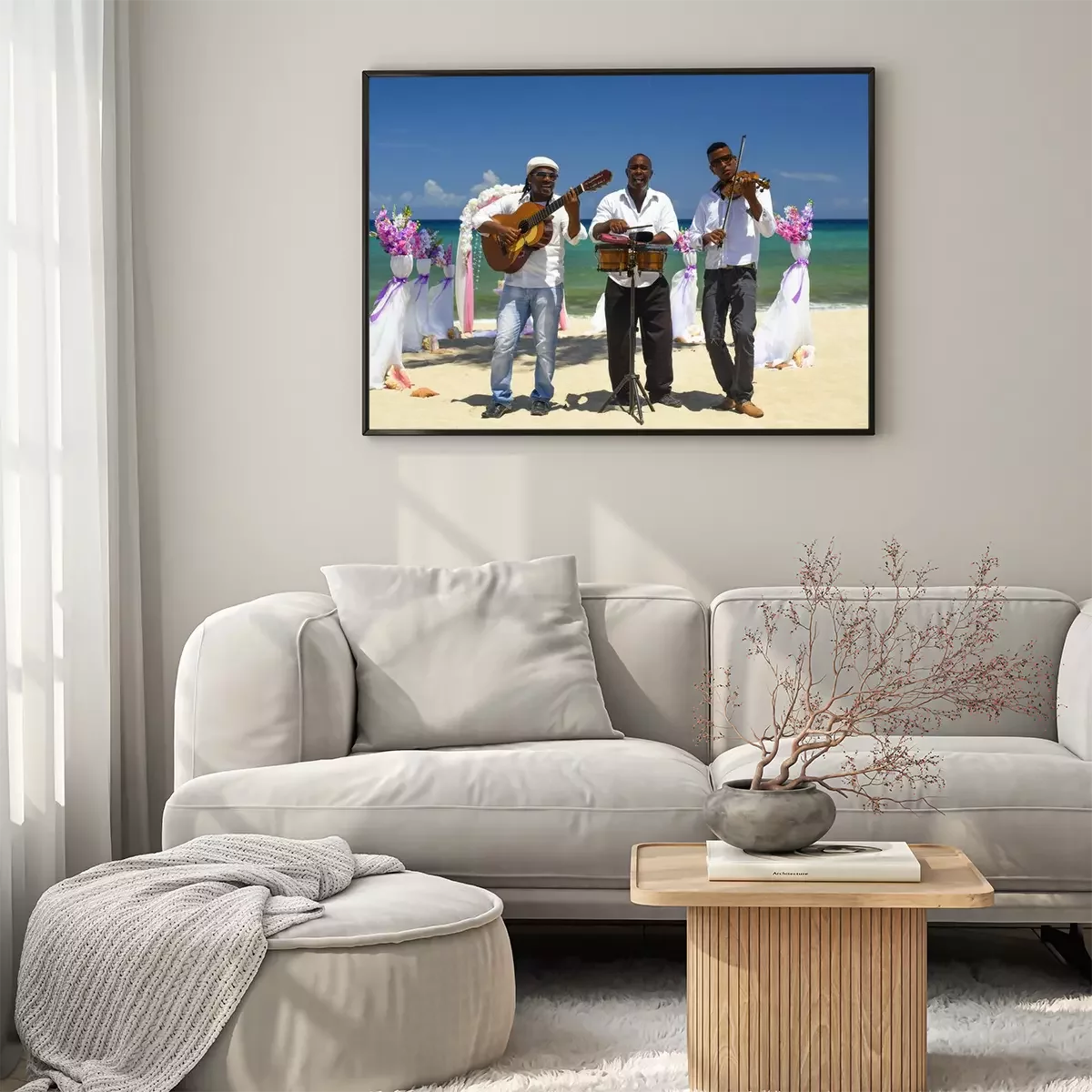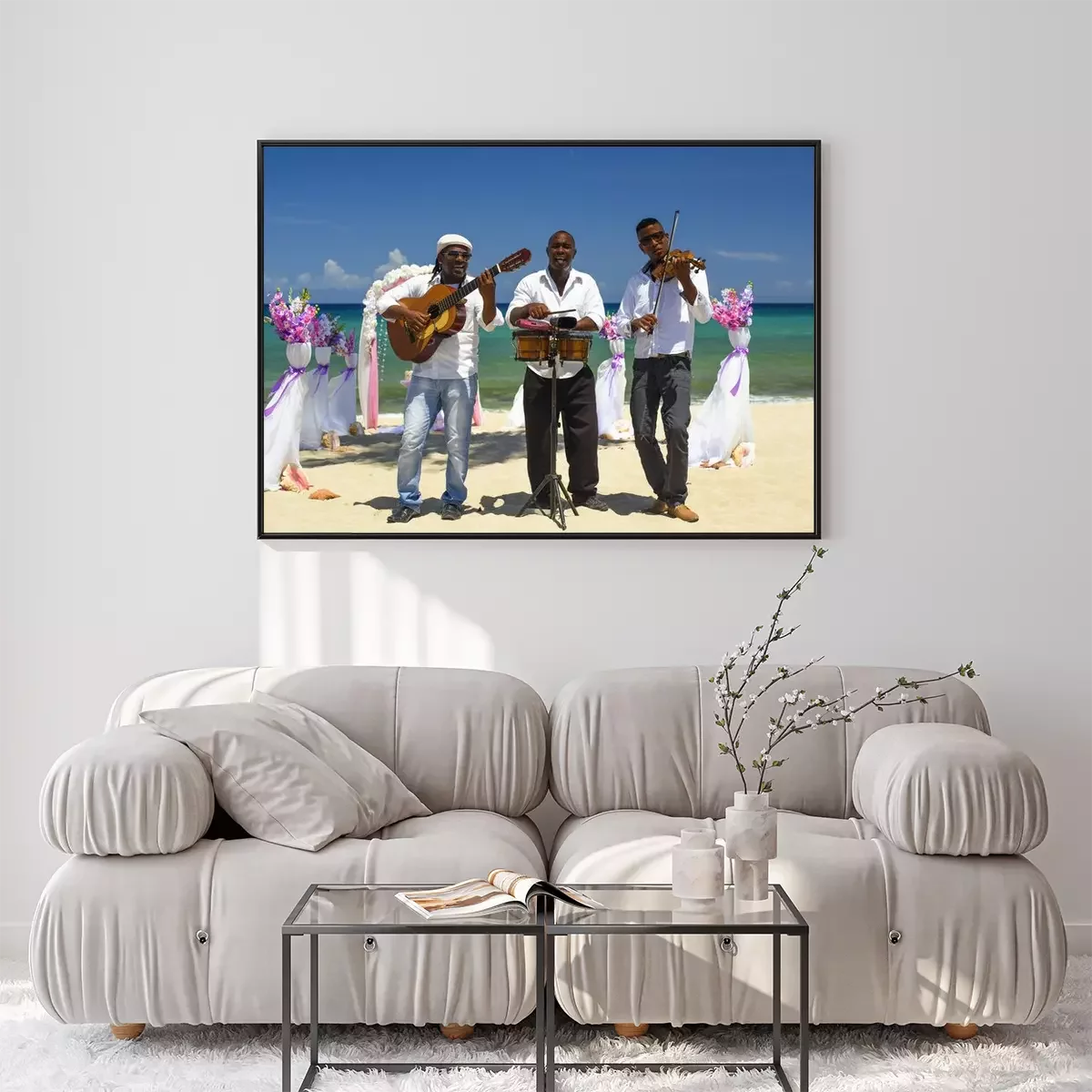 Poster : Fiddler, guitariste et batteur en chemise blanche et chapeau gris jouent des instruments de musique sur la plage