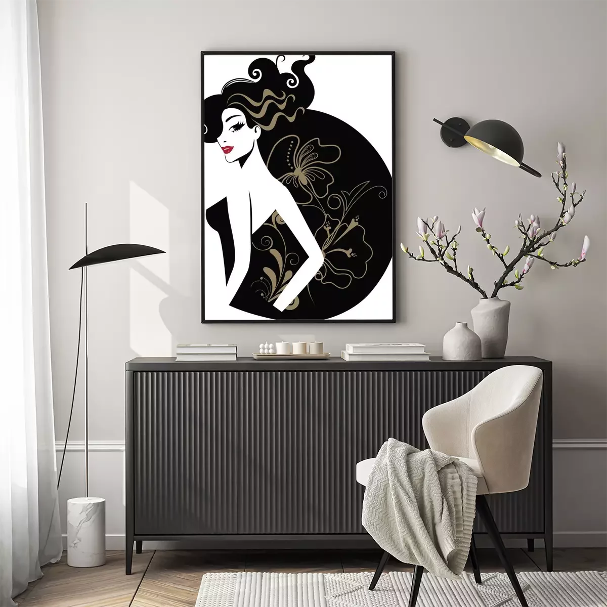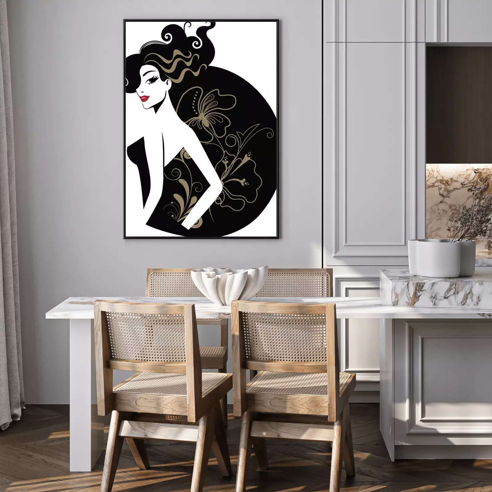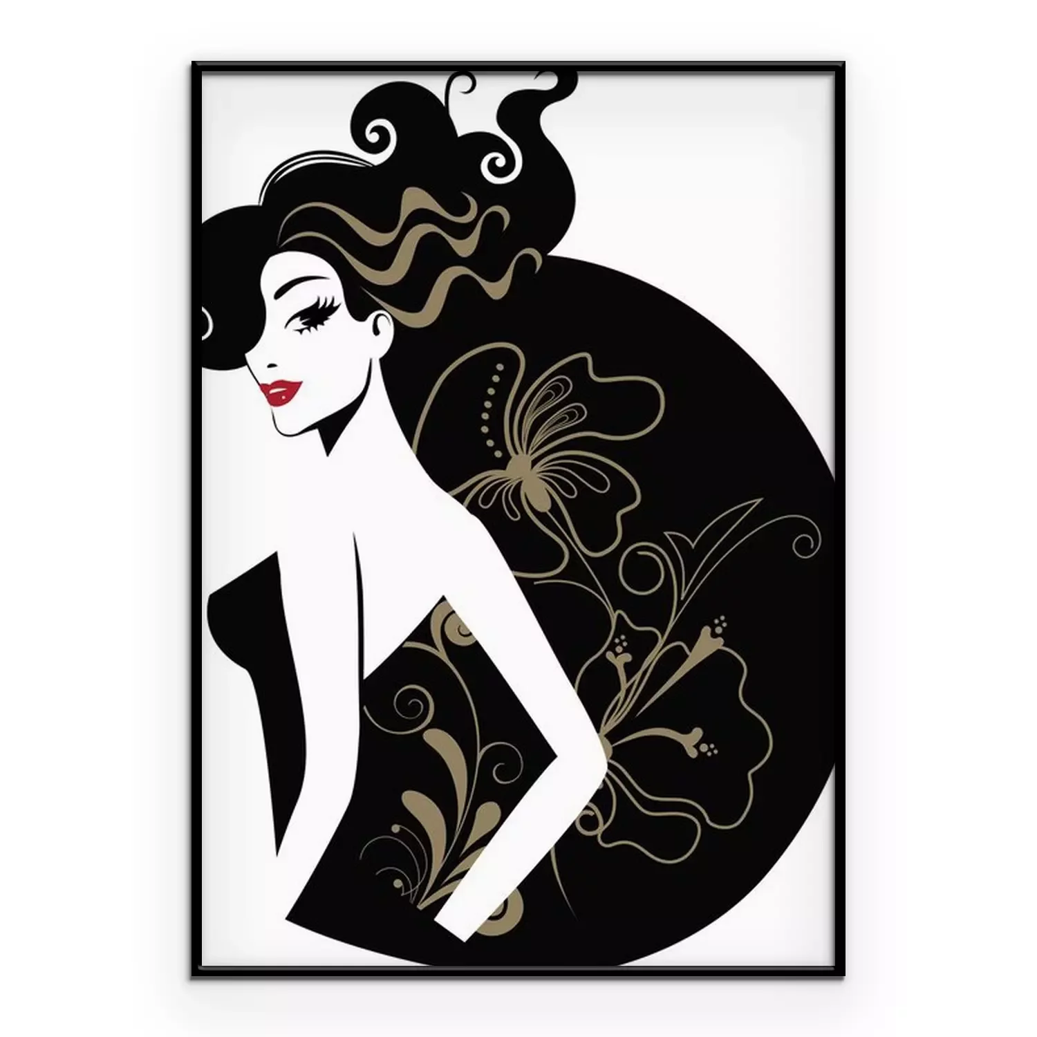 Poster : Figure d'une femme aux lèvres rouges sur fond d'un motif floral