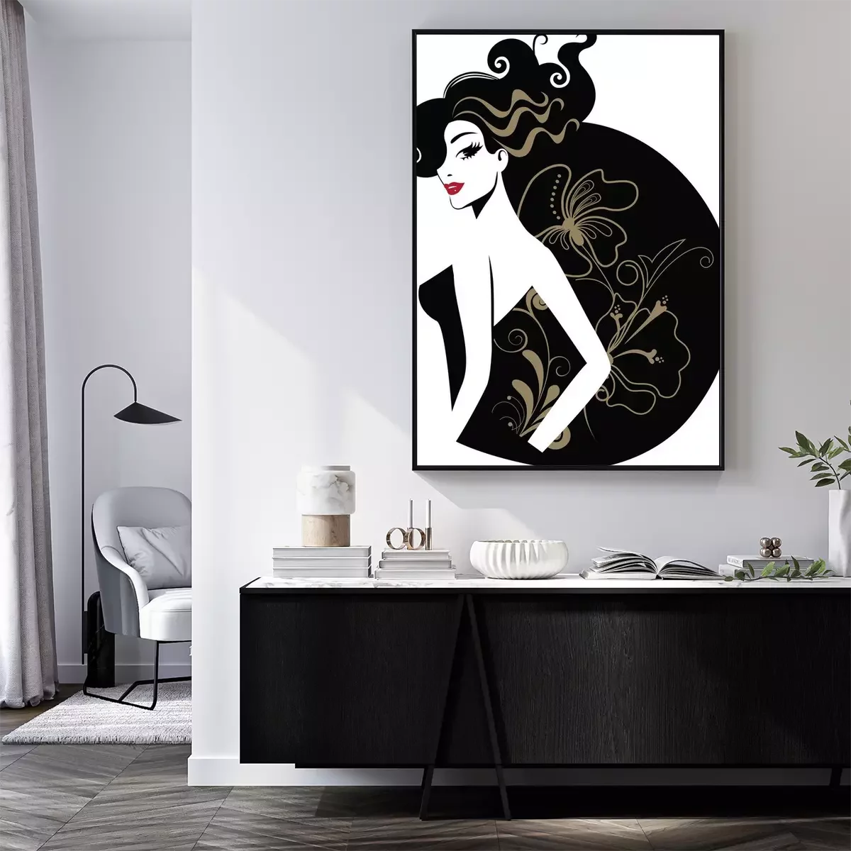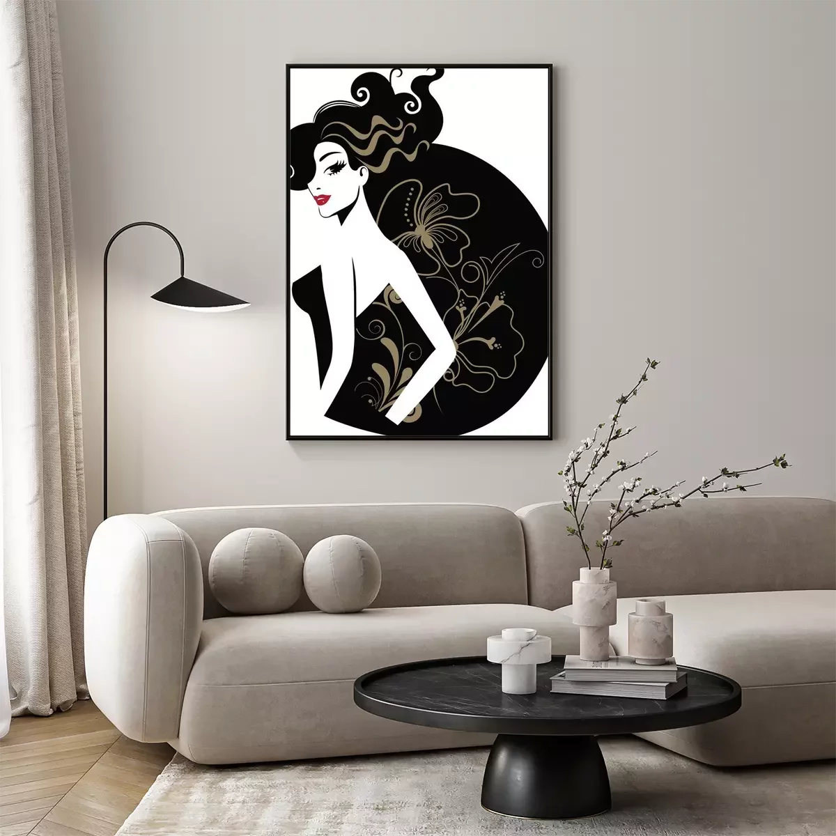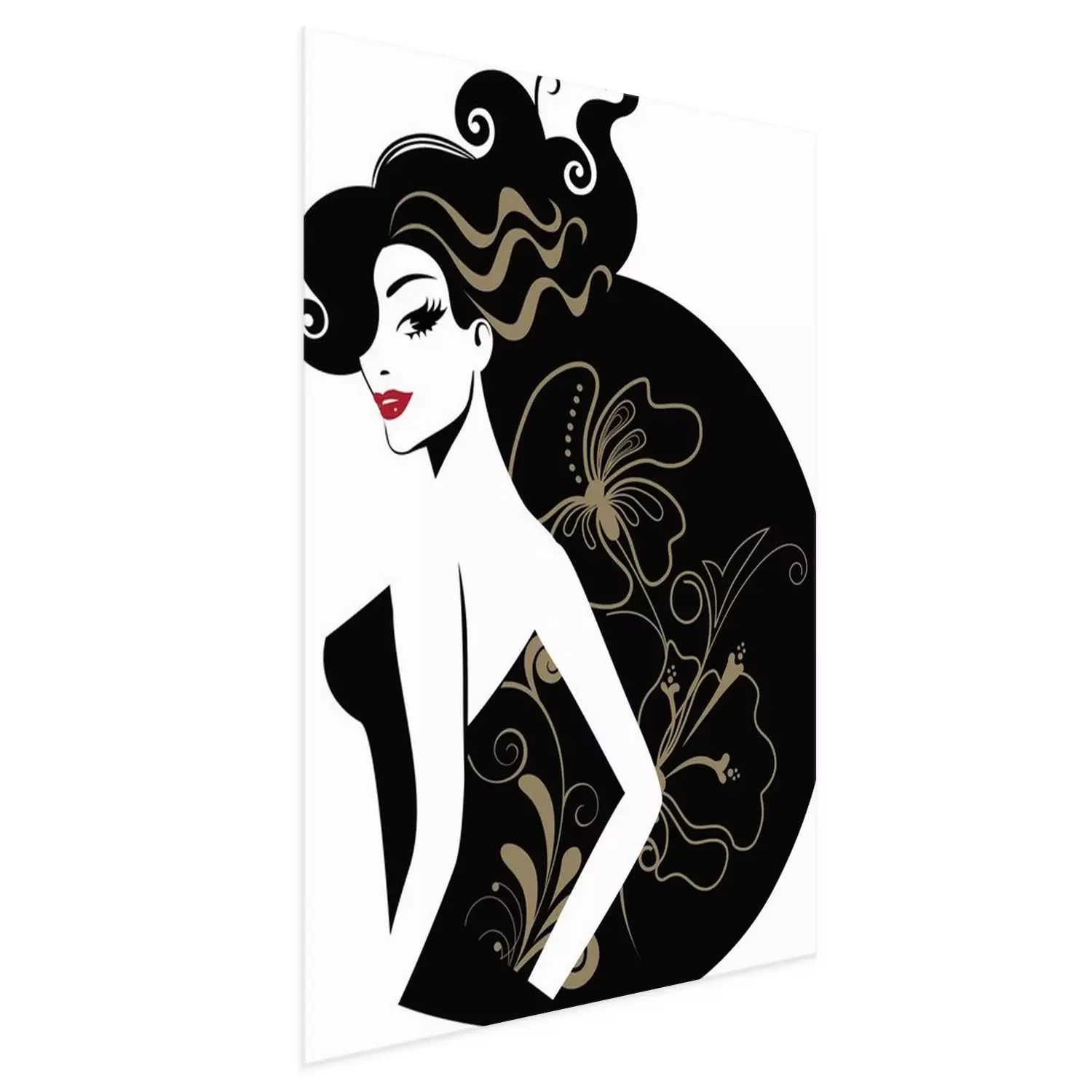 Poster : Figure d'une femme aux lèvres rouges sur fond d'un motif floral
